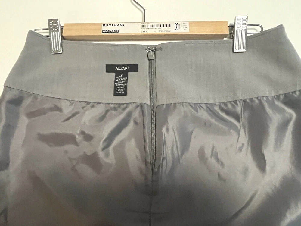 Alfani Women’s Gray Pencil Career Skirt Back zipper and slit / fully lined Size 2 Waist 32" length 21" Elevate your wardrobe with this stylish Alfani pencil skirt in a chic shade of gray. The skirt features a convenient back zipper and a knee-length cut that flatters any body type. With its solid pattern and straight, pencil style, this skirt is perfect for any occasion and can easily be dressed up or down. Crafted from a blend of polyester, spandex, and rayon, this skirt offers comfort and durability. Its sleek design is accentuated by the subtle zipper detail, adding a touch of modernity to the classic silhouette. Don't miss out on the opportunity to add this versatile piece to your wardrobe.