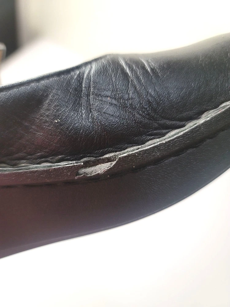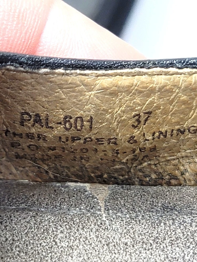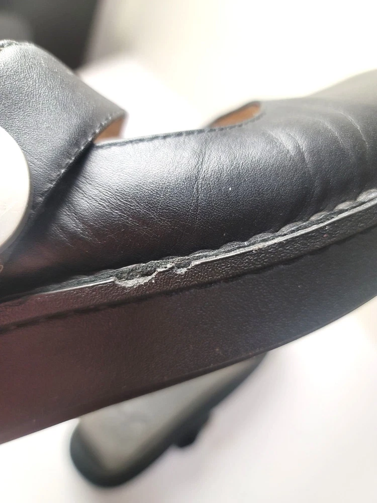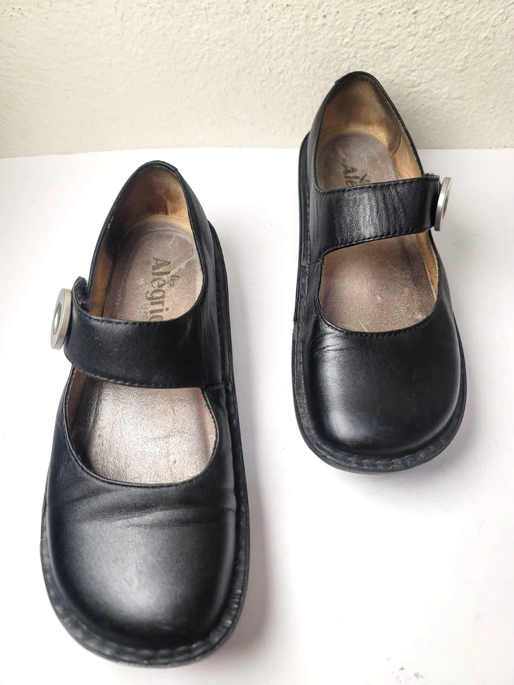 These Algeria Mary Jane shoes offer a timeless design suitable for various professional settings. The black leather construction provides durability and a polished appearance. The shoes feature a comfortable fit, ideal for long hours of wear. • Button closure for secure fit • Sturdy sole design • Round toe shape • Embossed butterfly logo on sides Top to bottom = 9.5 inches CONDITIONS pre owned, minor wear and scuffs on the side, good conditions. see photos for flaws details.