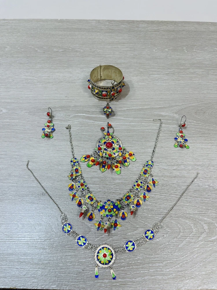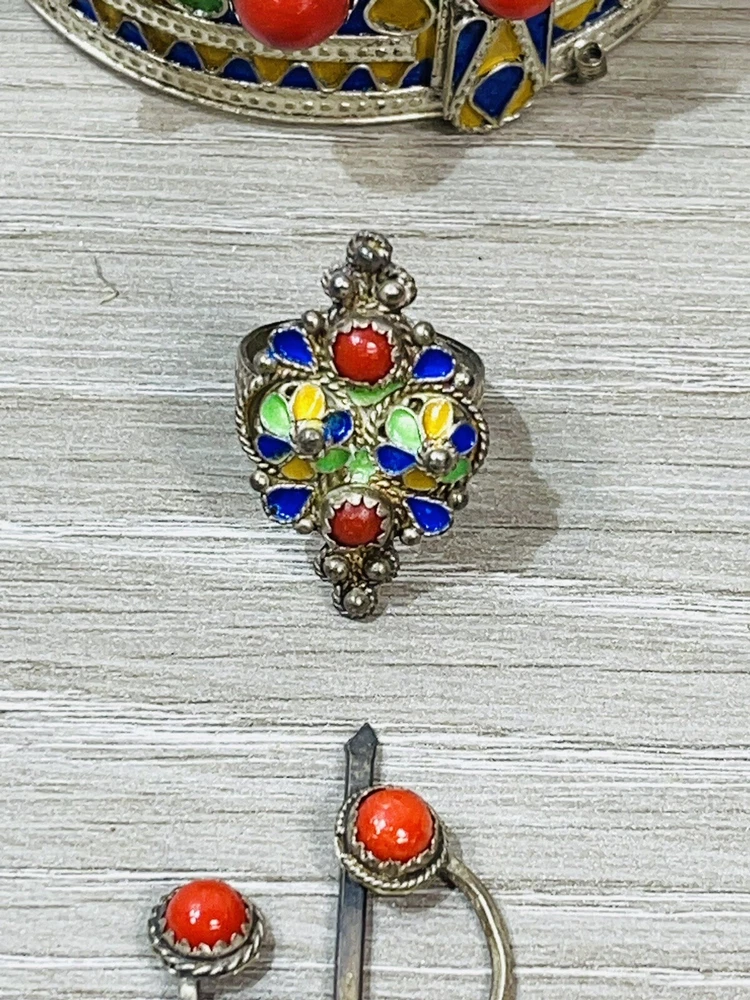 The six piece Algerian Berber Kabyle Sterling Silver Enamel Necklaces, Ring Bracelet, ear rings and Brooch Set Are all in very good condition they do show some signs of age and wear. And have been left unpolished to retain their natural patina.. the bracelet has an internal diameter of 2 1/2 inches, with an external measurement of 8 1/4 inches around. The earrings measure 2 1/2 inches long. both necklaces measure 16 inches long, with what I believe is a brooch or pendant, I’m not sure as it doesn’t have a typical fastener , it has a pointy end. It measures 4 1/2 inches by about 3 inches. The ring is a size 6 1/2.