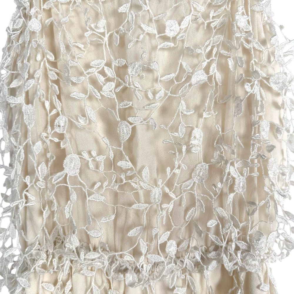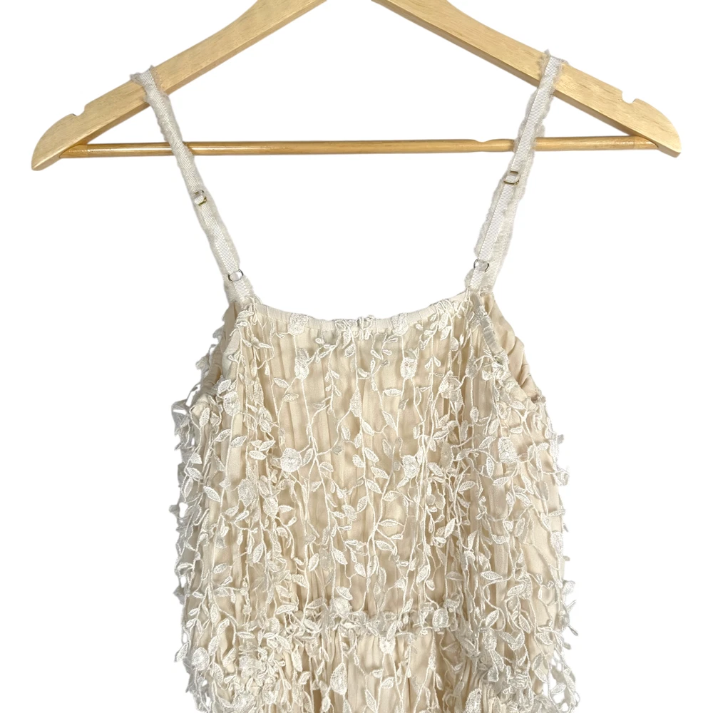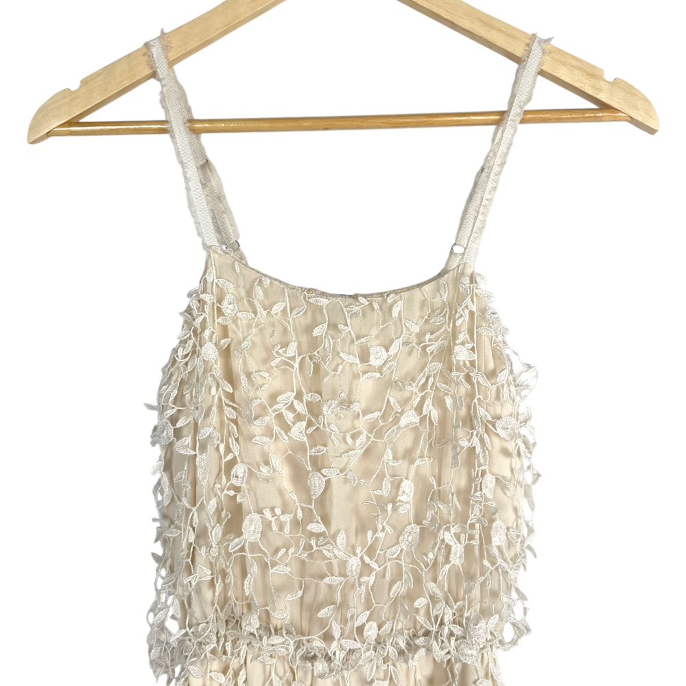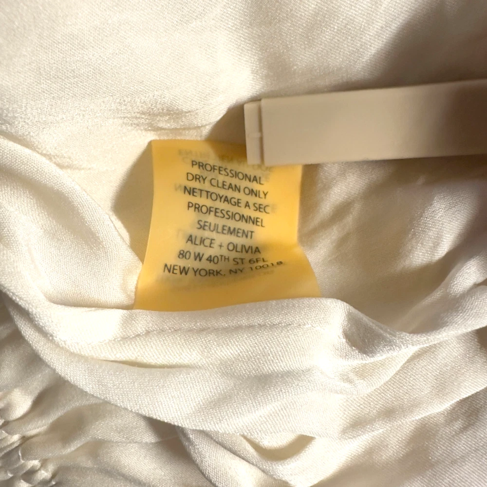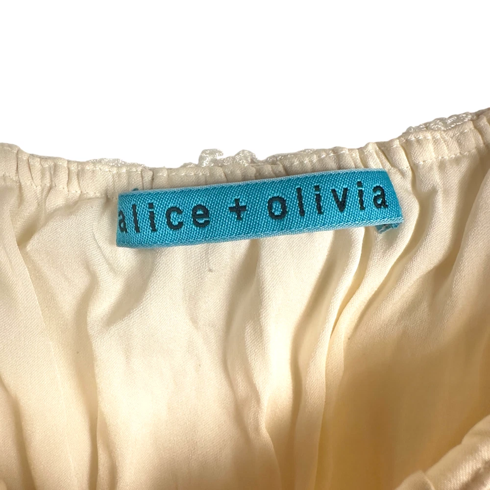 Romantic and ethereal, this delicate embroidered camisole from Alice + Olivia features intricate lace embroidery layered over a soft silk-lined base. The airy babydoll silhouette creates beautiful movement while the dimensional floral embroidery adds texture and depth. Designed with adjustable straps and a softly gathered waist, this piece drapes effortlessly and captures the whimsical aesthetic of fairycore and romantic vintage-inspired fashion. The neutral ivory tone makes it easy to style for festival outfits, summer layering, or elevated bohemian looks. The interior silk lining gives the top a luxurious feel while maintaining a lightweight, breathable structure. Features and Details • Brand: Alice + Olivia • Style: Babydoll camisole tank • Color: Ivory / cream • Embroidered lace overlay • Adjustable spaghetti straps • Empire waist / babydoll silhouette • Textured dimensional embroidery • Shell: 100% rayon • Interlining: 100% silk • Lining: 92% silk, 8% spandex • Dry clean only Measurements (Flat Lay) Pit to pit: ~14" Waist: ~10.5" Length: ~18.5" Why You'll Love It This piece combines romantic embroidery with a light, airy babydoll silhouette that feels both feminine and effortless. The dimensional lace texture and silk lining elevate the design while the soft ivory color keeps it versatile for layering or statement styling. It’s the kind of delicate top that instantly adds a dreamy, romantic element to an outfit. Styling Ideas Pair with linen trousers and sandals for an effortless bohemian look, style with denim and boots for festival outfits, or layer over a slip skirt for an ethereal romantic ensemble. Please note: We inspect items carefully, but if we missed anything or the fit isn't quite right, we offer easy returns - just message us. Feel free to reach out with any questions about fit, fabric, or condition before purchasing.