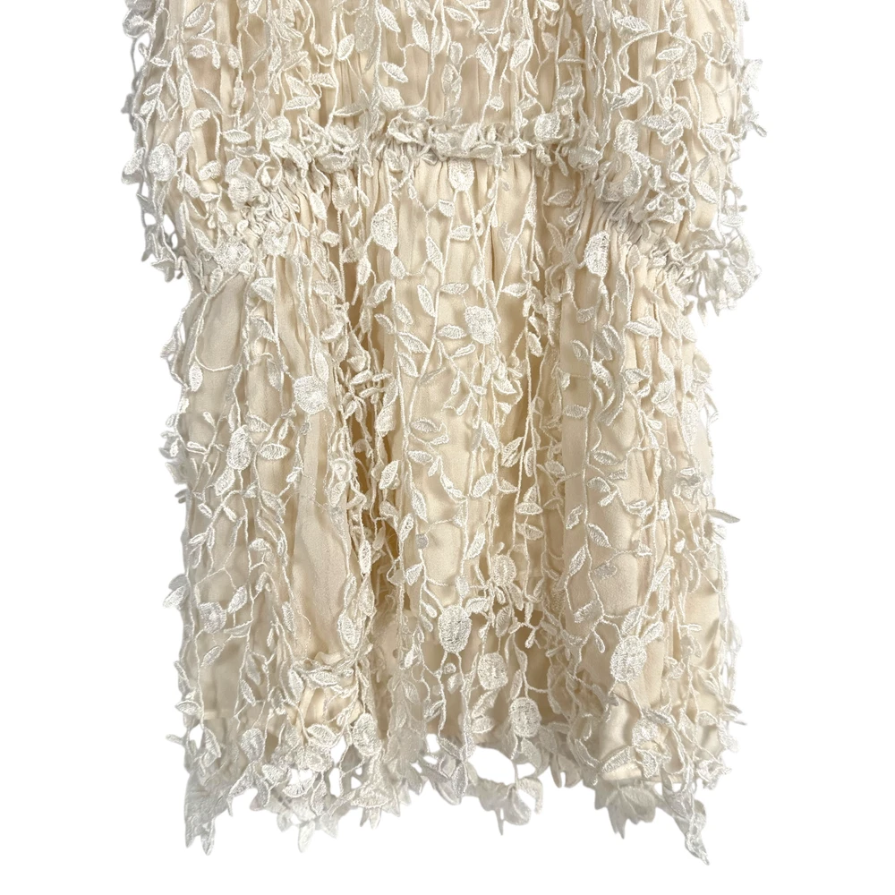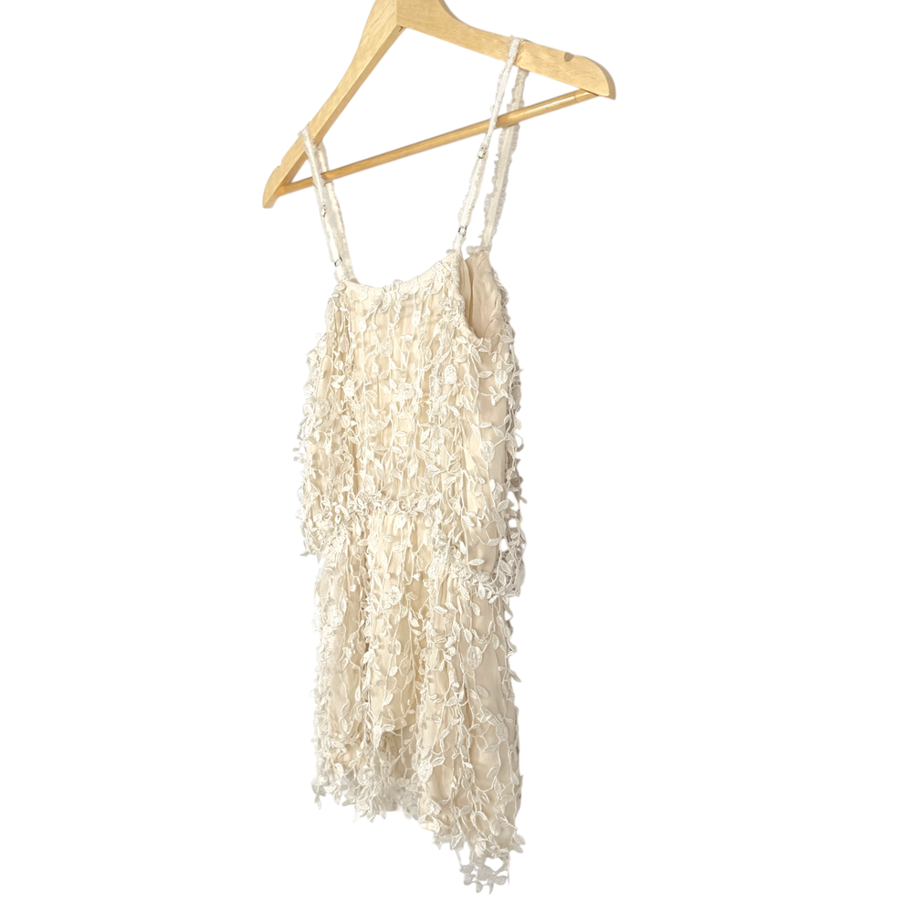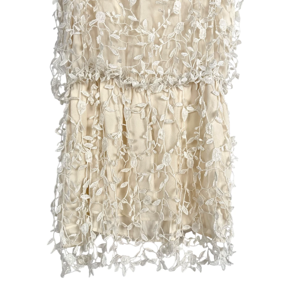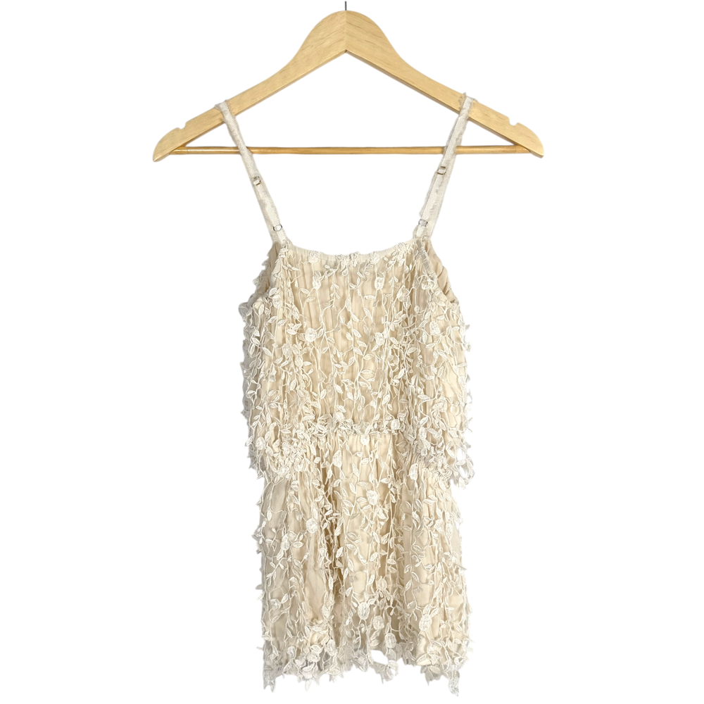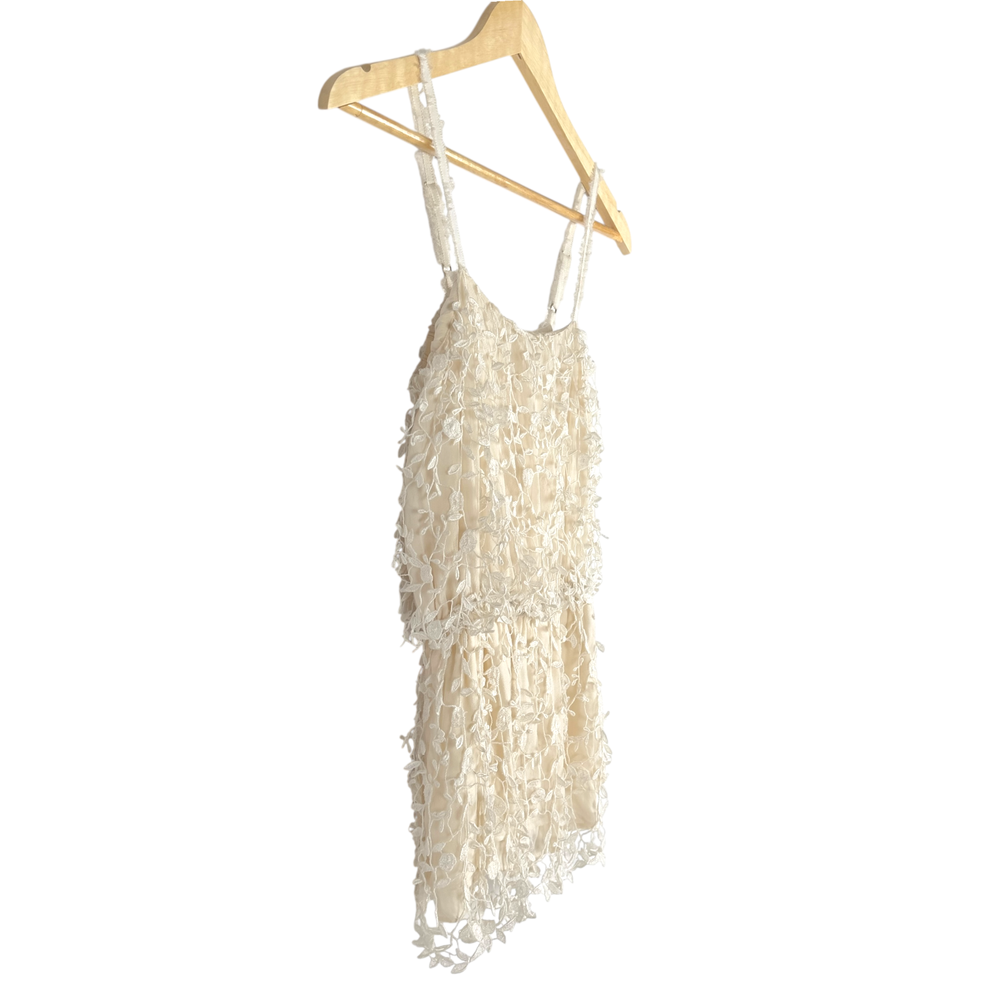 Romantic and ethereal, this delicate embroidered camisole from Alice + Olivia features intricate lace embroidery layered over a soft silk-lined base. The airy babydoll silhouette creates beautiful movement while the dimensional floral embroidery adds texture and depth. Designed with adjustable straps and a softly gathered waist, this piece drapes effortlessly and captures the whimsical aesthetic of fairycore and romantic vintage-inspired fashion. The neutral ivory tone makes it easy to style for festival outfits, summer layering, or elevated bohemian looks. The interior silk lining gives the top a luxurious feel while maintaining a lightweight, breathable structure. Features and Details • Brand: Alice + Olivia • Style: Babydoll camisole tank • Color: Ivory / cream • Embroidered lace overlay • Adjustable spaghetti straps • Empire waist / babydoll silhouette • Textured dimensional embroidery • Shell: 100% rayon • Interlining: 100% silk • Lining: 92% silk, 8% spandex • Dry clean only Measurements (Flat Lay) Pit to pit: ~14" Waist: ~10.5" Length: ~18.5" Why You'll Love It This piece combines romantic embroidery with a light, airy babydoll silhouette that feels both feminine and effortless. The dimensional lace texture and silk lining elevate the design while the soft ivory color keeps it versatile for layering or statement styling. It’s the kind of delicate top that instantly adds a dreamy, romantic element to an outfit. Styling Ideas Pair with linen trousers and sandals for an effortless bohemian look, style with denim and boots for festival outfits, or layer over a slip skirt for an ethereal romantic ensemble. Please note: We inspect items carefully, but if we missed anything or the fit isn't quite right, we offer easy returns - just message us. Feel free to reach out with any questions about fit, fabric, or condition before purchasing.