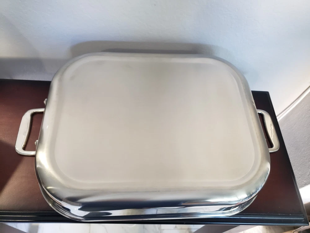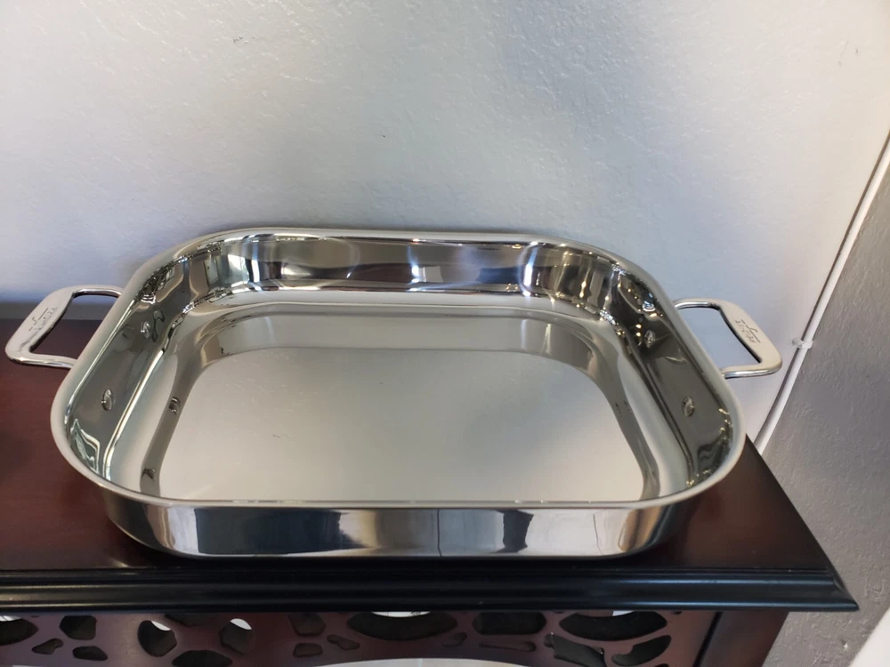 This beautiful All-Clad 18/10 stainless-steel lasagna pan comes with two red oven mitts, making it a perfect addition to your cookware collection. The pan is compatible with both electric and gas stoves and features a durable design that ensures long-lasting use. The red color adds a touch of elegance to your kitchen and the brand's reputation for quality ensures that you are getting a high-quality product. The pan is ideal for making lasagna and other pasta dishes, thanks to its unique design. It is easy to use and clean, making it a great choice for busy home cooks. Whether you are a professional chef or a home cook, this All-Clad lasagna pan is a must-have.