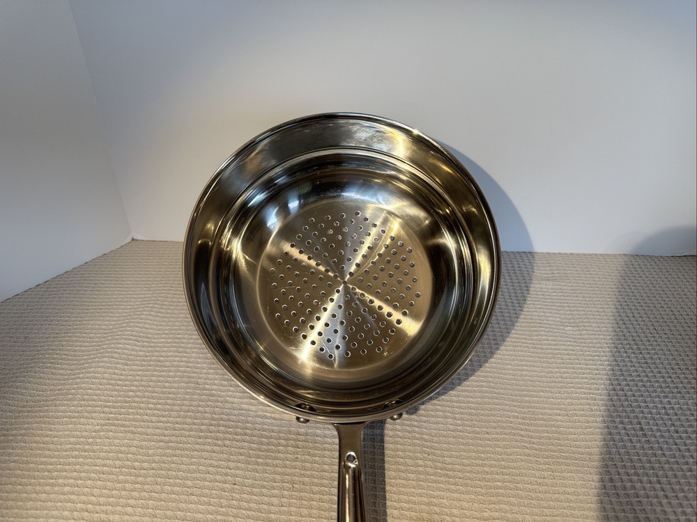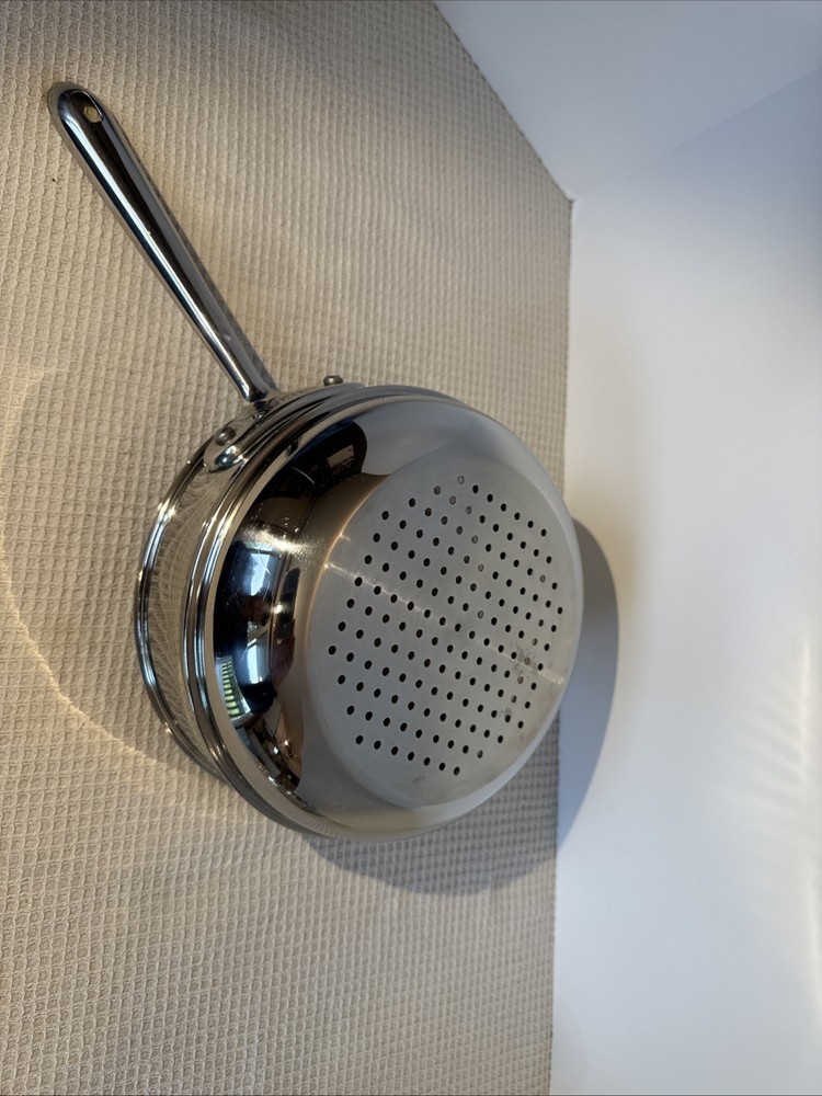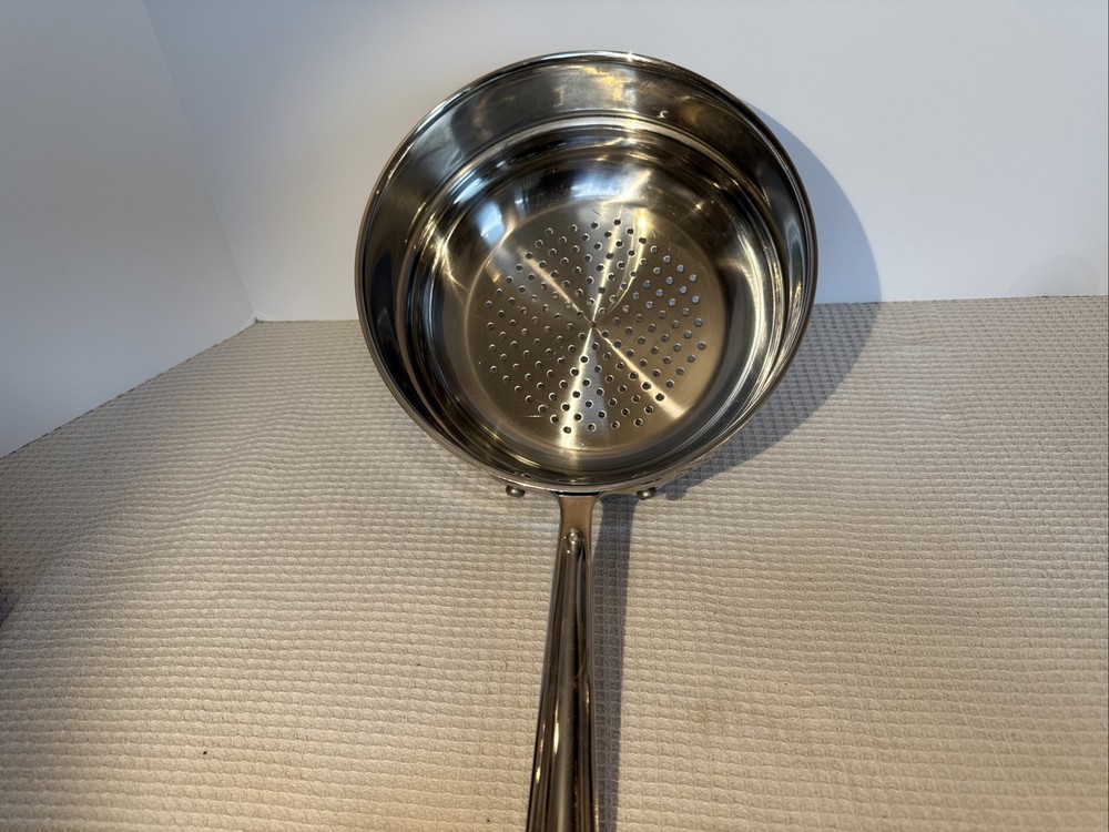 The steamer strainer insert is an excellent rarely used condition. It’s super shiny no scratches, dance or signs of misuse or abuse. The All-Clad Stainless Steel 8” Steamer Basket Strainer Insert is a high-quality kitchen accessory perfect for steaming vegetables or seafood. Made of shiny stainless steel, this round basket features a long handle for easy lifting and a super shiny silver color. Compatible with electric and gas stoves, this one-piece set includes a steamer basket that is 8 inches in diameter and compatible with all clad 8 inch pans. The durable stainless steel construction ensures even heat distribution and makes it a versatile and reliable addition to any kitchen.