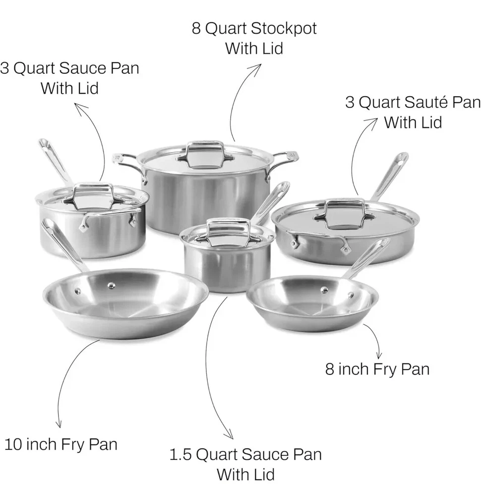Brand New, never opened 10-piece All-Clad D5 Stainless Steel cookware set. This is the kind of cookware you buy once and have for life. D5 is All-Clad's high end cookware, with a 5-ply construction--much higher end than the D3 line. It has All-Clad's lifetime guarantee behind it, and it is made in the USA. I purchased from Macy's and no longer need it, so you get a deal on it. It's never been opened or used. Still in the original box. Brand new! Free shipping to the continental USA. The list price for this set is $1,430. Complete 10 piece set includes 8 inch and 10 inch Fry Pans, 1.5 quart and 3 quart Sauce Pans with lids, 3 quart Sauté Pan with lid, and an 8 quart Stockpot with lid. Exceptionally Even Heat - D5 is fully bonded to the rim, the unique five-ply construction is patented and delivers the ultimate even heating and warp resistance. High quality 18/10 stainless steel surface sears to perfection and is ideal for deglazing. Design You Will Love - D5 has an elegant brushed stainless steel finish with flared edges for drip-free pouring. Our oversized, double riveted stainless steel handles ensure a secure grip. Built to Last - Trusted by generations of chefs and backed by All-Clad's Limited Lifetime Warranty. Our cookware is oven & broiler safe up to 600°F and compatible with any stovetop, including induction. Bonded, Engineered, & Assembled in Canonsburg, PA - USA Since 1971.