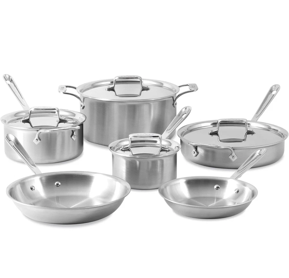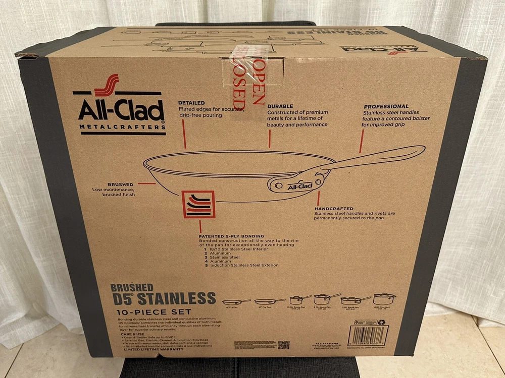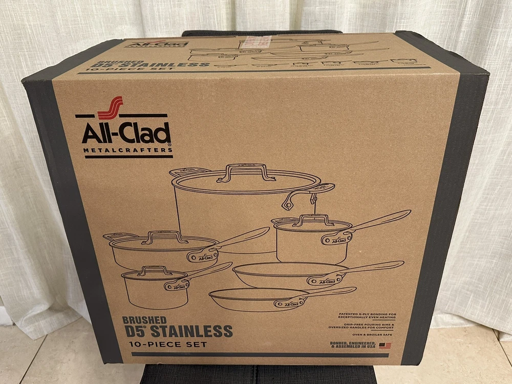 Brand new, Sealed in Box, Free Shipping Elevate your cooking game with this impressive 10-piece cookware set from All-Clad. Crafted from durable and stylish brushed stainless steel, this set includes a variety of pans and skillets suitable for induction, electric, and gas stoves. The silver color adds a touch of elegance to any kitchen decor. Designed for the serious cook, this set is perfect for those who demand high-quality performance and lasting durability. Made in the United States, this All-Clad D5 5-ply cookware set is a must-have for any home cook or professional chef. Surface coating is made of stainless steel for easy cleaning and long-lasting use.
