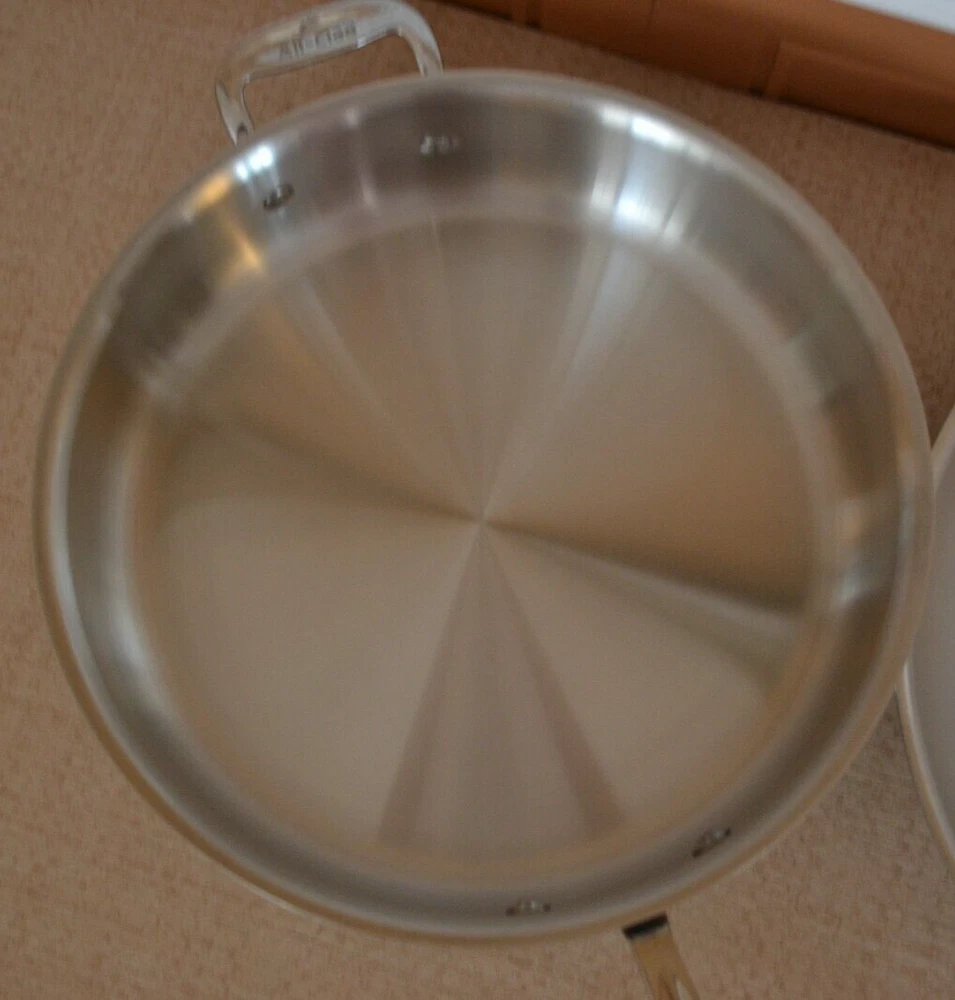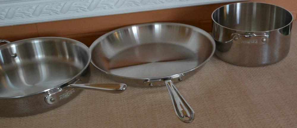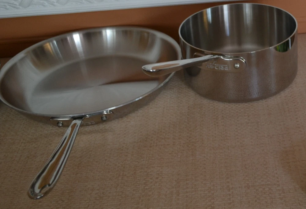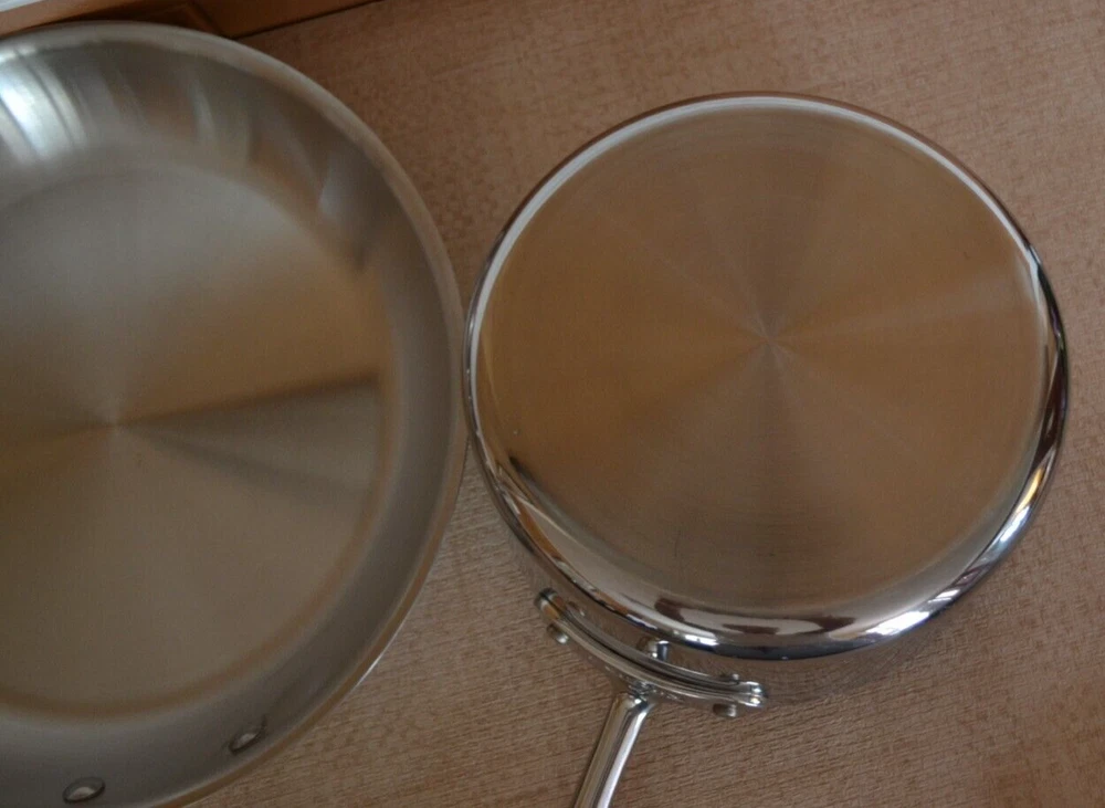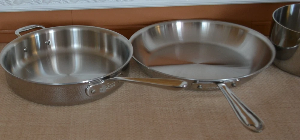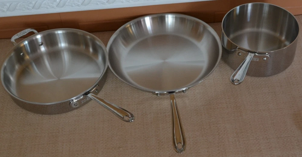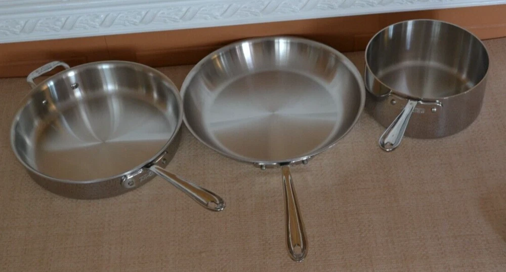 Vintage ALL-CLAD Tri-Ply 3Qt. Saucepan, 3Qt. Sautepan, 12'' Frypan No Lids. Used, lines on the inside and outside sides......check-pics 3qt.Saucepan -- approx. dim. 8'' across at the top and approx. 3.75 high. Handle 8.5'' long ---- No Lid 3qt.Sautepan -- approx. dim.11.25'' across at the top. and approx. 2.5'' high. Handle 8'' long---- No Lid 12'' Frypan -- scratches on the inside and a bubble at the back of pan..... see Pics Item will be well pack in a brown shipping box.