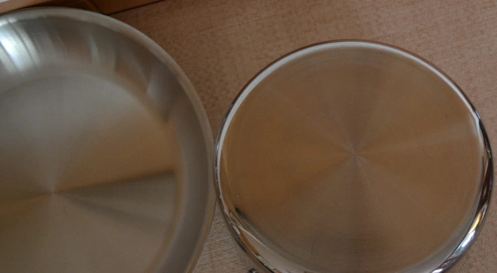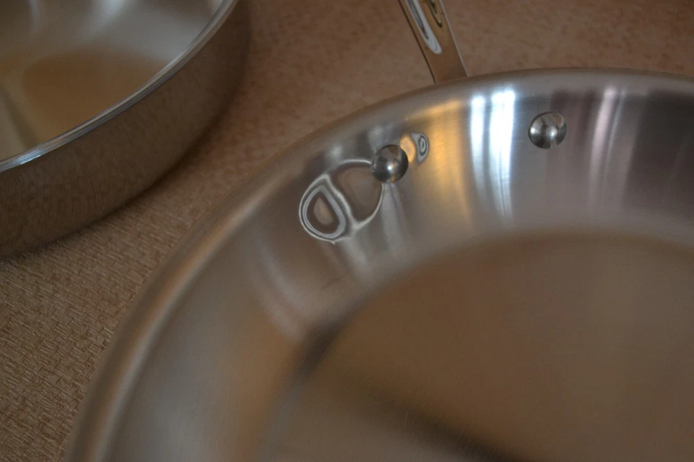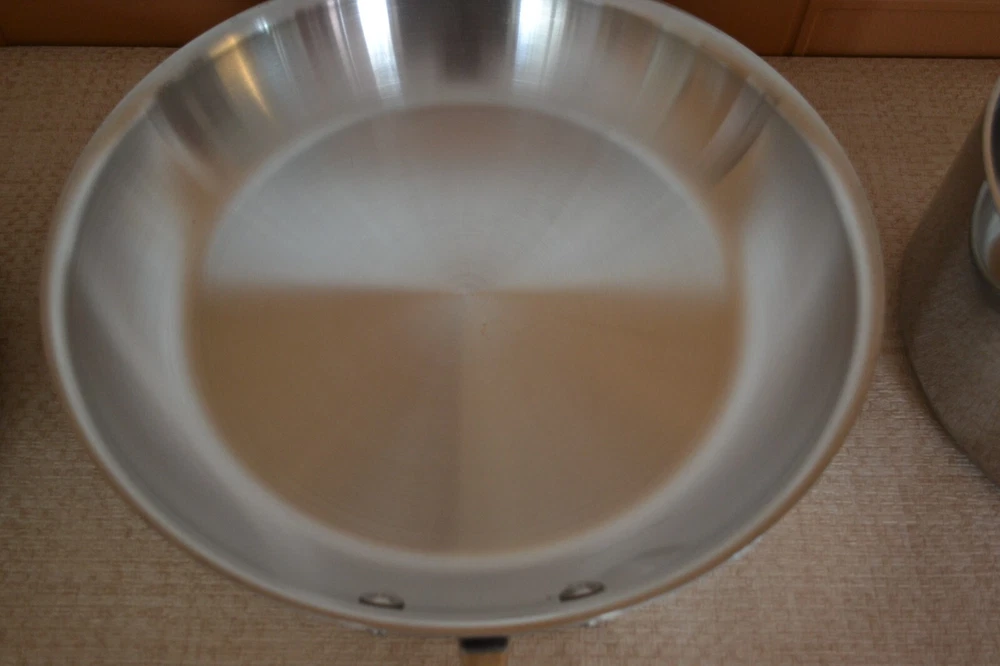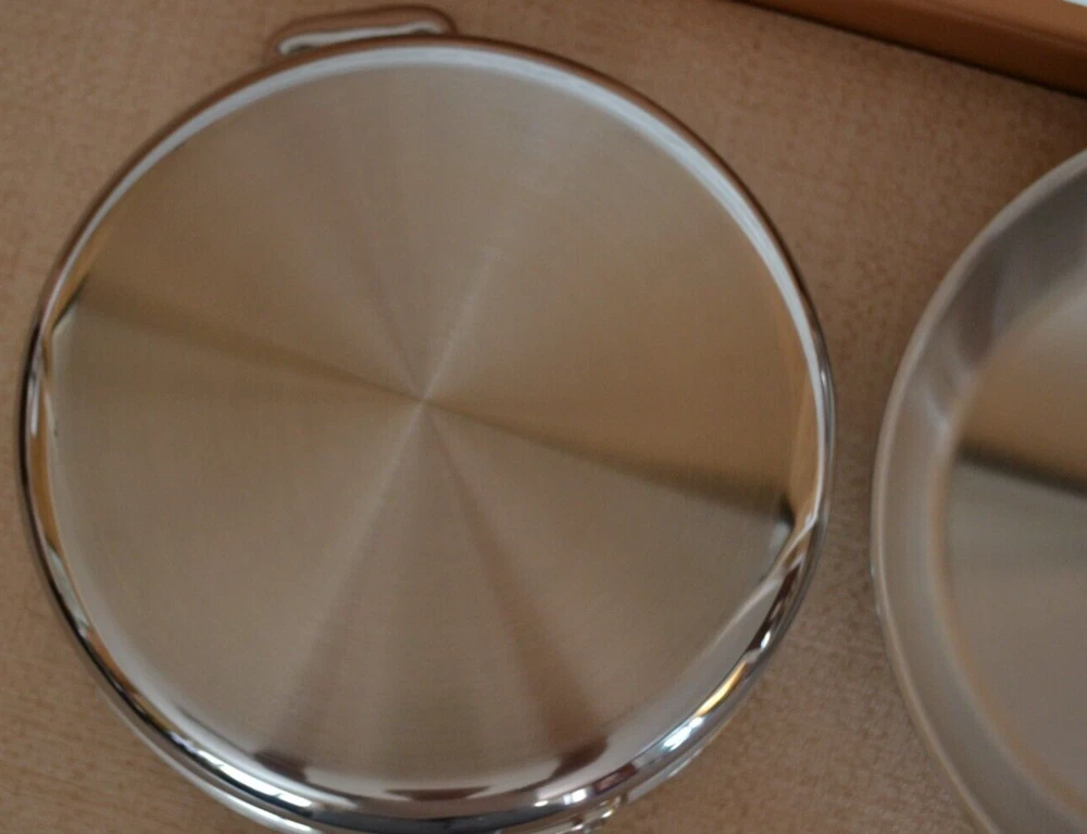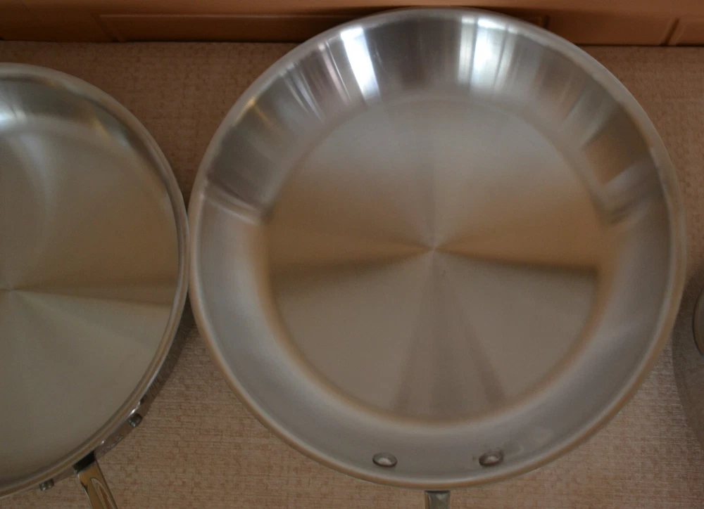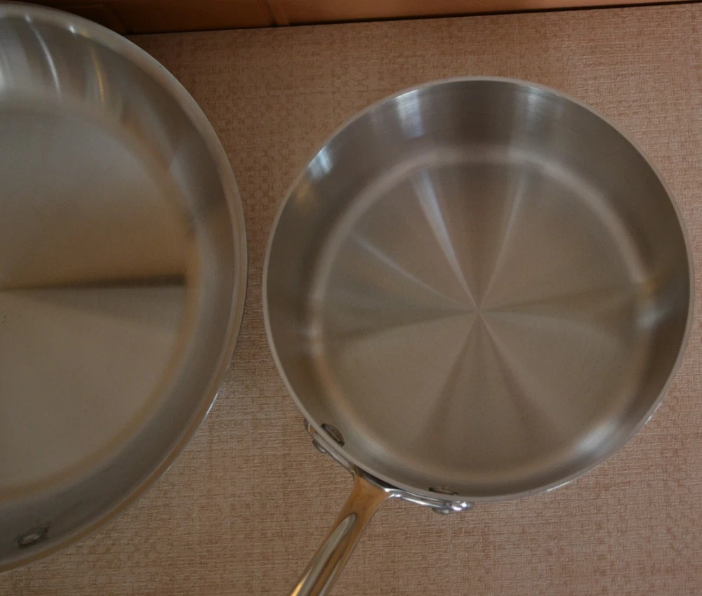 Vintage ALL-CLAD Tri-Ply 3Qt. Saucepan, 3Qt. Sautepan, 12'' Frypan No Lids. Used, lines on the inside and outside sides......check-pics 3qt.Saucepan -- approx. dim. 8'' across at the top and approx. 3.75 high. Handle 8.5'' long ---- No Lid 3qt.Sautepan -- approx. dim.11.25'' across at the top. and approx. 2.5'' high. Handle 8'' long---- No Lid 12'' Frypan -- scratches on the inside and a bubble at the back of pan..... see Pics Item will be well pack in a brown shipping box.