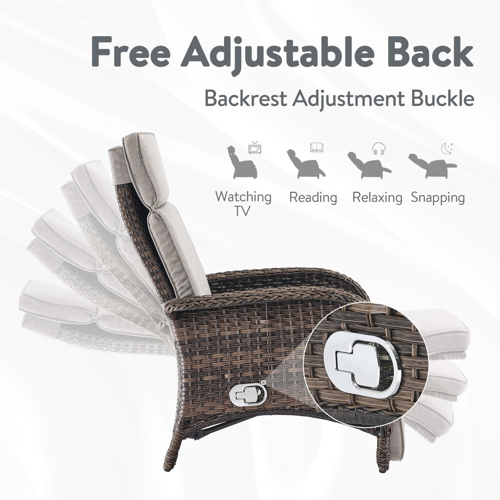 This patio recliner is a game-changer—super versatile with three adjustable positions for ultimate comfort. The all-weather wicker is sturdy yet stylish, and the thick cushions make lounging feel like a dream. Perfect for relaxing outdoors in any season!