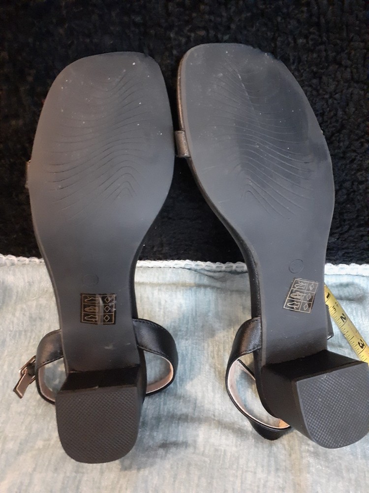 Smoke free home. Worn once. This product is a pair of women's black block heel sandals by Allegra K in size 8.5. They feature an open toe design with an ankle strap closure secured by a buckle. The chunky heel style provides stability and comfort, making them suitable for summer and spring seasons. The upper material is faux leather, giving the sandals an elegant look perfect for various occasions.