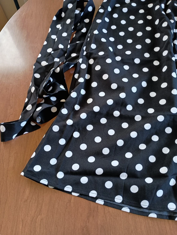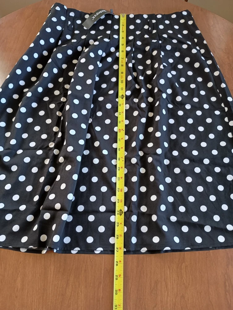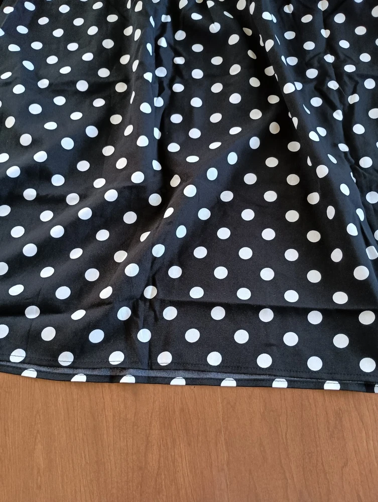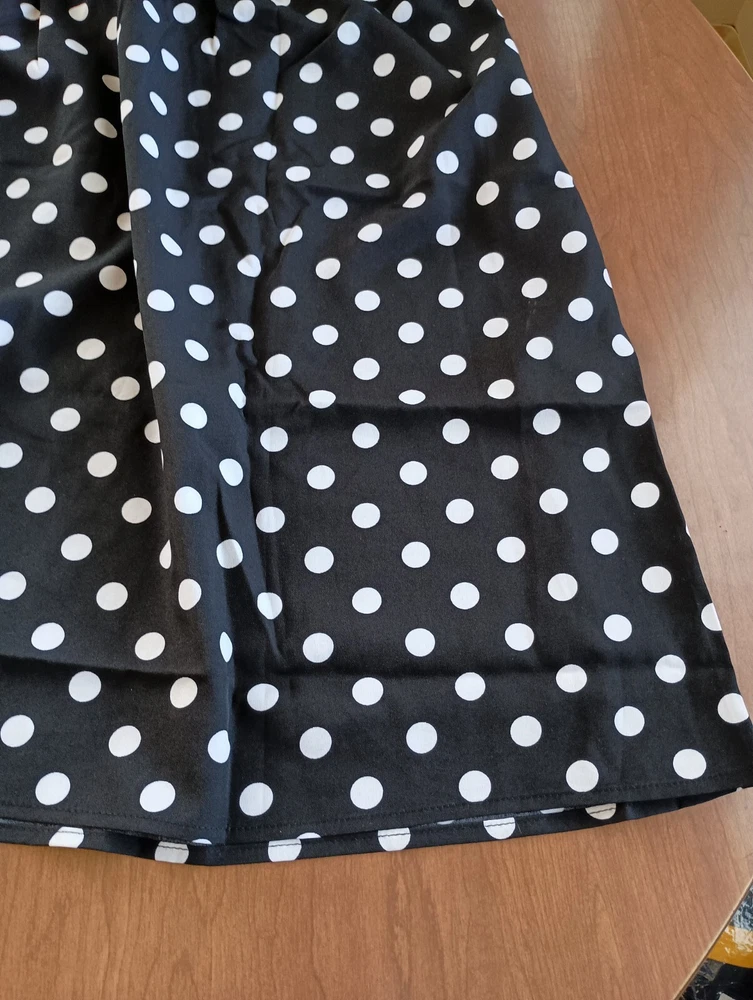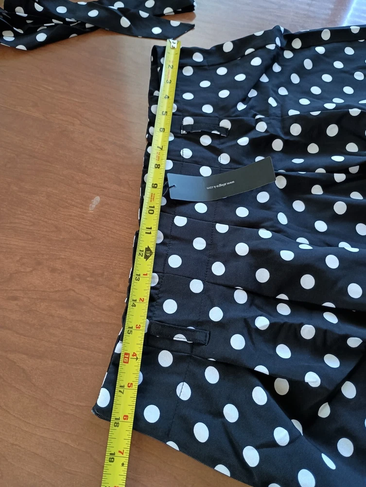 Shell color is black with white Polka Dots. Lining color is black. Size says XL - see photos for exact measurements. Also has secret zipper on one side that zips down about 6inches Shell and lining is 100% Polyester Also comes with Polka dot waist tie belt. This is currently being stored in a smoke/pet friendly home (will be put back in packaging until sold) Please see all photos before purchasing If you have any questions feel free to message me