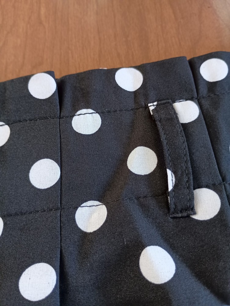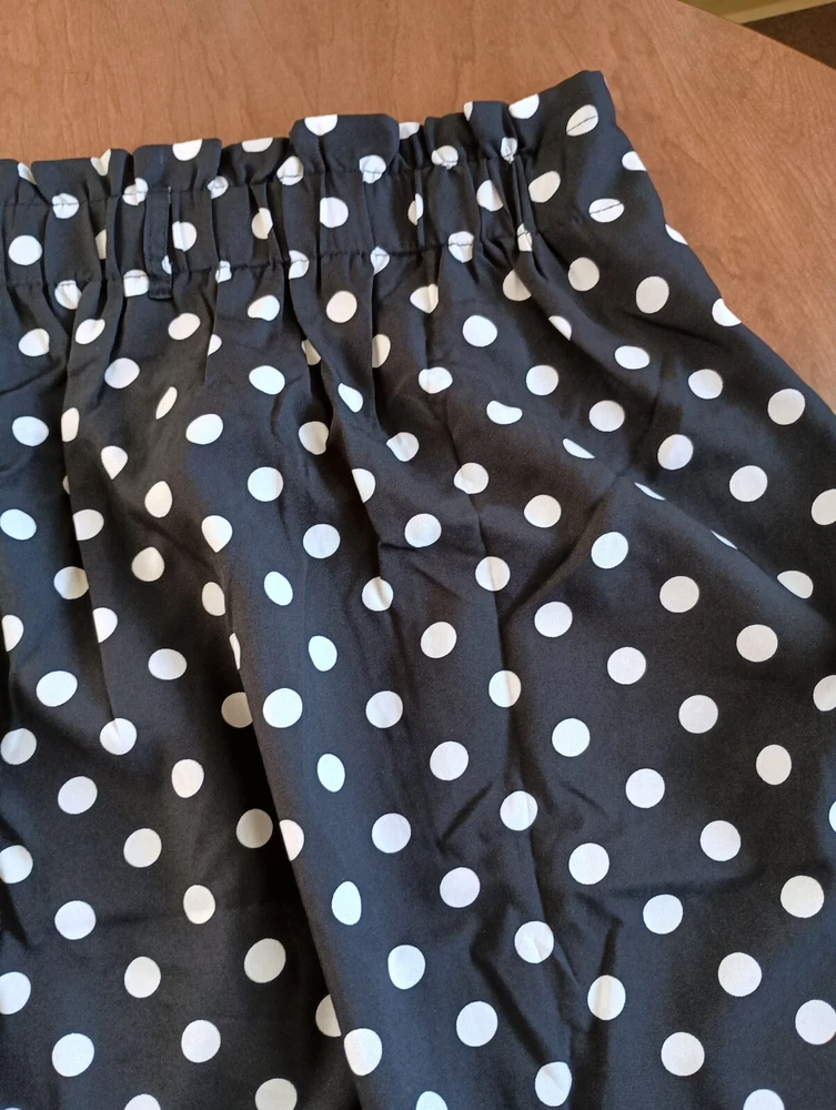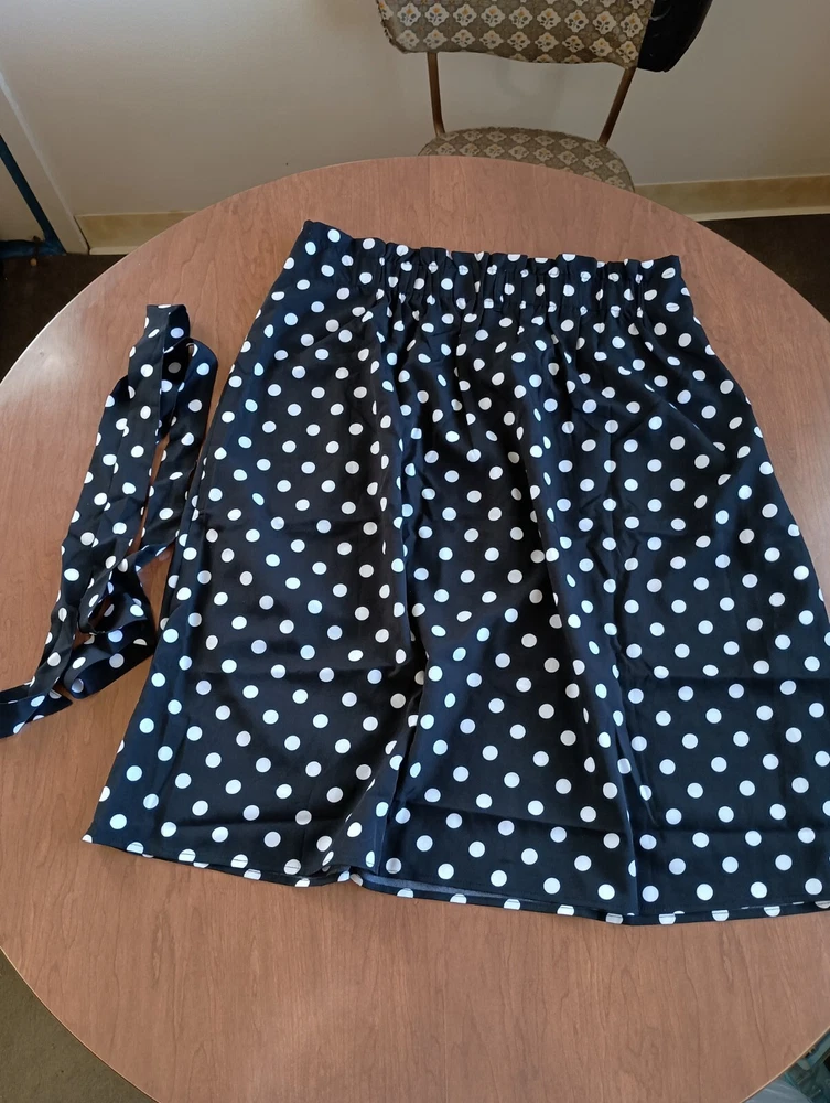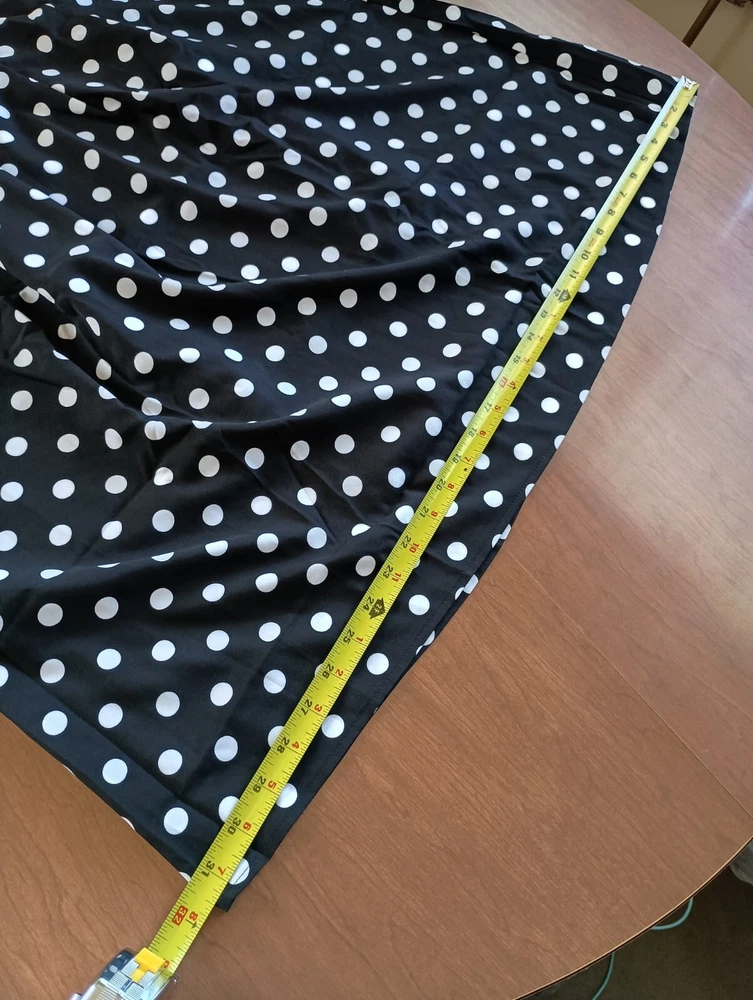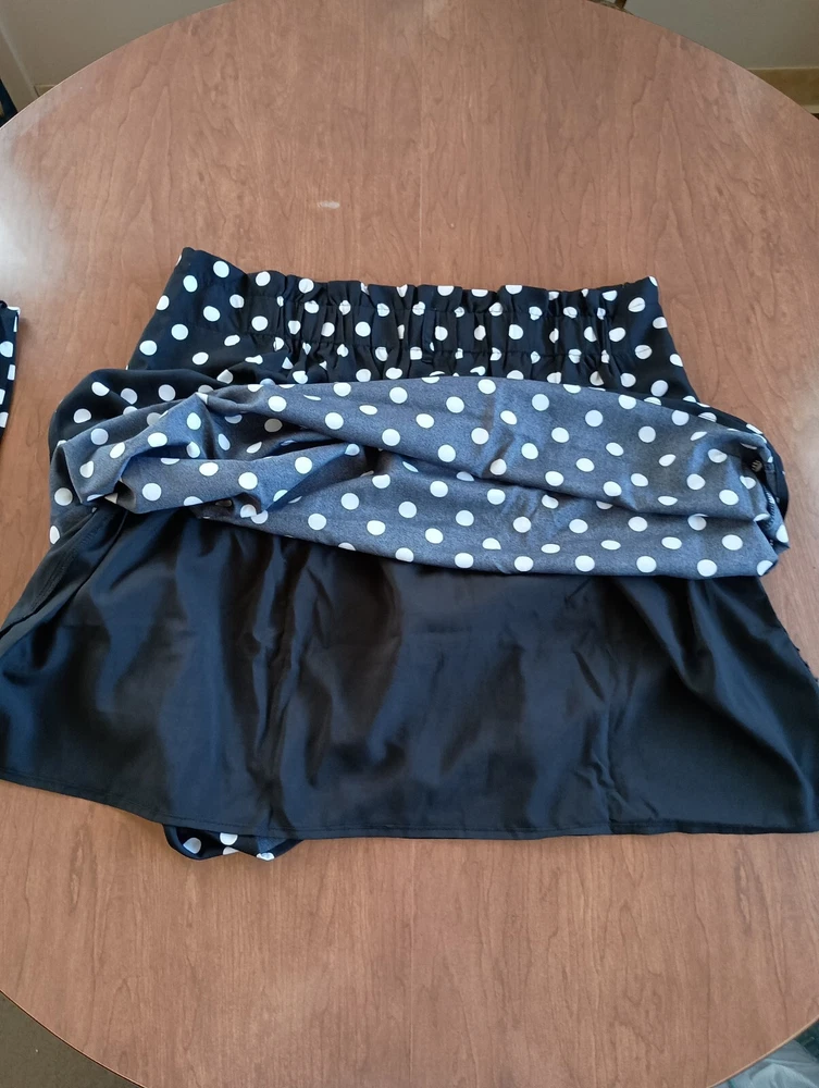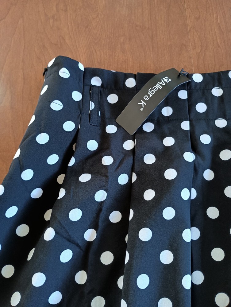 Shell color is black with white Polka Dots. Lining color is black. Size says XL - see photos for exact measurements. Also has secret zipper on one side that zips down about 6inches Shell and lining is 100% Polyester Also comes with Polka dot waist tie belt. This is currently being stored in a smoke/pet friendly home (will be put back in packaging until sold) Please see all photos before purchasing If you have any questions feel free to message me