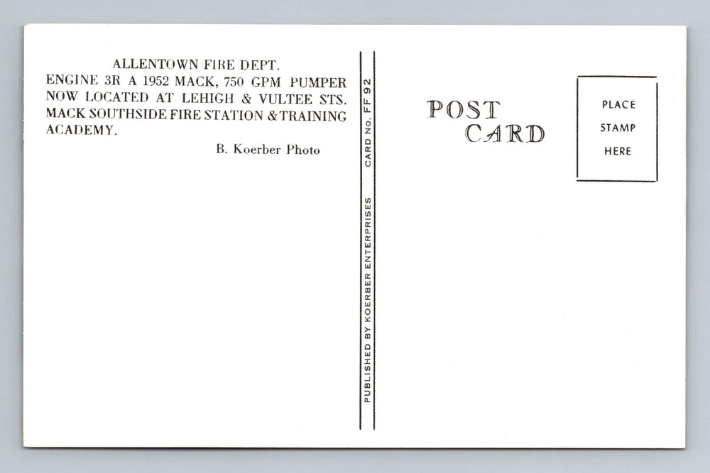 Allentown Fire Department Engine 3R A 1952 Mack, GPM Pumper Vintage Postcard