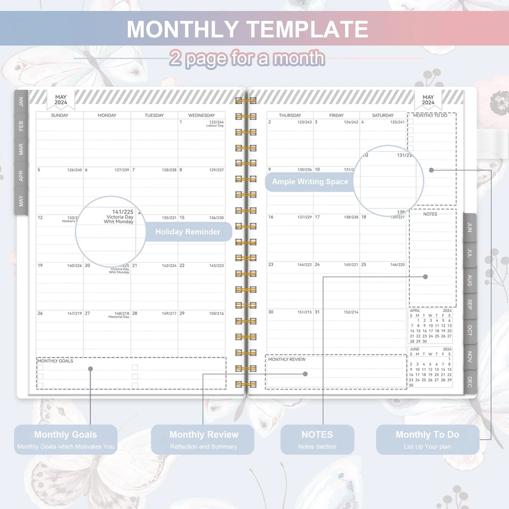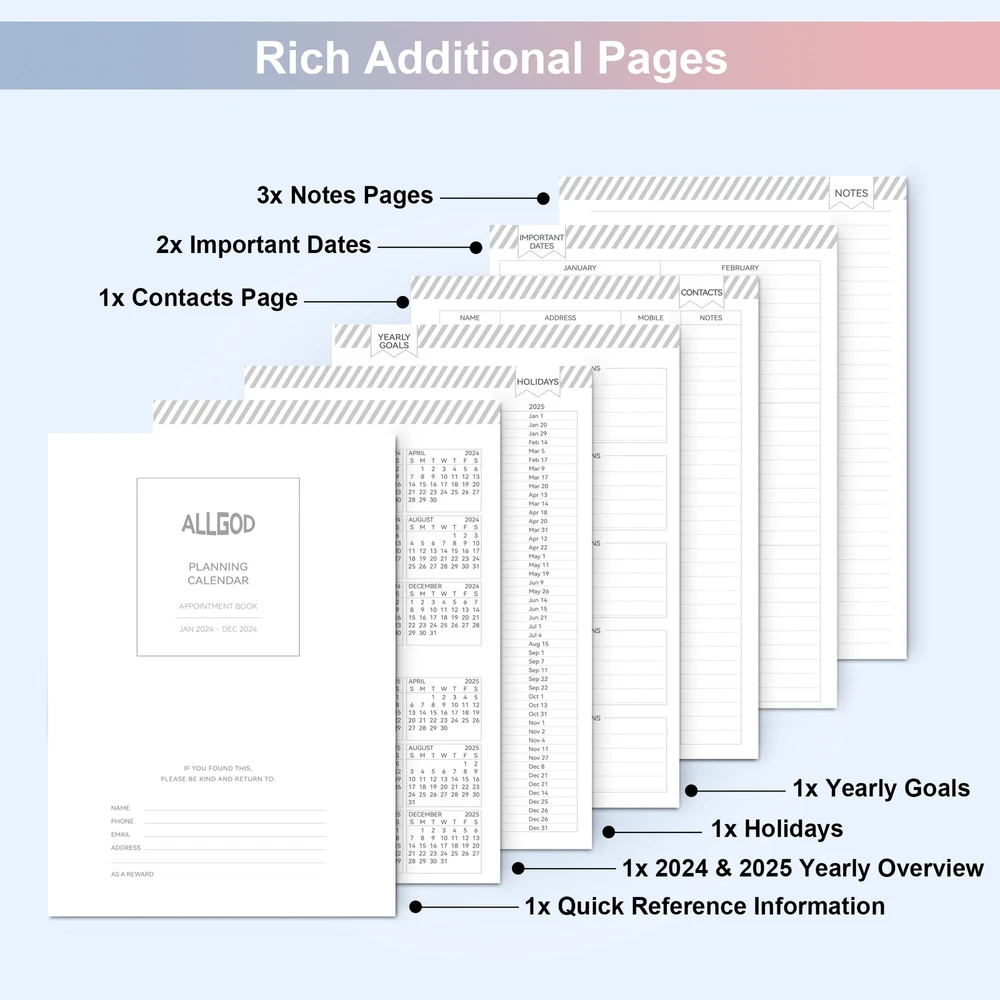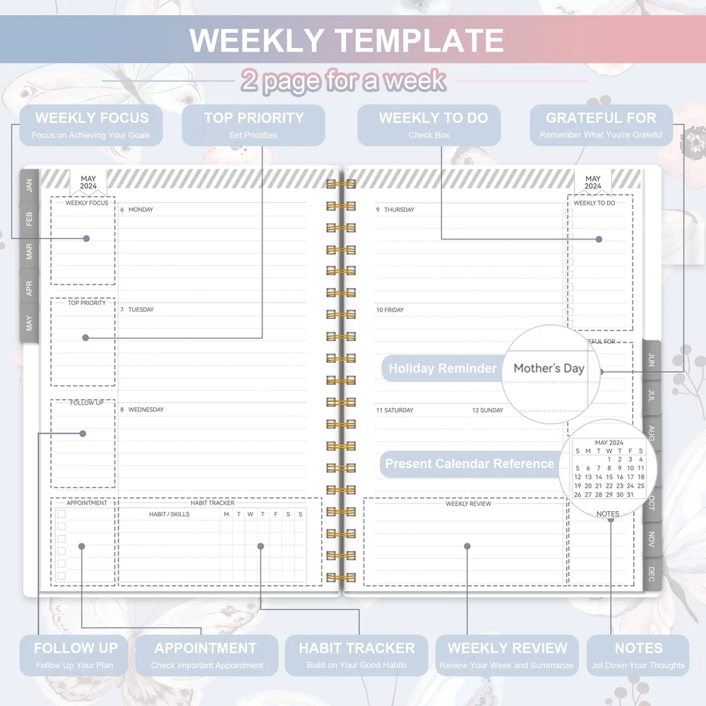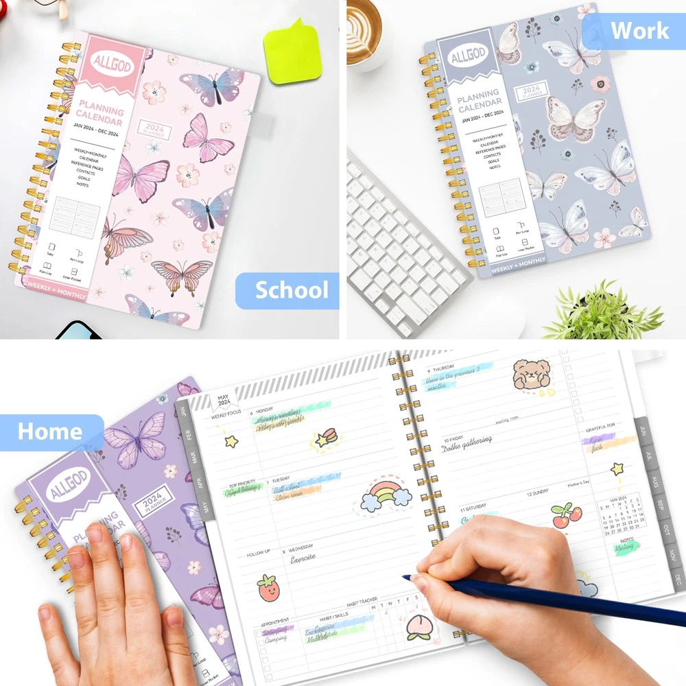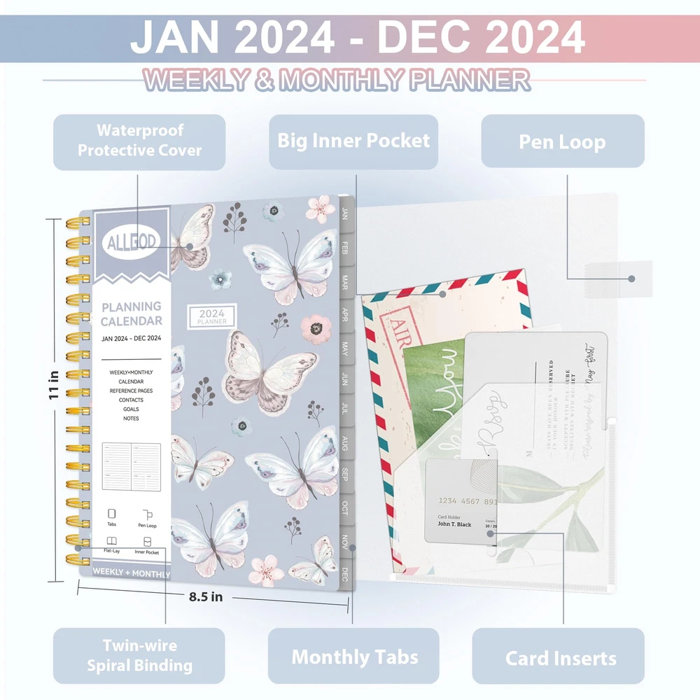 Allgod 2024 Planner Weekly & Monthly Agenda Book Yearly Calendar Planning To Do List Notebook,8.5 * 11 inch with Monthly Tabs, Inner Pocket,Waterproof Cover,Pen Loop,Spiral Bound (Blue Butterfly, A4) Get ahead with Allgod's 2024 12-month weekly planner - featuring a twin-binded spiral design that protects a butterfly blue or pink cover. Stay organized month-to-month, week-to-week, and day-to-day with its spacious weekly view, spanning two pages with detailed appointments, reminders, and notes. This planner comes with a monthly master planner section and weekly pages for day-to-day planning, complete with ruled daily blocks and notes columns to record spontaneous events and important items. Additionally, the planner includes sections for holidays, notes, and to-do lists. The new weekly view features a full page for notes and lists on every spread, providing ample space for all your planning needs. This planner comes in two sizes - Full Paper Size (8.5" x 11") and portable (8" x 6") - catering to your specific needs. Choose the full paper size for more space and to-do's or the portable size for a lighter option. Both sizes feature high-quality pure white paper, resistant to ink leakage, erasing, fraying, and shading issues - perfect for the most passionate artist or planner. Get organized with Allgod's 2024 weekly monthly planner - the ultimate planner to help you stay on top of your schedule! PROFESSIONAL DESIGN PLANNER: Stay organized year-round with monthly and weekly pages from Jan 2024 - Dec 2024, featuring a clear and easy-to-read layout. The planner also includes useful sections for personal information, yearly overview, yearly goals, important dates, holidays, contacts, and notes, allowing for seamless planning and effective time management. MONTHLY GOAL-SETTING: Take charge of your monthly plans with clearly defined goals, to-do lists, and review sections. The monthly planner contains 12 months of monthly pages, making it easy to keep track of important deadlines, special events, and daily tasks. Each planner notebook with plenty of space to jot down your appointments, plans, and to-do. MAXIMIZE YOUR WEEK: Optimize your weekly schedule with comprehensive weekly view pages that include space for weekly focus, top priority tasks, follow-ups, appointments, habit tracking, to-do lists, things to be grateful for, weekly reviews, and notes. Large places for arranging the daily schedules. QUALITY PAPER: Thick paper that prevents bleed-through with markers and provides a great writing experience. The off-white paper is bleach-free and gentle on the eyes. Coated tabs provide quick access every month. FUNCTIONAL DESIGNS: The durable twin-wire binding and sturdy PVC cover ensure that your planner will withstand daily wear and tear, so you can rely on it throughout the year. Plus, with the inner expandable pocket, you can keep important documents and notes with you at all times. Shipping from the USA All of our products are shipped from the USA, ensuring quick delivery to your destination. Payment We offer the following payment methods: PayPal, credit card, bank transfer, and eBay's secure payment system. Free Shipping & Free Returns Shipping within the USA is FREE. Additionally, any return is absolutely free for you. Risk-Free Purchase You have the option to return an item within 30 days without any justification. We cover the return shipping costs! Fast Shipping We ship immediately upon receipt of payment. Generally, the package is delivered within 2-3 days in the USA. If it takes longer, we will contact you. Quality and Costs Made in Europe, USA, China No customs fees or additional charges Total satisfaction guarantee Invoice with declared VAT available upon request in .pdf format Feedback Your feedback is very important to us. After you pay for your purchase, you will automatically receive positive feedback from us.