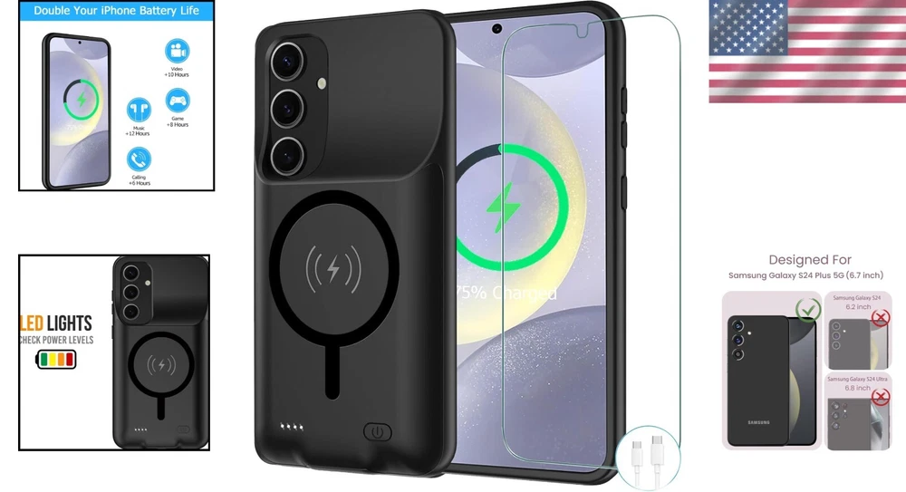 Version: 1 Compatible Model: For Samsung Galaxy S24+ Material: Rubber Finish Type: Matte Theme: Electronics Design/Finish: Matte, Low-Profile, Solid UPC: Does not apply Item Weight: unknown Personalize: No Features: Wireless Charging, 100% or more power, One-piece design, easy to use, 4 LED battery power indicators, Customer satisfaction focus, Ergonomic design, Soft rubber top, Portable design, Charging anytime and anywhere, Rechargeable up to 800 times Additional Features: Travel Screen Size: 6.7 Inches Type: Battery Case Item Height: Battery Case for Galaxy S24 Plus Item Length: Battery Case for Galaxy S24 Plus Size: For Galaxy S24 Plus gtin13: Does not apply Built-in Media: Cleaning Cloth Form Factor: Basic Case Compatible Brand: For Samsung Item Width: Battery Case for Galaxy S24 Plus Color: Black Wireless Charging Standard: Qi Pattern: Solid Material Type: Rubber, Polycarbonate Items Included: Battery Case, User Manual, Charging Cable, Tempered Film, Cleaning Cloth Compatible Devices: Galaxy S24 Plus Brand: Unbranded Package Type: Standard