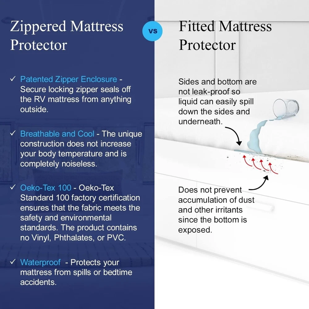 All-in-One RV Mattress Protector with Secure Locking Zipper - 60x75 Short Queen ‹ › ‹ › ‹ › ‹ › ‹ › ‹ › ‹ › ‹ › All-in-One RV Mattress Protector Dimensions: 60x75 Short Queen Features: Exceptional complete protection: Zips closed on all 6 sides Prevents dust, pet dander, pollen, liquids, and more Quiet and cool: Soft poly knit fabric maintains cool temperature Patented secure locking zipper with auto lock tab Velcro seal over zipper for added protection Allergy relief: Special barrier shields against allergens All 6 sides waterproof protection against spills and liquids Easy to care: Machine washable on hot with tumble dry Flexible stretch sides to fit mattresses 9-13" deep Manufactured by a trusted American company with a lifetime warranty Benefits: Superior protection for your RV and camper mattress Maintains a peaceful sleep environment without rustling noises Ensures a lifetime of comfort free from irritants Effortless maintenance and cleaning Fits snugly and securely, accommodating depths of 9-13" Confident in your purchase with a lifetime warranty on workmanship Why choose our All-in-One RV Mattress Protector? Your RV mattress deserves the utmost care and protection. With our All-in-One RV Mattress Protector, experience unparalleled shielding against dust, allergens, and liquid spills, all while enjoying a soft, quiet sleeping surface. Forget about the discomfort associated with traditional fitted sheets; our patent-pending design ensures complete coverage and peace of mind. Trust in a product backed by a 70-year-old American company, specializing in high-performance fabrics and allergen barrier technology. With a lifetime warranty, we instill extraordinary confidence in your investment. Ensure that your travels are as restful as they are adventurous with our premium All-in-One RV Mattress Protector. Upgrade your sleep experience today! Shipping Free & Fast Shipping - We offer free shipping to most of the USA with a normal delivery time of 3-7 days. However, due to the current situation, additional delivery time (up to 3 weeks) may be required for some items. Alternative Carriers - We may use alternative carriers (e.g. USPS, FedEx, UPS, etc.) to ensure your package arrives safely and on time. Due to the use of multiple carriers, we are unable to provide a tracking number automatically. Handling Time - Orders are processed and shipped within 1-2 business days of receiving cleared payment. Shipping Restrictions - Shipping to Alaska, Hawaii, Puerto Rico, Guam, and other US territories may incur shipping charges or delivery restrictions. Please contact us before ordering, or your order can be refunded/cancelled. State Restrictions - There may be restrictions based on your state of purchase. For example, certain items may not be shipped to California due to state regulations. Contact for Tracking Updates - If you require tracking updates or have any concerns about the delivery of your order, please feel free to contact us, and we will be happy to assist you. Return 30-Day Hassle-Free Returns - We want you to be completely satisfied with your purchase. If you are not, you can return the item within 30 days of receiving it for a full refund or exchange. Easy Return Process - To start a return, simply contact us and we will provide you with a prepaid return shipping label and detailed instructions. Restocking Fee - There are no restocking fees for returns. However, the buyer is responsible for return shipping costs if the return is not due to a seller's error. Refund Processing Time - Refunds will be processed within 5 business days of receiving the returned item in its original condition. Payment We accept all major credit cards, PayPal, and Apple Pay for your convenience. Your payment information is secure and encrypted to ensure a safe and seamless transaction. Please complete your payment within 3 days of purchase to avoid any delays in shipping. Feedback Your feedback is extremely important to us. We strive to provide the best products and customer service possible. If you are satisfied with your purchase, please take a moment to leave us a positive review. If you have any concerns or issues with your order, please contact us before leaving negative feedback. We are committed to resolving any problems and ensuring your satisfaction. Contact Us If you have any questions or concerns, please feel free to reach out to our customer support team. You can contact us through the eBay messaging system. We are available Monday to Friday, 9:00 am to 5:00 pm EST, and we will do our best to respond to your inquiry within 24 hours. Buy it now and enjoy a pleasant shopping experience! UPC: Not Set Item Length: Not Set Item Width: Not Set Unit Quantity: Not Set Material: Polyester,Satin,Spandex,Plastic Features: Not Set Care Instructions: Machine Wash Character: Not Set Theme: Not Set Department: All Ages Room: Bedroom Labels & Certifications: Not Set Brand: Unbranded Size: 60x75 Type: Mattress Protector Fill Material: Not Set Color: Not Set Pattern: Not Set MPN: Not Set Closure Type: Velcro Insulation: Not Set Character Family: Not Set Country/Region of Manufacture: Not Set Style: Not Set Shape: Not Set Thread Count: Not Set GSM (Grams per Square Meter): Not Set Model: Not Set Product Line: Not Set Unit Type: Unit