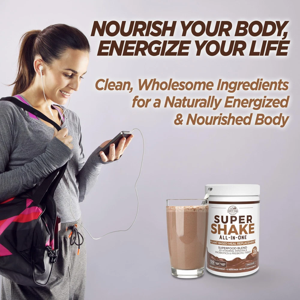 All-In-One Super Shake is the ideal meal replacement shake mix for active people who want the finest all-natural, plant-based shake supplement. Formulated with a balanced blend of pumpkin, chia and pea proteins, each serving contains 15 grams of the highest quality plant protein, which is essential for anyone who’s on the go. This all-in-one formula also boasts 30 farm fresh, plant-based superfoods, plus 20 and minerals, and antioxidants. Enjoy the convenience of this nutritious, gluten free, all-in-one meal replacement powder any time of the day. Simply mix two scoops with water or your favorite beverage, shake it up and you can stay on the go without sacrificing your nutrition. Thanks to premium quality plant protein, fruits, vegetables, green superfoods, probiotics and prebiotics, All-In-One Super Shake provides everything you need for an active, healthy lifestyle. PLANT-BASED MEAL REPLACEMENT SHAKE: Get the best nutrition possible when you’re on the run with this All-in-One Super Shake! Each serving contains 15 g protein, 30 organic superfoods, probiotics and prebiotic fiber 30 ORGANIC SUPERFOODS: Each serving boasts a potent blend of 30 organic superfoods, including beets, raspberry, acai, , papaya and immune building mushrooms 15 g PLANT PROTEIN PER SERVING: Thanks to a blend of pea protein, pumpkin, chia, sacha inchi and flax seed, this All-in-One Shake is packed with 15 g of premium quality plant protein PROBIOTICS & PREBIOTICS FOR GUT HEALTH: With a potent Bacillus coagulans probiotic and blend of organic blue agave inulin and organic ocacia fiber, you can improve intestinal microbial health for better digestion CONVENIENT, READY TO USE & DELICIOUS: Simply blend two scoops of powder in water or your favorite beverage to create a delicious, nutritious chocolate shake!