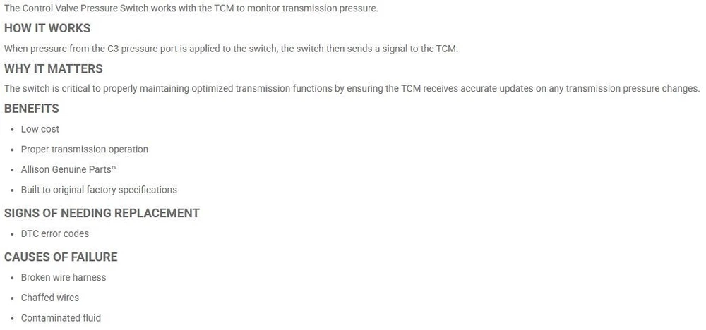 For your consideration is the Allison C3 Transmission Control Valve Pressure Switch shown. It is new but without factory bag. All items are shipped within 1 business day, usually same day if purchased by Noon Eastern time. Thanks for looking!