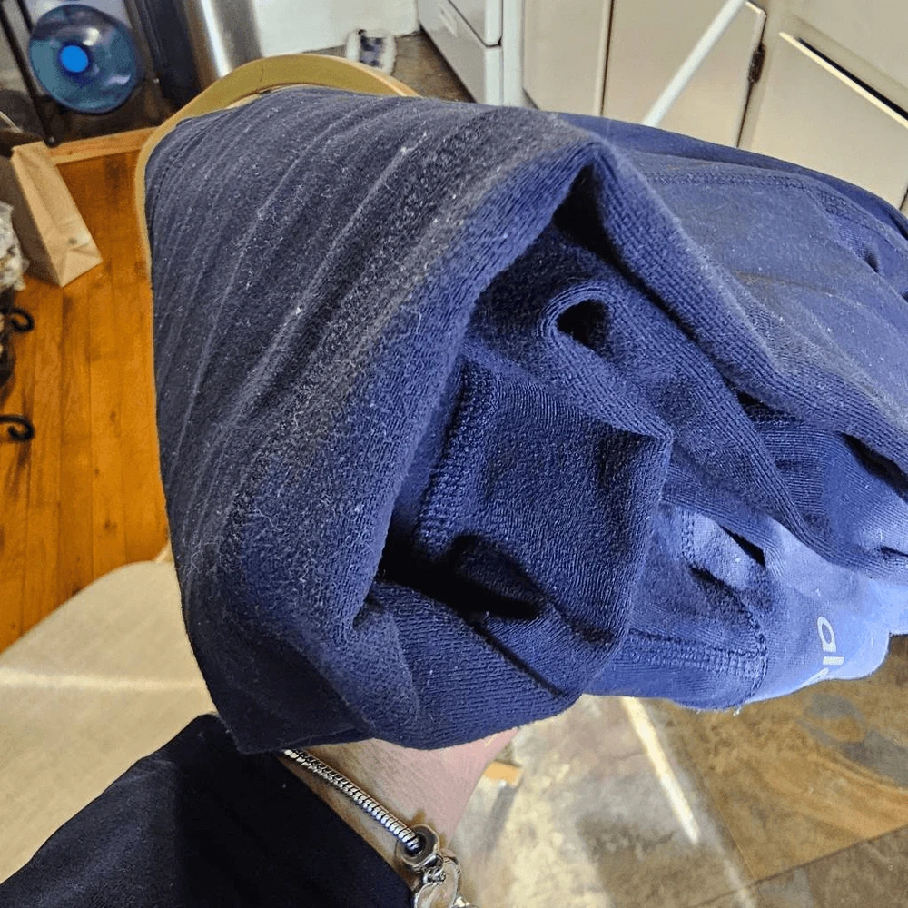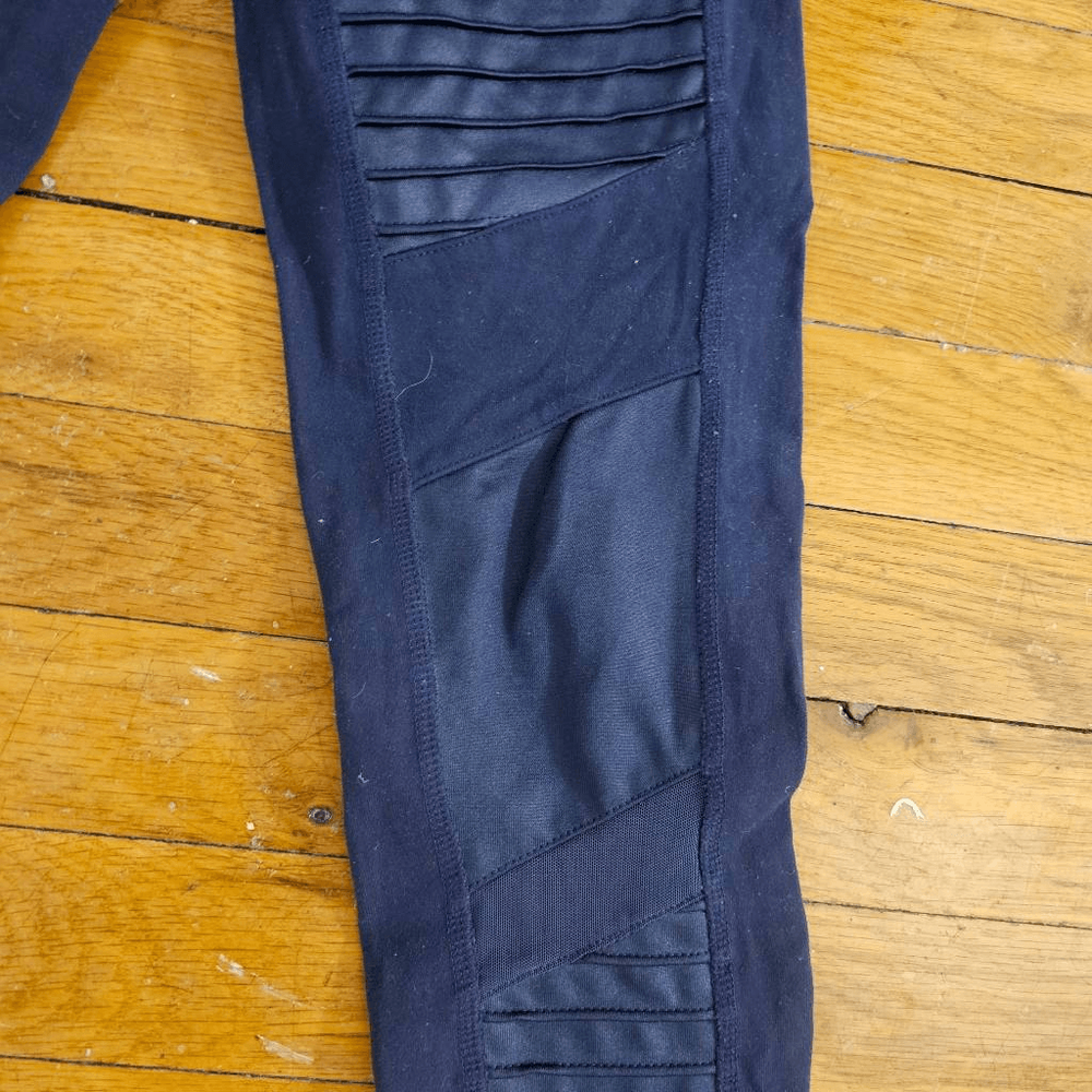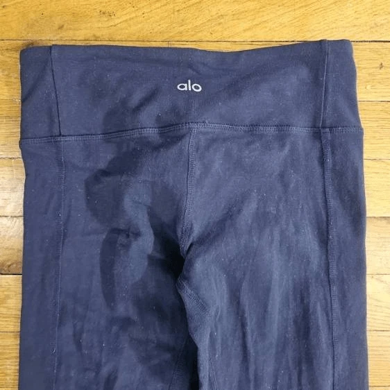 It looks like the leggings are worn. The actual measurements of the clothes are in the photos. If the clothes have a defect, it will be shown in the photos.The clothes are not washed by me so they may smell like dirty clothes or other things. Good condition.