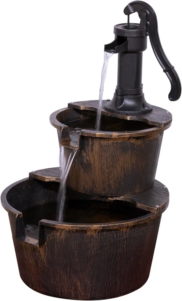 About this item BARREL FOUNTAIN: Garden water fountain is the perfect addition to your outdoor decor, and has an interior pump that keeps the water flowing - just plug it in! RELAXING WATER FLOW: Water trickles from the pump spout into the barrel tiers, adding a peaceful ambiance to your outdoor setting RUSTIC LOOK: Realistic faux wood barrels and pump head design for an old-fashioned country feel DURABLE: Plastic construction is rust- and weather-resistant to keep your outdoor fountain looking new over time, and has a 5L water capacity IDEAL SIZE: Water fountain measures 16"L x 18"W x 27"H, the perfect size for your yard, and includes a two-year manufacturer's warranty from date of purchase