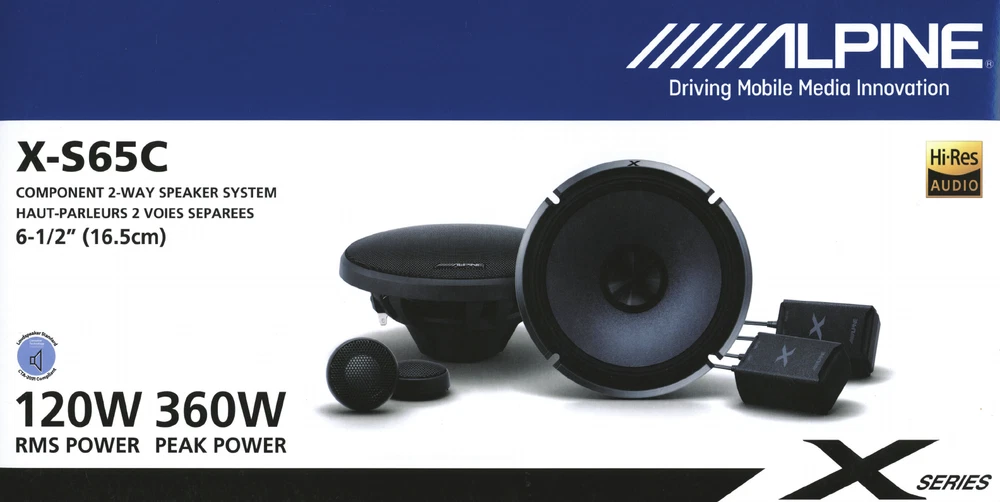 Alpine X-S65 Bundle - Two pairs of X-Series 6.5 " Coaxial 2-Way Speakers Alpine X-S65 660W Max (220W RMS) 6.5" X-Series 2-Way Coaxial Car Speakers General Features: 6-1/2" Alpine X-Series 2-way Coaxial Car Speakers Power Handling: Peak: 660 watts per pair / 330 watts each RMS: 220 watts per pair / 110 watts each Nano Fiber cone material H.A.M.R. surround speaker surround 1" Carbon Graphite Dome Tweeters Surface mount application tweeter H.A.M.R surround Shallow mounting design Audiophile sound experience Lightweight Neodymium magnet motor structure Top-mount Depth: 2-3/8" Cutout Dimensions: 5-3/8" Impedance: 4 ohms Frequency Response: 50 - 50000 Hz Sensitivity: 89 dB Authorized Internet Dealer ⚠️Warning: This product can expose you to, known to the State of California, to cause cancer. For more information, go to P65Warnings.ca.
