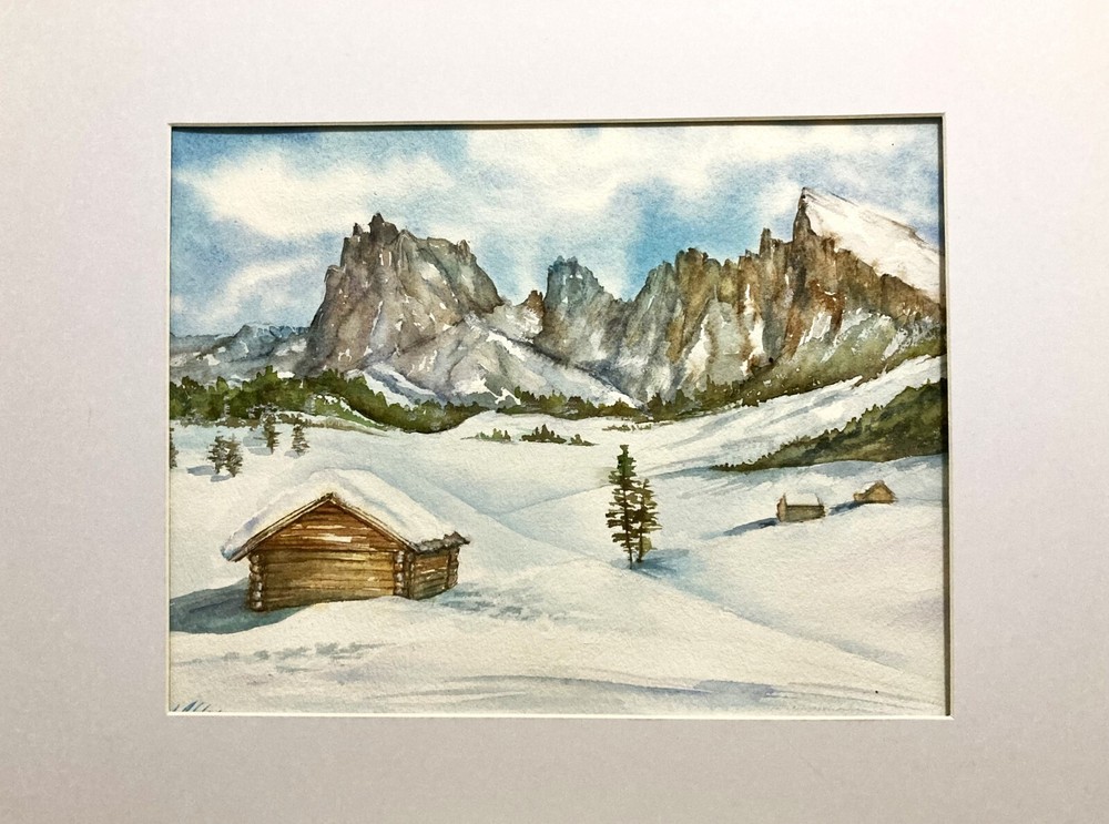 European Alps mountain . Watercolor original painting . Not a print or a copy . Cold press acid - free 100 % cotton watercolor paper . Signed on the front and back side by artist Liz Altin . Size 12. 2 x 9 inches . This stunning watercolor painting captures the breathtaking beauty of the Alps during winter, with snow-covered mountains towering above a charming village of small houses nestled among snow-dusted trees. The serene scene, painted with delicate attention to detail, transports the viewer to a peaceful alpine retreat, where the crisp air and the quiet of a winter's day are almost tangible.