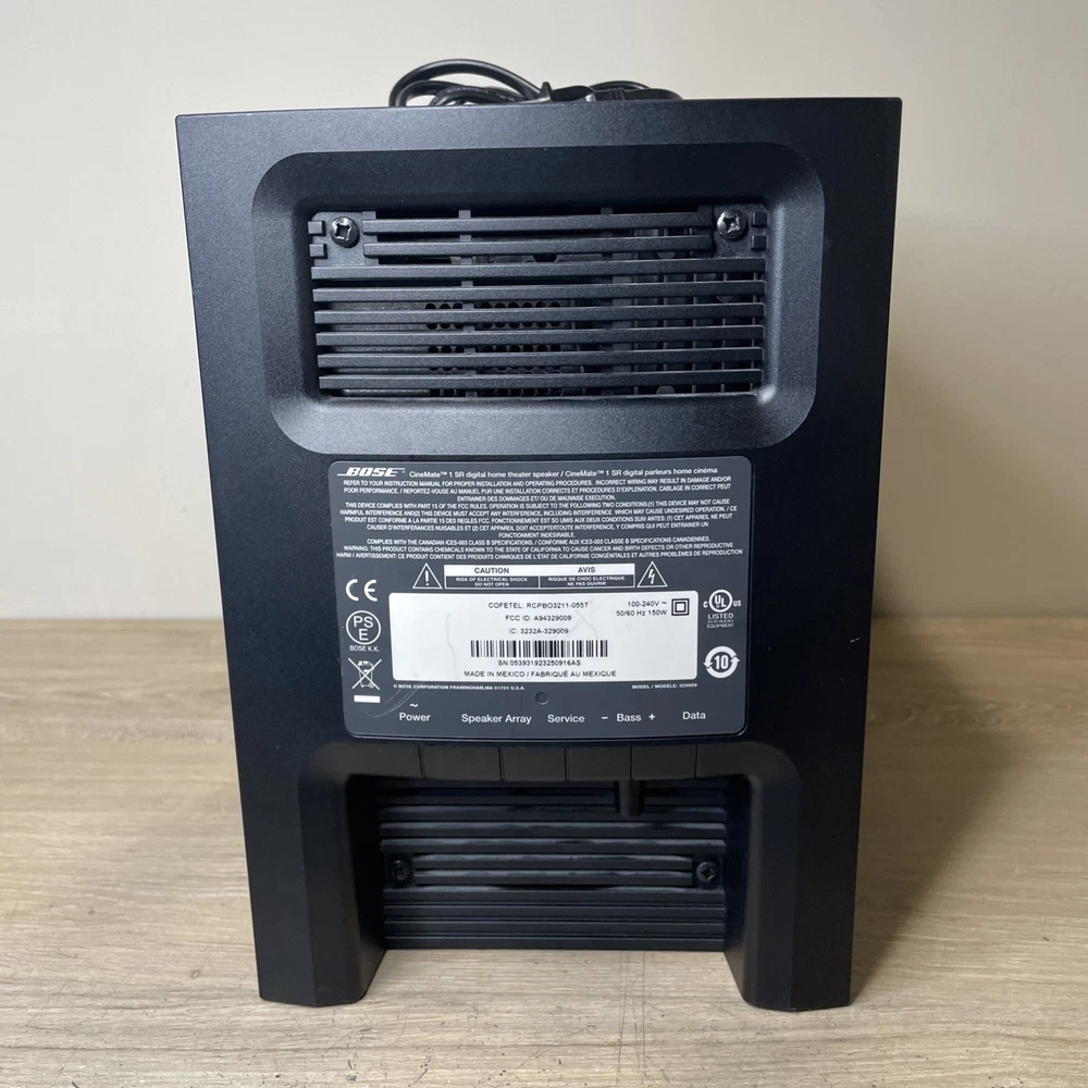 brand:BoseForma:RectangularConectividad:Con cableMarca:BosePotencia RMS:300 Wmodel:Bose CineMate 1 SREstado del artículo:UsadoTipo:SubwooferConfiguración del sistema:Canal 2.1Color:NegroModelo:Bose CineMate 1 SR