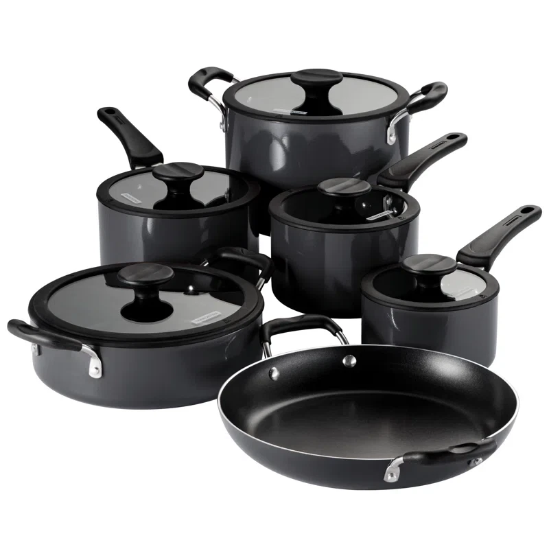 We’ve thought of just about everything to make your cooking, cleaning, and organizing experience better in the kitchen. The Tramontina nesting 11 pc cookware set will revolutionize your cooking and your storage space. The pieces in this dependable set lock together, and nest within each other—leaving you with 50% more cupboard space! Made of heavy-gauge aluminum, the high-performing set features a porcelain enamel exterior finish. You can feel comfortable preparing family dishes with our nesting cookware set. We’ve paired the porcelain enamel exterior with a nonstick interior, making it strong enough to handle your busy kitchen and your heartiest recipes—all with the low-maintenance durability you count on from Tramontina. Keep an eye on your sauces and soup through heat- and shatter-resistant tempered glass lids and say goodbye to trails of sauce across your countertops. These lids also feature a unique (and convenient) knob that serves as a spoon rest! We didn’t stop there. Ergonomically designed, riveted handles also help save storage space, as well as, the life of the set, by locking together and spacing the vessels apart, to protect the nonstick surface from getting scratched when tucked away in your cupboards. And when it’s all about the cleaning, this set makes that a breeze as well. It’s easy to clean and dishwasher-safe! Available in a variety of colors.