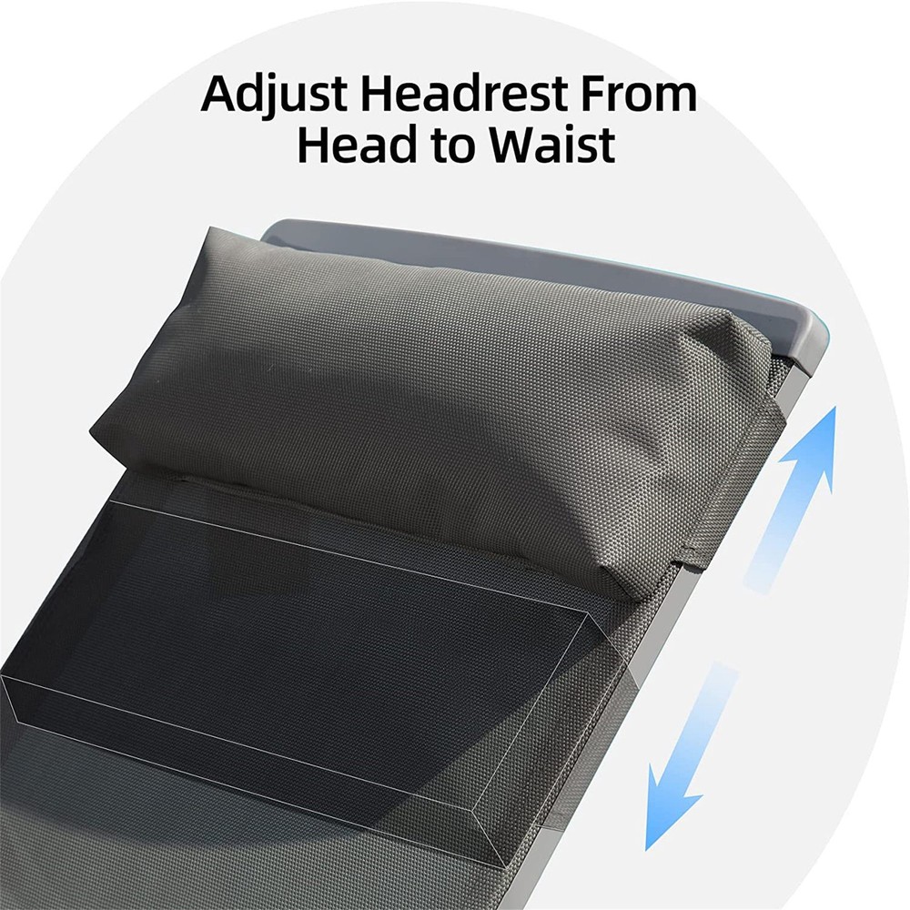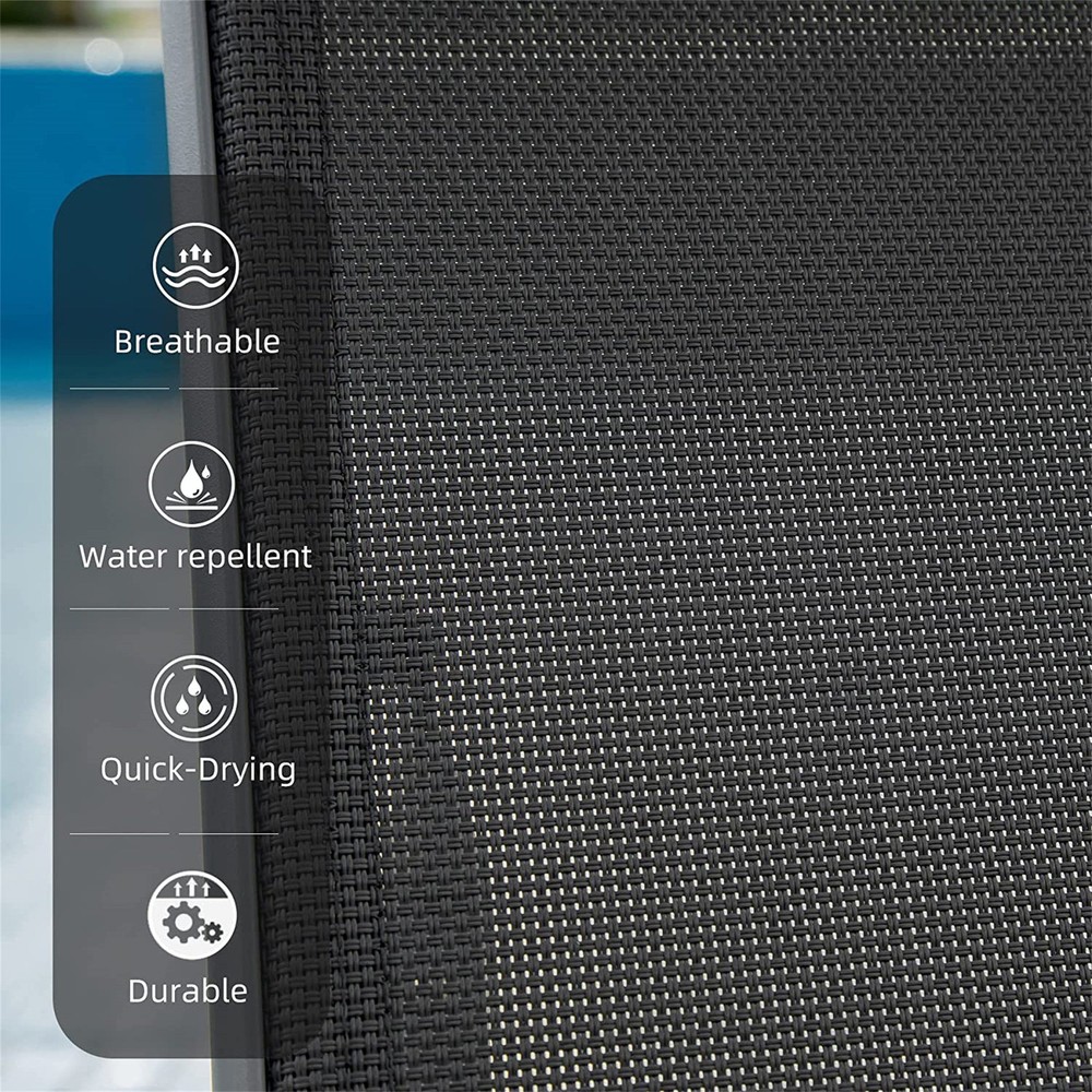 Specifications Place of Origin #originPlace# Main Color Grey Main Material Aluminum Dangerous Goods #dangerFlag# Dimensions & Weights Assembled Length (in.) 65.12 Assembled Width (in.) 61.26 Assembled Height (in.) 38.35 Weight (lbs) 45.19 Product Features 【Sturdy Aluminum Frame】The frame of lounge chair pool is made of Aluminum which is waterproof and rust-resistant,solid and durable.It can hold a maximum weight of 300 Pounds. 【High-Quality Textilene】The seat and backrest are made of textilene fabric, which is water-repellent and UV- resistant,fast drying and breathable.You'll feel pretty comfortable lying on it even during hot summer day. 【5 Adjustable Back】The patio chaise chair backrest has 5 adjustable positions that you can adjust according to your needs, bringing you a convenient and comfortable leisure experience. 【Easy Storage】This chaise lounge chair can be stacked stored when not in use,saving your courtyard space.Each leg with non slip design will not scratch your floor and deck. 【Suitable for Different Occasions】This outdoor chaise lounge set includes 2 lounge chairs and 1 side table that can be widely applied to the poolside,balcony,garden,lawn and other outdoor recreation place. Description Product Description This Outdoor 3 Pieces Aluminum Textilene Chaise Lounge Set with Adjustable Back,Pillow & Side Table would be a gorgeous addition to your patio, garden, backyard, poolside or other outdoor living space. With the 5 adjustable positions and removable cushion, you can adjust to the position that suits you best and enjoy your leisure time. Firm Structure The firm structure and anti-slip rubber at the bottom of the foot add stability to the lounge, which protect you from falling. 5 Adjustable Positions Designed with 5 adjustable positions even can be completely flat, you can meet your demands for different reclining positions. Have a comfortable nap anywhere you want. Breathable Textilene fabric