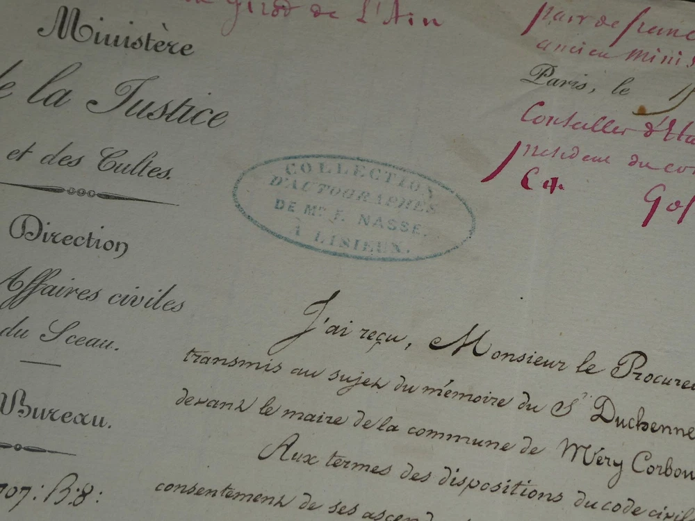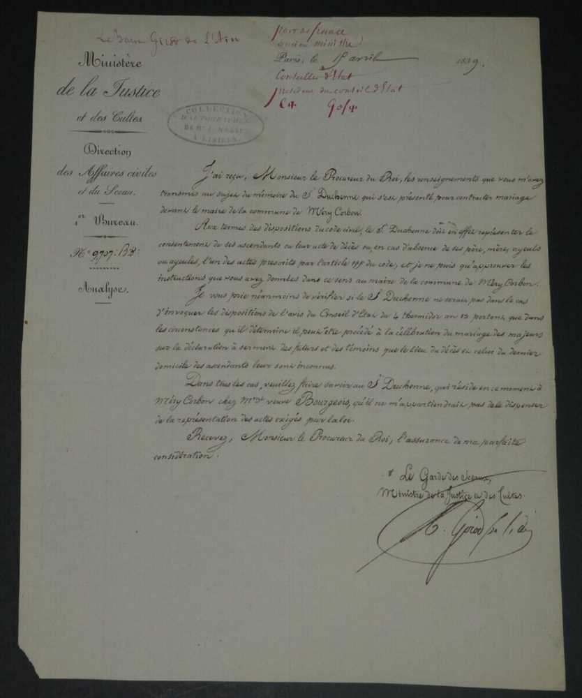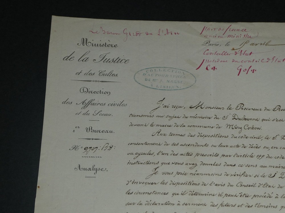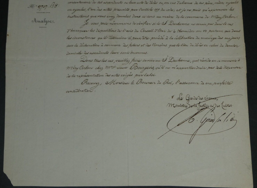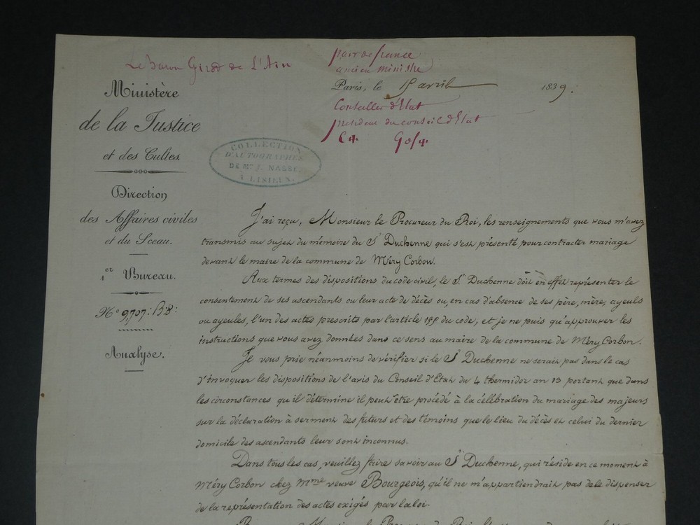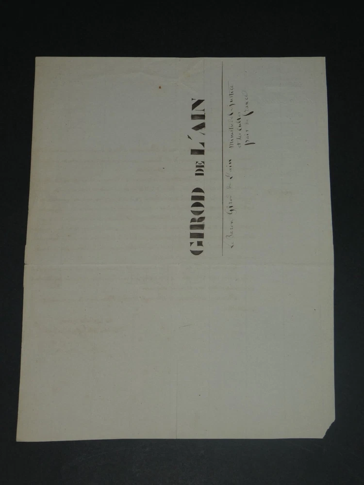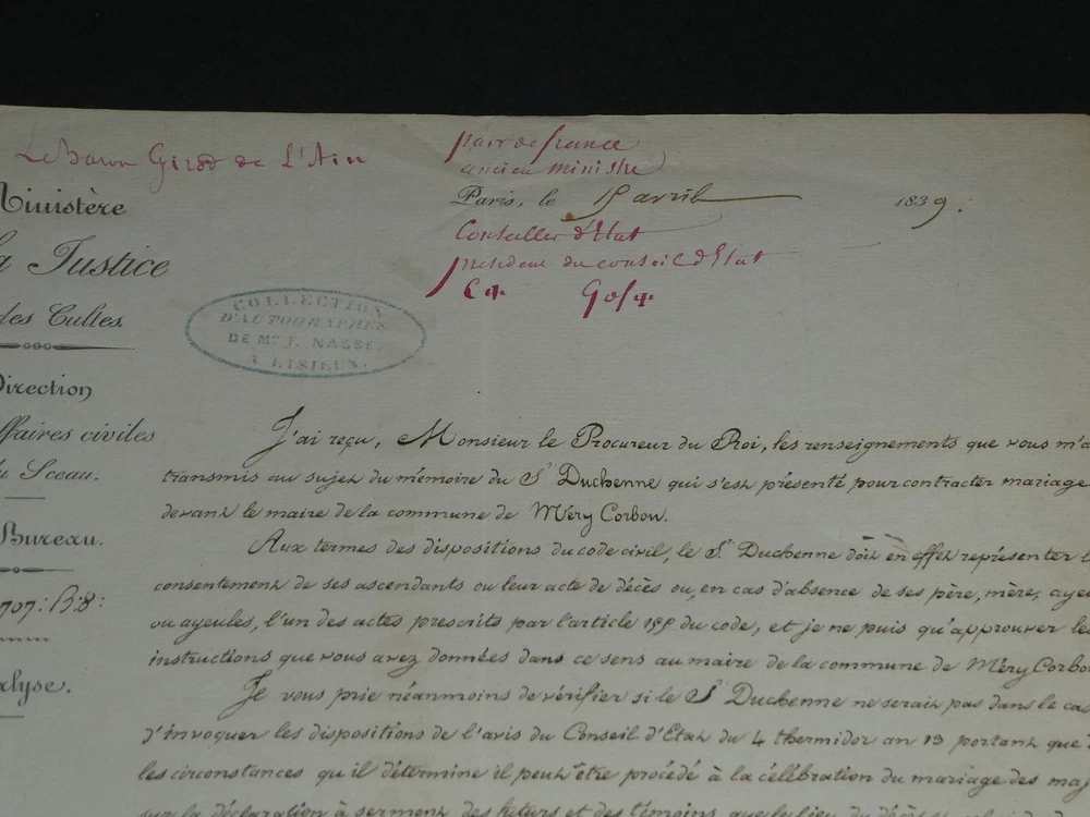 Free eBay listing template designed by dewiso.com Amédée Girod De L'Ain - Letter Signed Autograph To Mr the Prosecutor of King The description of this item has been automatically translated. If you have any questions, please feel free to contact us. Amédée Girod de l'Ain - Autograph letter signed to the King's Prosecutor Politician Autograph letter signed by Amédée Girod de l'Ain, Keeper of the Seals, Peer of France, addressed to the King's Attorney, dated April 15, 1839, in Paris. "I have received, Mr. King's Prosecutor, the information that you transmitted to me concerning the memoir of Sieur Duchenne who presented himself to contract marriage before the mayor of the commune of Méry-Corbon. [...] In any case, please let Mr. Duchenne, who is currently residing in Méry-Corbon with Mrs. Widow Bourgeois, know that it would not be up to me to exempt him from the representation of the acts required by law. Please accept, Mr. King's Prosecutor, the assurance of my perfect consideration." Dimensions: 20.3 x 26.3 cm. State : See photos and description for details. Amédée GIROD DE L'AIN Baron Louis Gaspard Amédée Girod de l'Ain was a French politician, born in Gex on October 18, 1781 and died in Paris on December 27, 1847. Wikipedia Contact us Autograph letters, old papers, old books, photographs, engravings, stamps... We appraise and/or buy your letters, collections of letters and old books throughout France. Payment Payments by eBay, PayPal, transfer or check are accepted. Sending Careful delivery in rigid, waterproof packaging within three days. Allow for the usual postal delays in addition. Back Satisfaction guaranteed or your money back. If you are not completely satisfied, return at the seller's expense for Europe. At the buyer's expense for the rest of the world. Autograph letter signed by Amédée Girod de l'Ain, Keeper of the Seals, Peer of France, addressed to the King's Attorney, dated April 15, 1839, in Paris."I have received, Mr. King's Prosecutor, the information that you transmitted to me concerning the memoir of Sieur Duchenne who presented himself to contract marriage before the mayor of the commune of Méry-Corbon.[...] In any case, please let Mr. Duchenne, who is currently residing in Méry-Corbon with Mrs. Widow Bourgeois, know that it would not be up to me to exempt him from the representation of the acts required by law.Please accept, Mr. King's Prosecutor, the assurance of my perfect consideration." Dimensions: 20.3 x 26.3 cm. State : See photos and description for details.