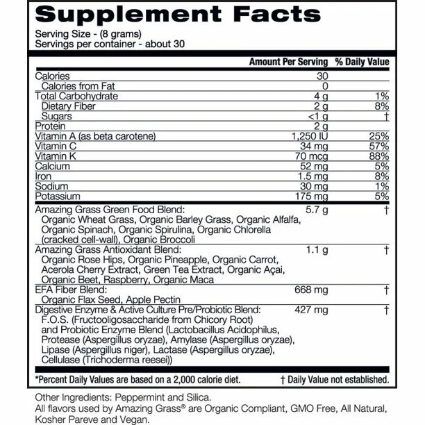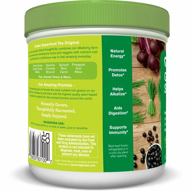 About This Item We aim to show you accurate product information. Manufacturers, suppliers and others provide what you see here, and we have not verified it. Get nutrition morning, day and night with Amazing Grass Green Superfood. This popular blend combines alkalizing farm-fresh greens and wholesome fruits and veggies with nutrient-rich superfoods for a tasty way to feel healthy everyday. Greens organic superfood provides an easy way to get the nutrition your body needs. Simply add one scoop to water or juice or your favorite smoothie to help maintain overall health and wellness. Amazing Grass Green Superfood Powder, Original, 30 Servings: Crafted with 7 alkalizing farm-fresh greens More than 3 servings of greens, fruits and veggies More organic greens than any other greens blend Certified organic by CCOF Gluten-free, no sugar added, plant-based, non-GMO, Kosher Add one scoop of greens blend berry with 8 oz or more of water, juice or smoothie Naturally balances and increases alkalinity Aids natural digestion function Supports overall health and immunity 30 servings, 8.5 oz Indications: Health Concern: Digestive Support Alkaline Support Circulatory Health Immunity Support Ingredients: Inactive Ingredients: Peppermint and silica Ingredients: Amazing Grass Green Food Blend: Organic Wheat Grass, Organic Barley Grass, Organic Alfalfa, Organic Spinach, Organic Spirulina, Organic Chlorella (Cracked Cell-Wall), Organic Broccoli, Amazing Grass Antioxidant Blend: Organic Rose Hips, Organic Pineapple, Organic Carrot, Acerola Cherry Extract, Green Tea Leaf Extract, Organic Acai Berry, Organic Beet Root, Raspberry, Organic Maca Root, EFA Fiber Blend: Organic Flax Seed, Apple Pectin, Digestive Enzyme & Active Culture Pre/Probiotic Blend: 42 F,O,S, (Fructooligosaccharide from Chicory Root) and Probiotic Enzyme Blend (Lactobacillus Acidophilus, Protease (Aspergillus Oryzae), Amylase (Aspergillus Oryzae), Lipase (Aspergillus Niger), Lactase (Aspergillus Oryzae), Cellulase (Thrichoderma Reesei). Other Ingredients: Peppermint Leaf and Silica. Active Ingredients: Vitamin A (as Betacarotene), Vitamin C, Vitamin K, Riboflavin, Niacin, Vitamin B6, Folic Acid, Vitamin B12, Calcium, Iron, Iodine, Selenium, Manganese, Sodium, Potassium, Chlorophyll, Amazing Grass Green Food Blend Organic Wheat Grass, Organic Barley Grass, Organic Alfalfa, Organic Spirulina, Organic Spinach, Organic Chlorella (cracked cell-wall) and Organic Broccoli, BroccoliAmazing Grass Antioxidant Blend Organic Açai, Organic Maca, Organic Carrot, Organic Beet, Raspberry, Organic Rose Hips, Organic Pineapple, Green Tea and Acerola Cherry, EFA Fiber Blend Organic flax seed powder, apple pectin fiber., FiberDigestive Enzyme and Active Culture Pre/Probiotic Blend F.O.S. (Fructooligosaccharide from Chicory Root), Lactobacillus Acidophilus, Protease (Aspergillus oryzae), Amylase (Aspergillus oryzae), Lipase (Aspergillus niger), Lactase (Aspergillus oryzae) and Cellulase (Trichoderma reesei), Directions: Dosage: 1.00 Scoop(s) Instructions: Suggested Use: Add one scoop with 8 oz or more of water, juice or smoothie. Best kept frozen, refrigerated or in a cool, dry place after opening. Specifications Assembled Product Weight 0.7 lbs Brand Amazing Grass Manufacturer Amazing Grass Features Greens and Algea Assembled Product Dimensions (L x W x H) 3.62 x 3.62 x 4.62 Inches ~ Will be wrapped with care. ~ ~FREE SHIPPING~ Any questions, please feel free to contact us. Buy with confidence! Thanks for looking!