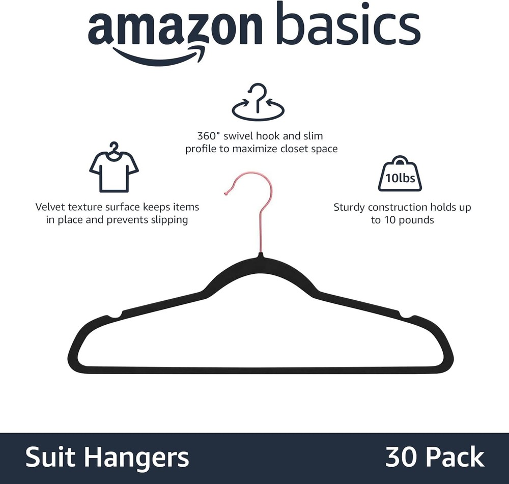 Description Product DescriptionBasics Velvet Non-Slip Suit Clothes Hangers, Black/Rose Gold - Pack of 30 From the ManufacturerBasics Features: INCLUDES: 30 suit clothes hangers in Black/Rose Gold for keeping shirts, blazers, slacks, and more neatly hung and organized CLOSET FRIENDLY: Slim profile helps maximize closet space NON-SLIP DESIGN: Velvet surface and notched shoulders prevent items from shifting and slipping DURABLE: Each sturdy metal-core hanger can hold up to 10 pounds PRODUCT DIMENSIONS: 17.4 x 0.2 x 9.2 inches (LxWxH) This product contains 80% Global Recycled Standard (GRS) certified recycled post-consumer polyethylene terephthalate (PET) Product Details: Color: Black/Rose Gold Material: Plastic Product Dimensions: 17.4"W x 9.2"H Special Feature: Slim Recommended Uses For Product: Clothing Number of Pieces: 30 Number of Items: 1 Shape: Triangular Finish Type: Smooth Size: Pack of 30 Maximum Weight Recommendation: 300 Pounds Item Weight: 2.32 ounces Country of Origin: China Item model number: FH-AZ049 Finish types: Smooth Batteries required: No Import: Imported Handling We will ship all orders within 3 business day of payment. Delivery We take pride in offering fast and reliable delivery for your orders! We are committed to getting your products to you as quickly as possible. Generally, we would like to inform you that all orders will be delivered to you within 1-3 business days after processing.However, in some cases, delivery times may vary depending on the buyer's location. Especially in remote or rural areas, the expected delivery time may be extended. In such situations, we do our best to ensure that your order reaches you as quickly as possible.If there are any delays, we will be happy to contact you to explain the situation. Our goal is to enhance your satisfaction with our fast delivery times. We work diligently to ensure that your order arrives safely.Trust us and enjoy our speedy delivery! Return Policy All items qualify for returns within 30 days of receipt. Buyer is responsible for return shipping on any item that is not damaged. Feedback We take our reputation seriously, we buy and sell online, so we understand the value of trust. If you are unsatisfied with your order, please contact us and we will work with you to resolve it to your satisfaction.