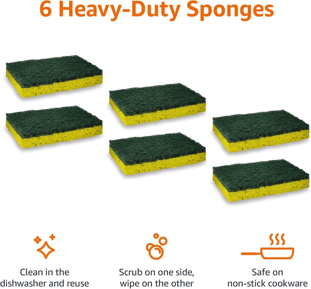 Product Details Product Dimensions : 4.4 x 2.7 x 0.8 inches; 4.16 ounces Item model number : AMZN01-HD Country of Origin : Mexico Material: Sponge Recommended Uses For Product: Scrubbing Surface Recommendation: Indoor and Outdoor Color: Yellow/Green Special Feature: Reusable Item Package Quantity: 1 Included Components: Scrub Sponges Product Dimensions: 4.4"L x 2.7"W x 0.8"Th Includes 6 heavy duty cleaning sponges Removes tough, baked on messes Scrub on one side, wipe on the other Tough cleaning power for everyday jobs Clean in the dishwasher and reuse Seller Basics Heavy Duty Sponges, Scrub on one side, wipe on the other. Tough cleaning power for everyday jobs