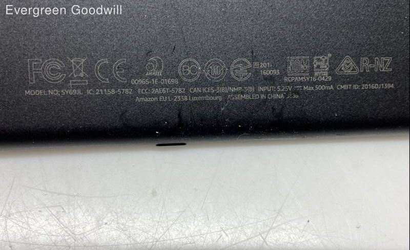 Amazon SY69JL Brand: Amazon Model: SY69JL Functionality: Item powers on - no further testing Condition: Donated item in used condition. Device is power on tested and factory reset. no power adapter. Not fully tested so selling as parts or repair. Evergreen Goodwill helps people get jobs across Northwest Washington by offering high-quality free job training, education and job placement. We empower individuals to overcome barriers to working by providing comprehensive support and connecting them with life-changing job opportunities, ensuring they are career-ready and can support themselves and their families. ***Disclaimer*** All items were donated to Evergreen Goodwill of Northwest Washington with no history or provenance. The auction is for all items pictured. Items may need servicing and/or benefit from a cleaning upon arrival. Please see photos for additional details and feel free to ask questions. PAYMENTS Please note that eBay will automatically cancel your entire order if the oldest item exceeds 4 days without payment. Once an order is canceled, we are unable to re-invoice, and the item will be relisted. To request a combined shipping invoice, please send one request within 2 days of winning your first item to avoid cancellation of your order. After a combined invoice has been sent, we are unable to add additional items to it. SHIPPING Local pickup is not available at this time. International shipping is not available at this time. We offer combined shipping as long as items will ship safely together. Auctions must end within 2 days of each other to be eligible for combined shipping. Please hold off on payment until all auctions have ended then proceed to checkout. Please do not pay for any items individually if you wish to have them combined - they must be paid at the same time. Items listed for flat-rate shipping are not eligible for combined shipping. PO Box addresses will require USPS shipments as FedEx Ground will not deliver. If FedEx is selected we may need to invoice for additional shipping costs.