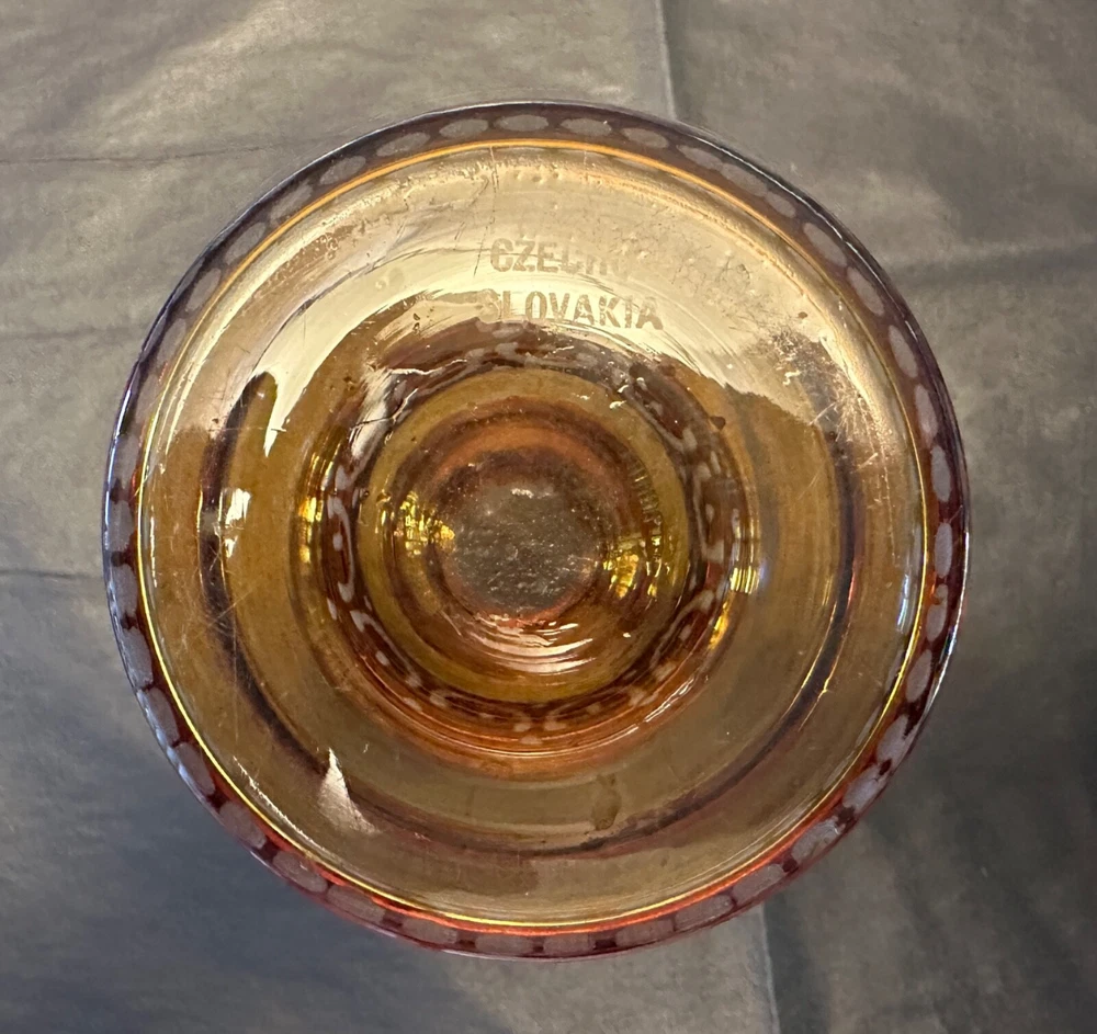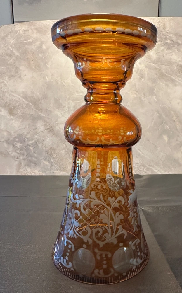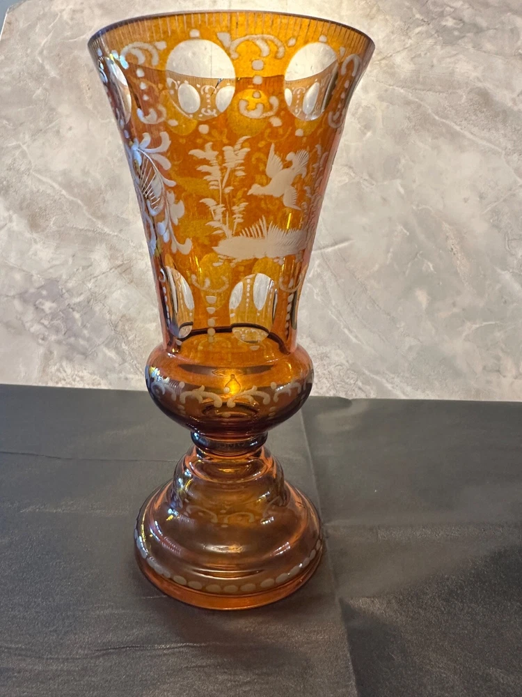 Storage unit find. I do not know much about it other than it’s an Egermann Amber Etched Vase. Has a small Chip on the rim and the bottom of the vase has scratch marks , looks like from it being moved around. Would love to keep but I do not have the room for it. Sold as is review pictures for additional details.