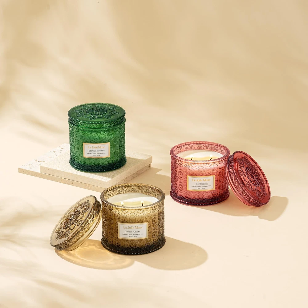 SAHARA AMBRE: A symphony of crisp bergamot and succulent apple, embraced by a heart of spicy cinnamon and comforting heliotrope, lingering with a blend of patchouli, vanilla, and amber. VEGAN SOY CANDLE: Our scented candle is poured with natural soy wax which is cruelty-free, paraben-free, and paraffin-free. This vegan candle guarantees a safe and delightful sensory experience. DOUBLE-WICK CANDLE: With a size of 12 oz/340 g and features 2 wicks that are made from lead-free cotton, this dual-wick candle ensures a faster, more fragrant fill of larger spaces. Allowing for a clean and even burn for around 60 hours. DECORATIVE JAR CANDLE: Embossed delicate daisy patterns adorn a thick, luxury glass jar. The jar itself is a statement home décor piece. A perfect gift idea that soothes and beautifies any space. A WELL-LOVED LUXURY: Derived from our most beloved series that has garnered immense love from our repeat customers, this new collection of candle also features our iconic daisy patterns, while adding more jar colors and scents. Find your signature scent now.