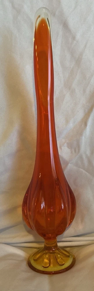 This beautiful vase is a stunning example of mid-century modern art glass. The amberina color and swung pattern make it a unique addition to any collection. Measuring at 12 1/4 inches, this vase is in excellent used condition and would make a great addition to any home decor. The vase is perfect for displaying flowers or as a standalone piece. Don't miss out on the opportunity to own this unique and beautiful piece of art glass.