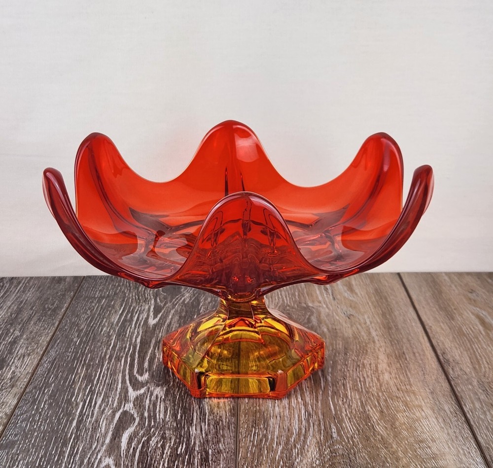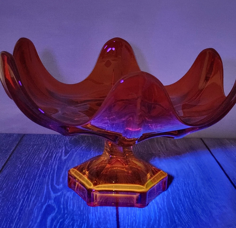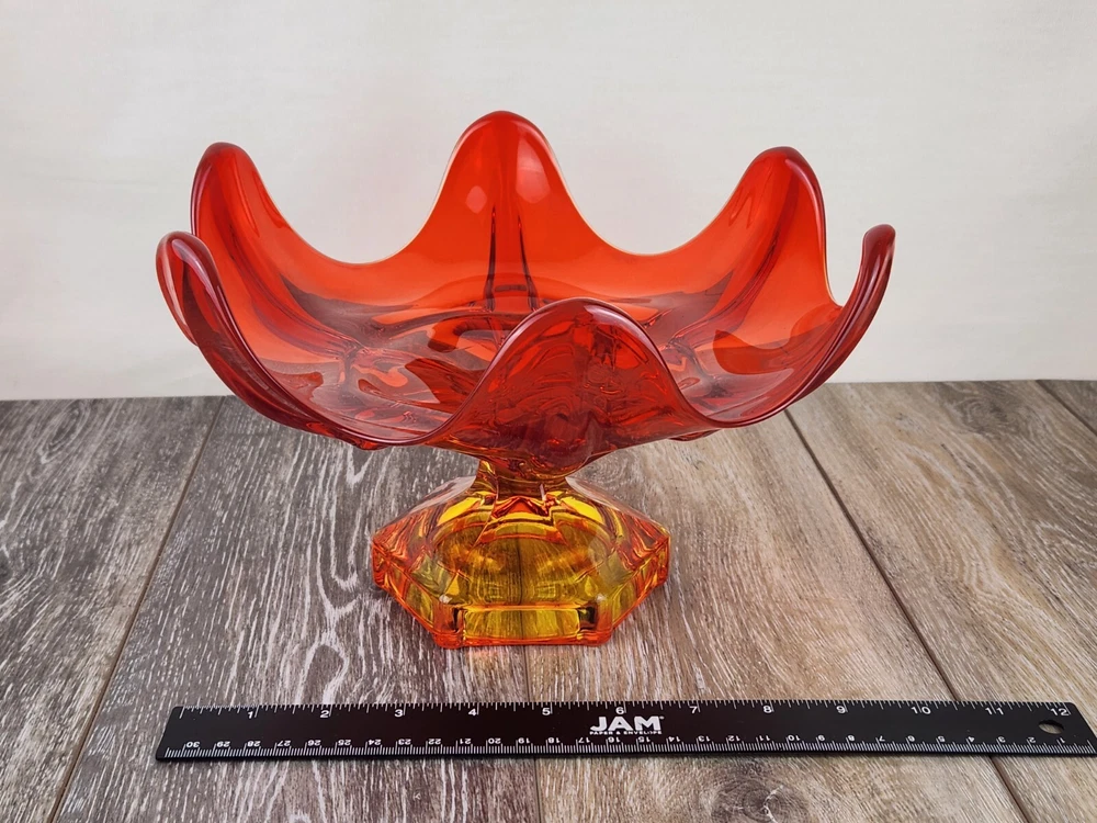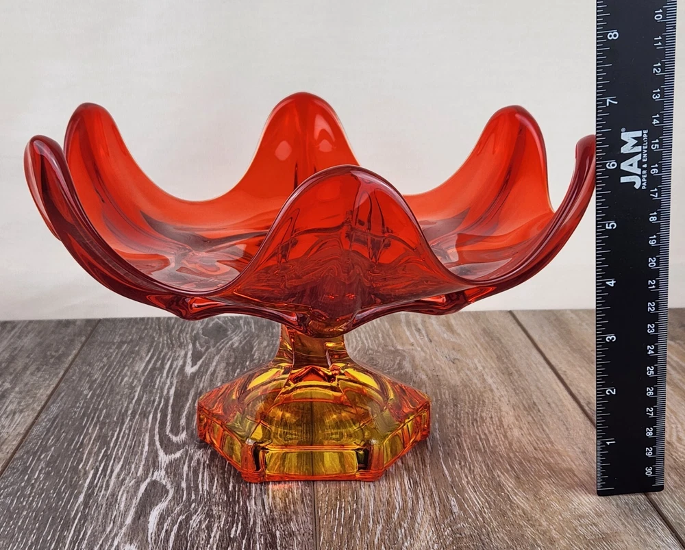 Elevate your decor with this vibrant Amberina Viking Glass pedestal bowl, standing 7 inches tall with a bold petal-shaped rim and fiery red-to-orange gradient. This retro mid-century art glass piece can serve as a stunning vase, candy dish, or centerpiece, glowing with vintage charm. Its rich hues and flared form make it a standout for collectors and fans of 1960s–70s glassware. Made by Viking Glass, it's the perfect blend of style and function. Does have a slight glow under 395nm due to cadmium. *Excellent condition!