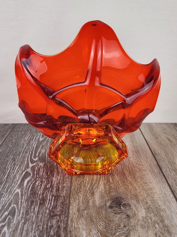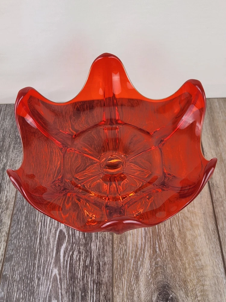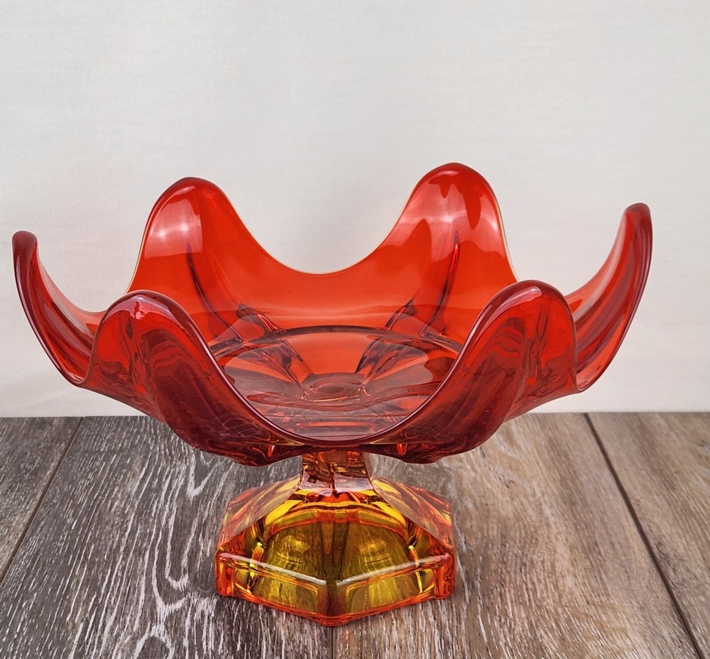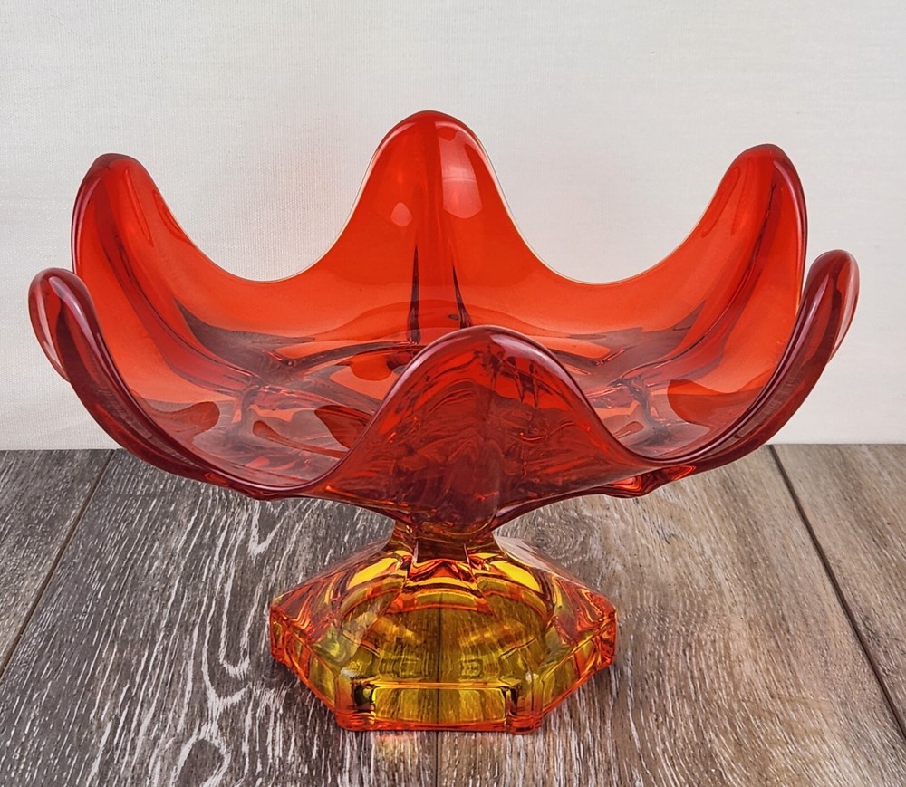 Elevate your decor with this vibrant Amberina Viking Glass pedestal bowl, standing 7 inches tall with a bold petal-shaped rim and fiery red-to-orange gradient. This retro mid-century art glass piece can serve as a stunning vase, candy dish, or centerpiece, glowing with vintage charm. Its rich hues and flared form make it a standout for collectors and fans of 1960s–70s glassware. Made by Viking Glass, it's the perfect blend of style and function. Does have a slight glow under 395nm due to cadmium. *Excellent condition!