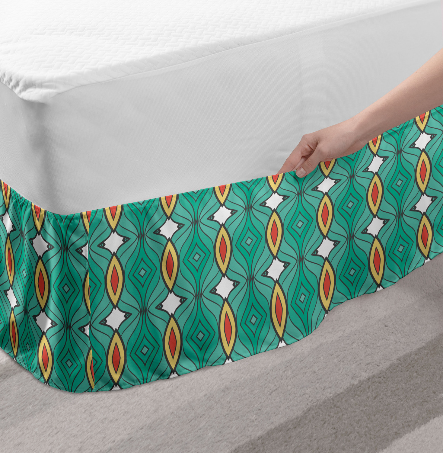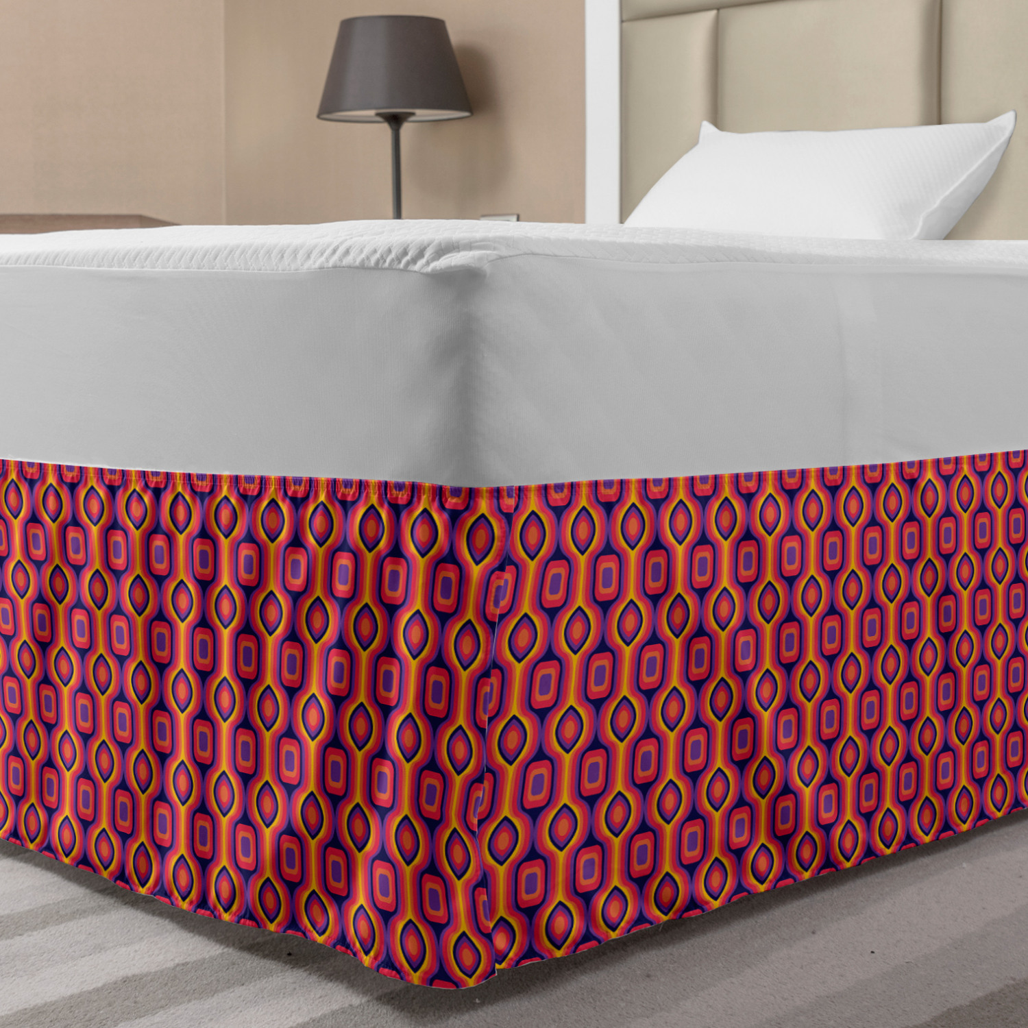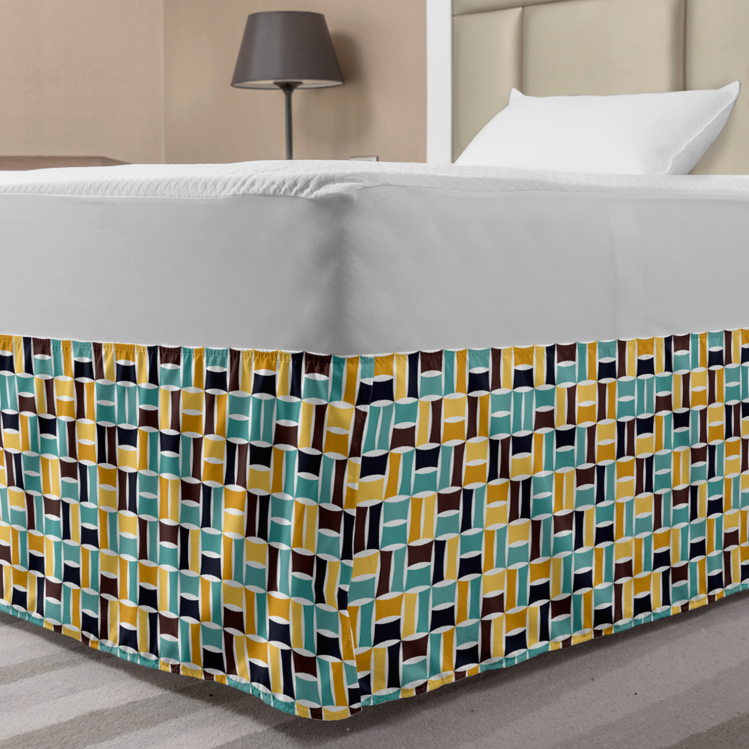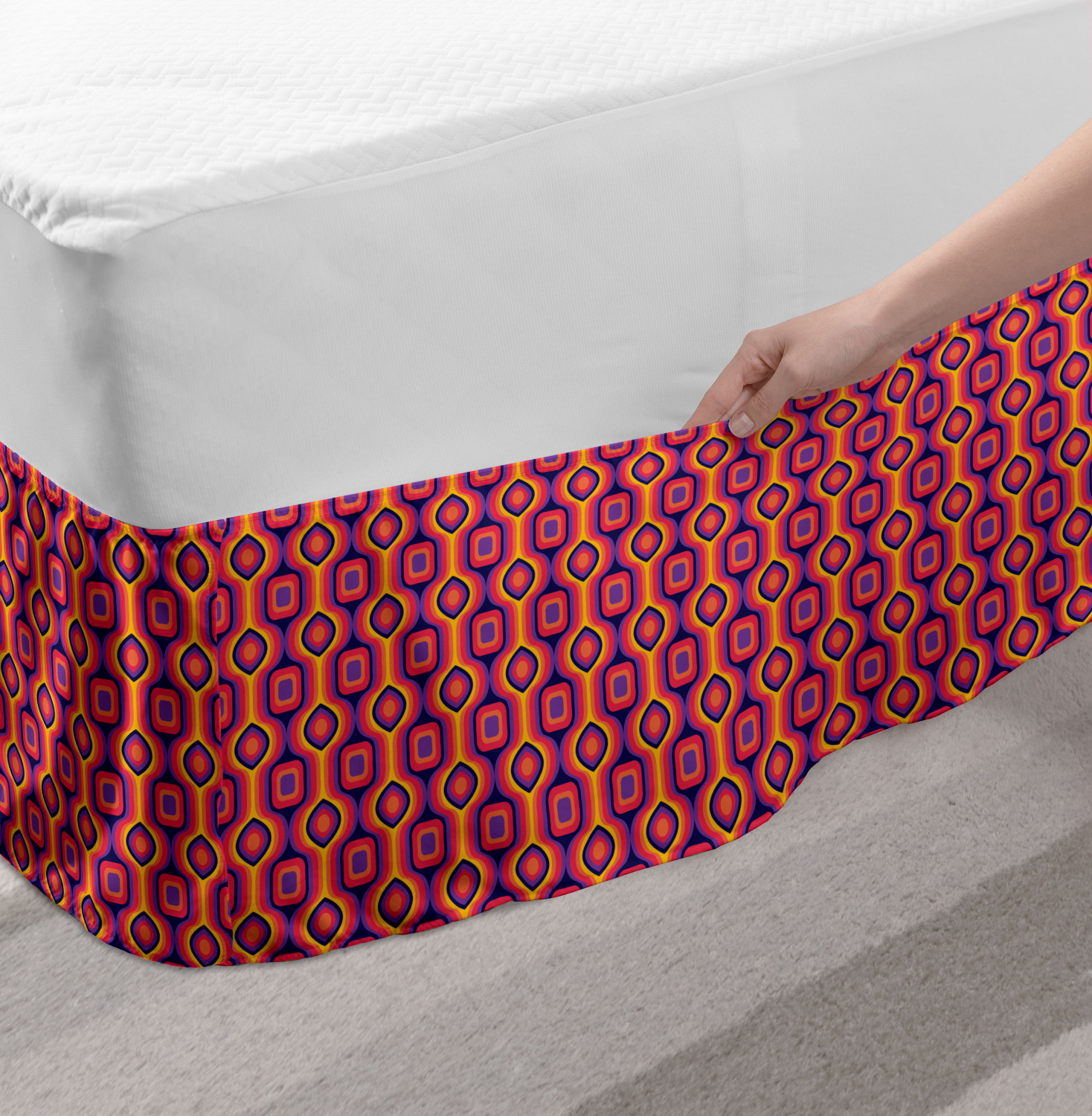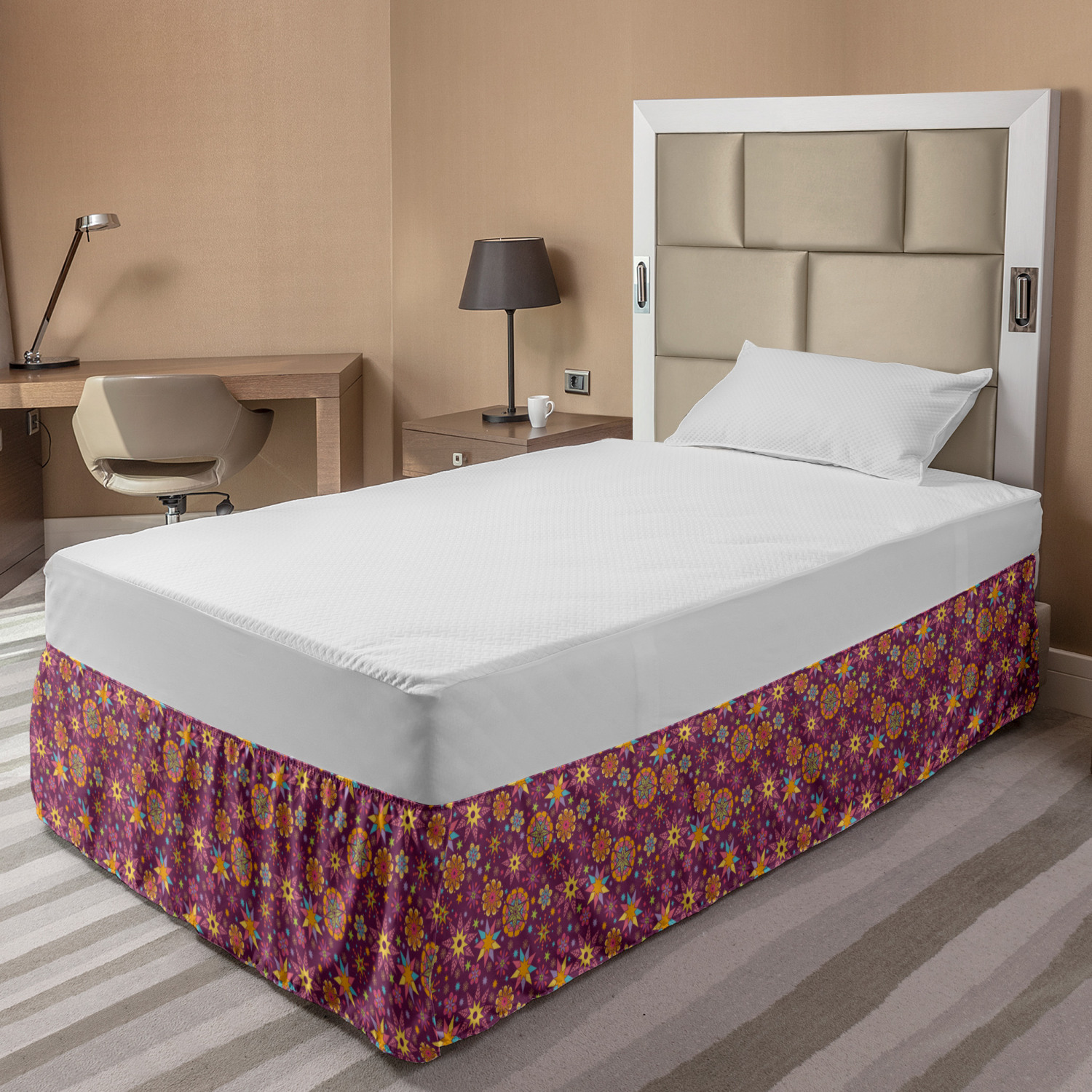 Ambesonne Absurd Pattern Bedskirt Elastic Wrap Around Skirt Gathered Design Ambesonne Bedskirt Bedroom Decor Wrap Around Elastic Bed Skirt Gathered Design In 4 sizes. 15 inches drop. All around wrap gathered. MADE IN TURKEY. MADE FROM - High quality 100% brushed soft microfiber fabric. Suitable for most types of beds. FEATURES - Install easily with elastic straps wrap under the mattress. Stays in place. Split corners. MACHINE WASHABLE - On cold cycle. Dryer safe and iron easy. No fading colors. For bedroom decor. PRINTED - With state of the art digital printing technology. Long-lasting bold colors & clear image. Change your bedroom's style with a simple touch of bedskirt! Our bedskirts are very easy to use; you can easily put around this elastic bed skirt and fasten up with straps under your mattress. Bring new energy to your master suite with colors and thousands of different patterns. You can easily match your bedding sets with our varied bed skirts. You can play safe and create vintage decor easily with these bed ruffles that belongs to retro-times. But you can ask for novelty and combine this piece with your modern choices. Our bed skirt is smartly designed with modern split corners. And you don't need to worry if it gets dusty or dirty. Just machine wash in the cold cycle and tumble dry on low. Thanks to new printing techniques the colors will not fade easily. Design a neat look for your bed with this gathered bed skirt. It is designed with a slim/low style ruffle to catch a more contemporary line. You can give these bed skirts as a Christmas, birthday, wedding gift, mother's day or house warming gift. It can be a great present for your mother, father, newly married friends, grandmother, aunt, uncle. The digital images we display have the most accurate color possible, however, due to differences in computer monitors, we cannot be responsible for variations in color between the actual product and your screen. Due to manual measurement, please kindly allow 1-2 cm discrepancy.