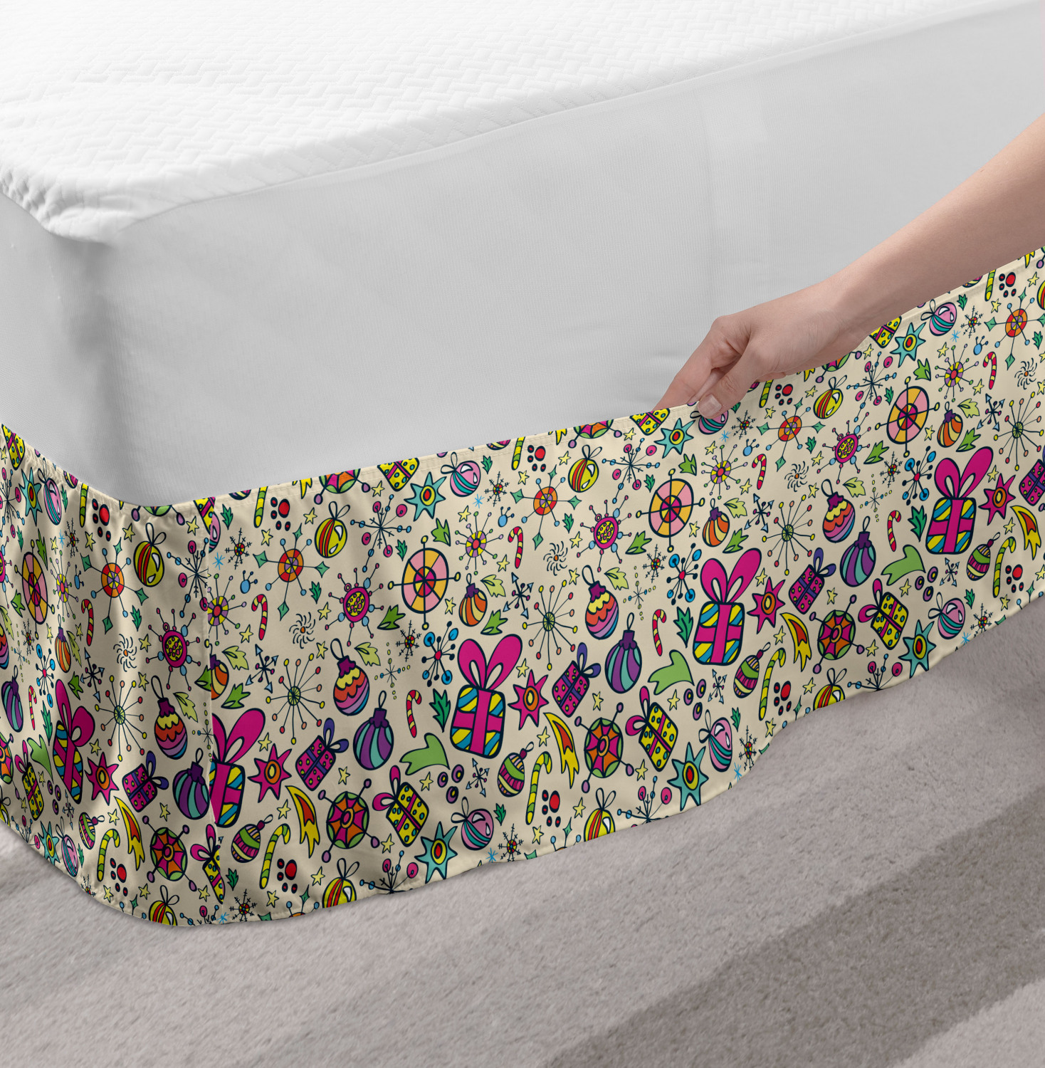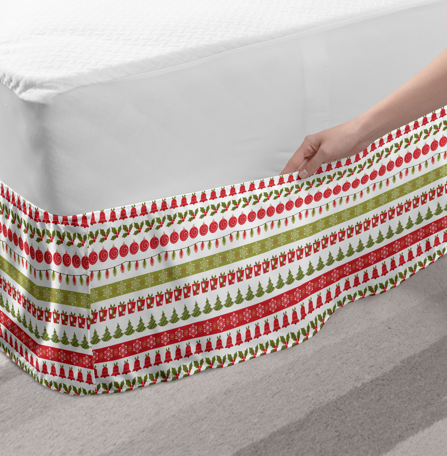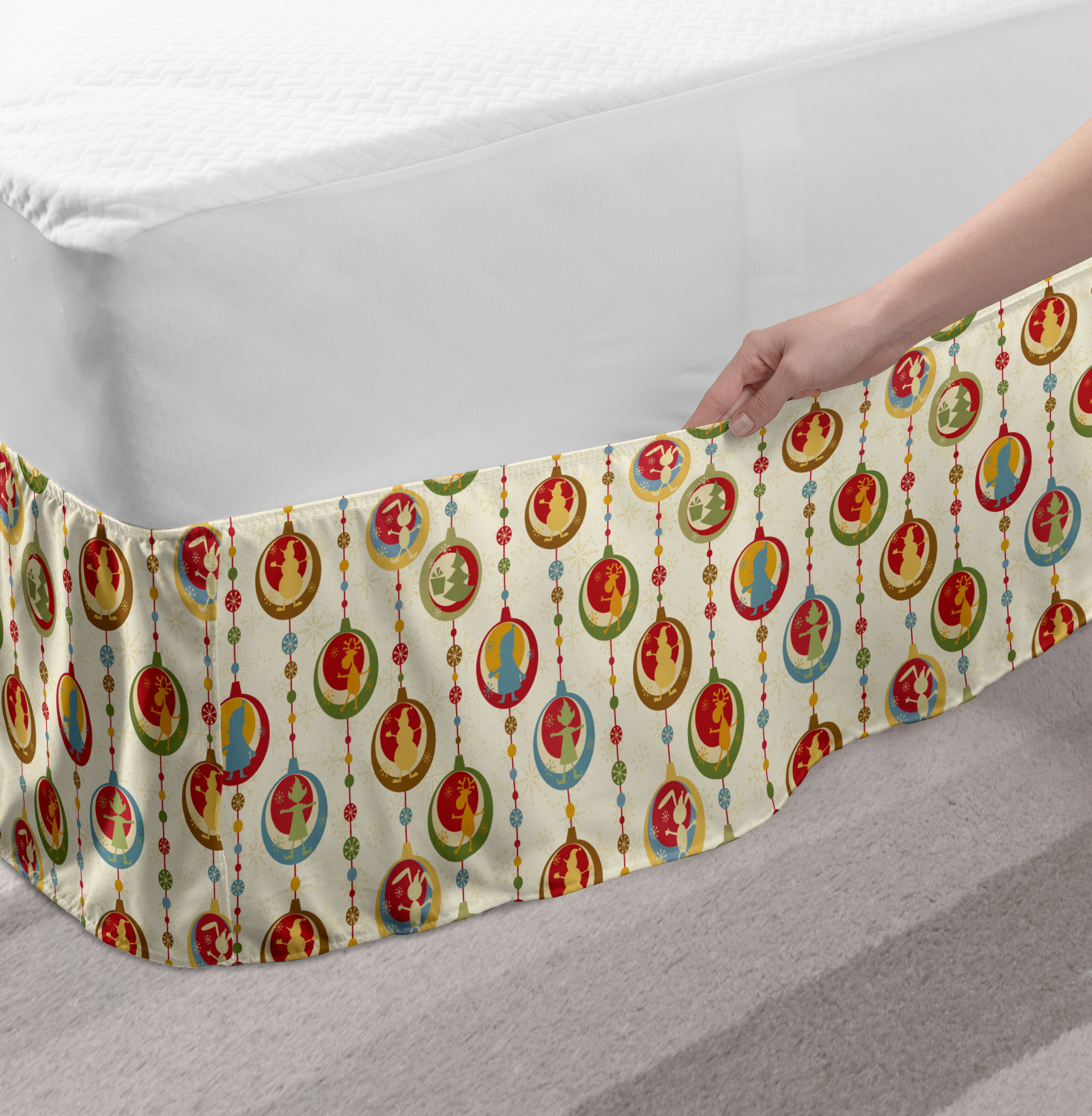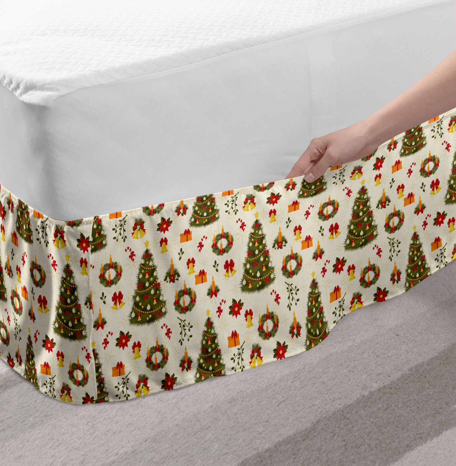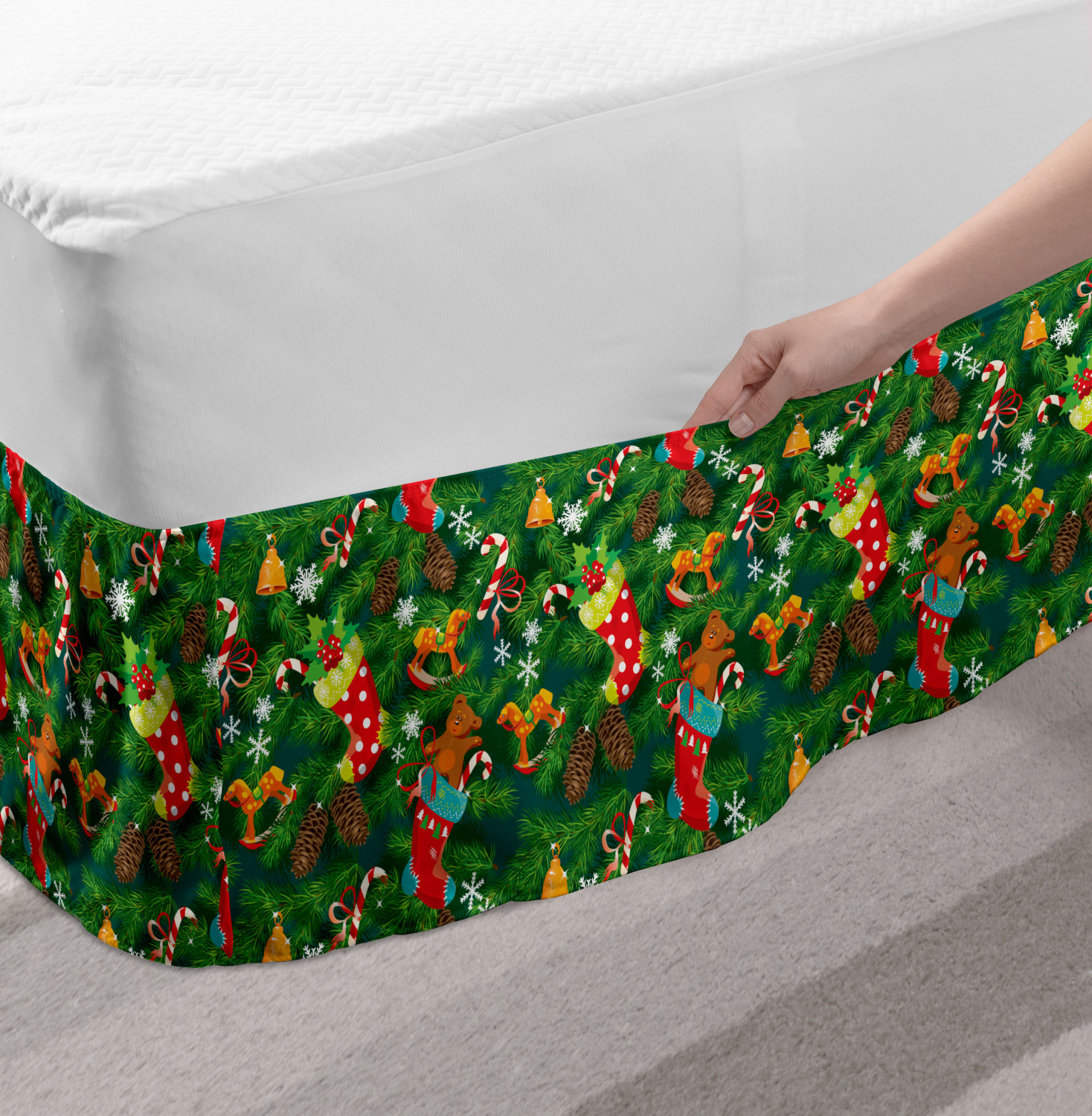 Ambesonne Christmas Print Bedskirt Elastic Wrap Around Skirt Gathered Design Ambesonne Bedskirt Bedroom Decor Wrap Around Elastic Bed Skirt Gathered Design In 4 sizes. 15 inches drop. All around wrap gathered. MADE IN TURKEY. MADE FROM - High quality 100% brushed soft microfiber fabric. Suitable for most types of beds. FEATURES - Install easily with elastic straps wrap under the mattress. Stays in place. Split corners. MACHINE WASHABLE - On cold cycle. Dryer safe and iron easy. No fading colors. For bedroom decor. PRINTED - With state of the art digital printing technology. Long-lasting bold colors & clear image. Change your bedroom's style with a simple touch of bedskirt! Our bedskirts are very easy to use; you can easily put around this elastic bed skirt and fasten up with straps under your mattress. Bring new energy to your master suite with colors and thousands of different patterns. You can easily match your bedding sets with our varied bed skirts. You can play safe and create vintage decor easily with these bed ruffles that belongs to retro-times. But you can ask for novelty and combine this piece with your modern choices. Our bed skirt is smartly designed with modern split corners. And you don't need to worry if it gets dusty or dirty. Just machine wash in the cold cycle and tumble dry on low. Thanks to new printing techniques the colors will not fade easily. Design a neat look for your bed with this gathered bed skirt. It is designed with a slim/low style ruffle to catch a more contemporary line. You can give these bed skirts as a Christmas, birthday, wedding gift, mother's day or house warming gift. It can be a great present for your mother, father, newly married friends, grandmother, aunt, uncle. The digital images we display have the most accurate color possible, however, due to differences in computer monitors, we cannot be responsible for variations in color between the actual product and your screen. Due to manual measurement, please kindly allow 1-2 cm discrepancy.