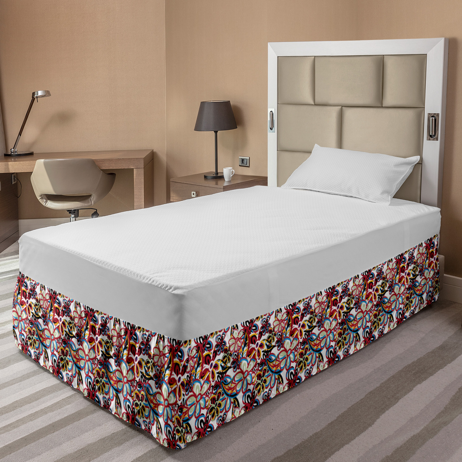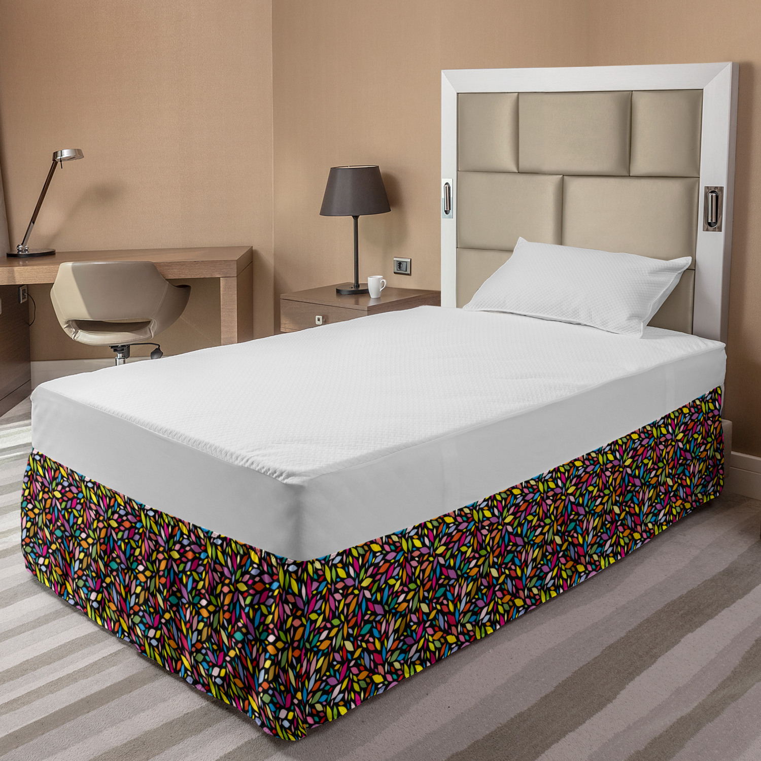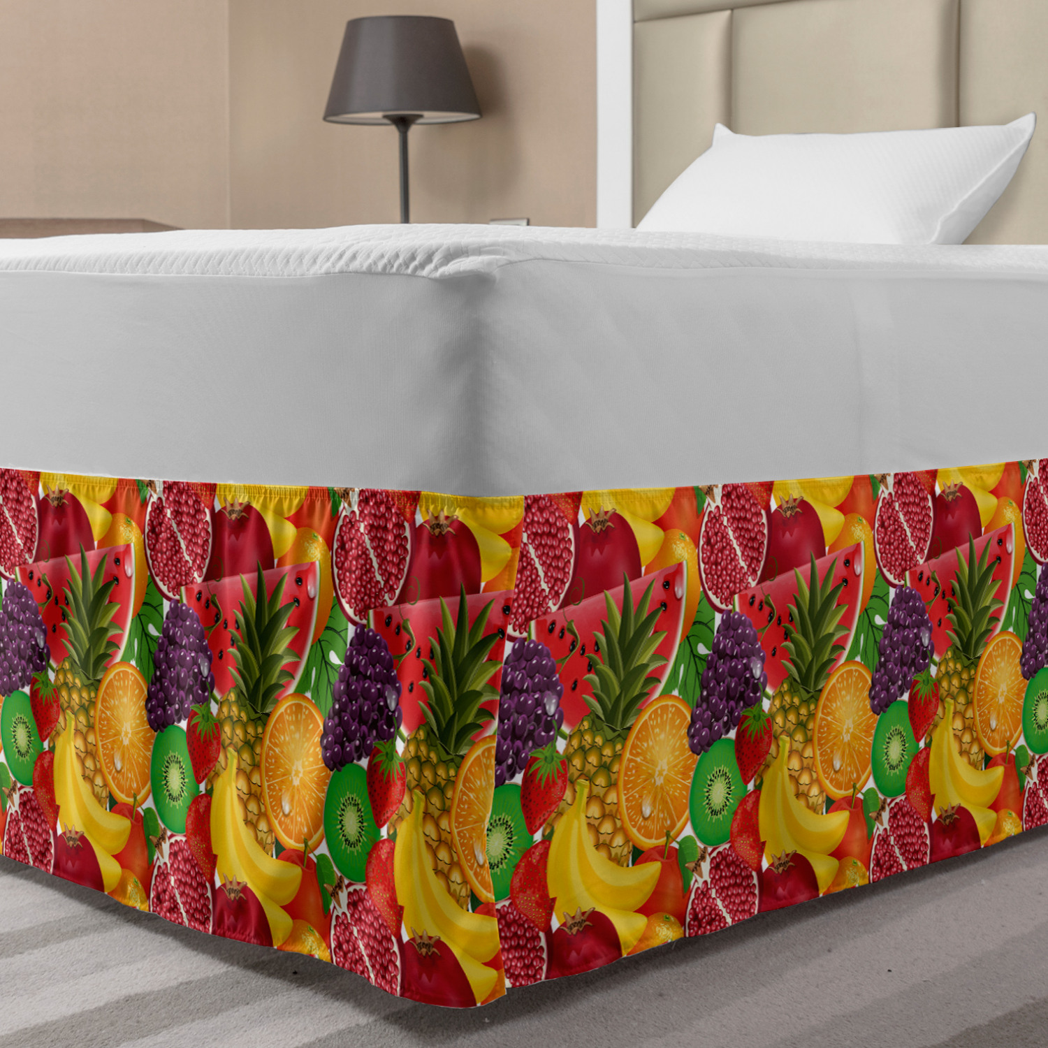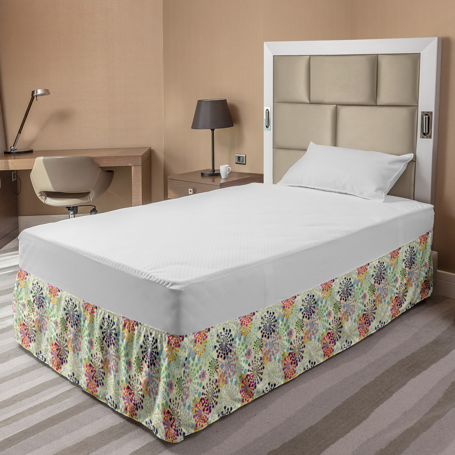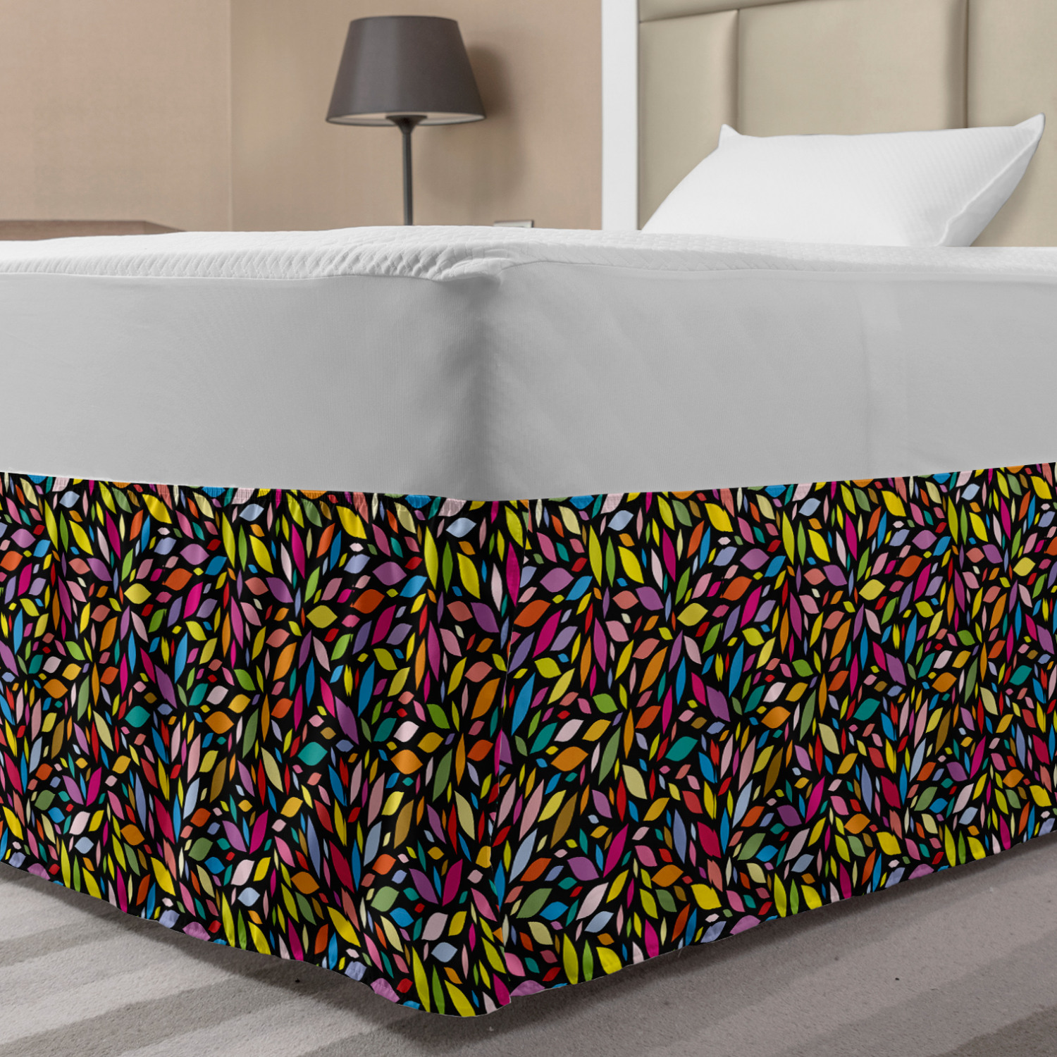 Ambesonne Colorful Theme Bedskirt Elastic Wrap Around Skirt Gathered Design Ambesonne Bedskirt Bedroom Decor Wrap Around Elastic Bed Skirt Gathered Design In 4 sizes. 15 inches drop. All around wrap gathered. MADE IN TURKEY. MADE FROM - High quality 100% brushed soft microfiber fabric. Suitable for most types of beds. FEATURES - Install easily with elastic straps wrap under the mattress. Stays in place. Split corners. MACHINE WASHABLE - On cold cycle. Dryer safe and iron easy. No fading colors. For bedroom decor. PRINTED - With state of the art digital printing technology. Long-lasting bold colors & clear image. Change your bedroom's style with a simple touch of bedskirt! Our bedskirts are very easy to use; you can easily put around this elastic bed skirt and fasten up with straps under your mattress. Bring new energy to your master suite with colors and thousands of different patterns. You can easily match your bedding sets with our varied bed skirts. You can play safe and create vintage decor easily with these bed ruffles that belongs to retro-times. But you can ask for novelty and combine this piece with your modern choices. Our bed skirt is smartly designed with modern split corners. And you don't need to worry if it gets dusty or dirty. Just machine wash in the cold cycle and tumble dry on low. Thanks to new printing techniques the colors will not fade easily. Design a neat look for your bed with this gathered bed skirt. It is designed with a slim/low style ruffle to catch a more contemporary line. You can give these bed skirts as a Christmas, birthday, wedding gift, mother's day or house warming gift. It can be a great present for your mother, father, newly married friends, grandmother, aunt, uncle. The digital images we display have the most accurate color possible, however, due to differences in computer monitors, we cannot be responsible for variations in color between the actual product and your screen. Due to manual measurement, please kindly allow 1-2 cm discrepancy.
