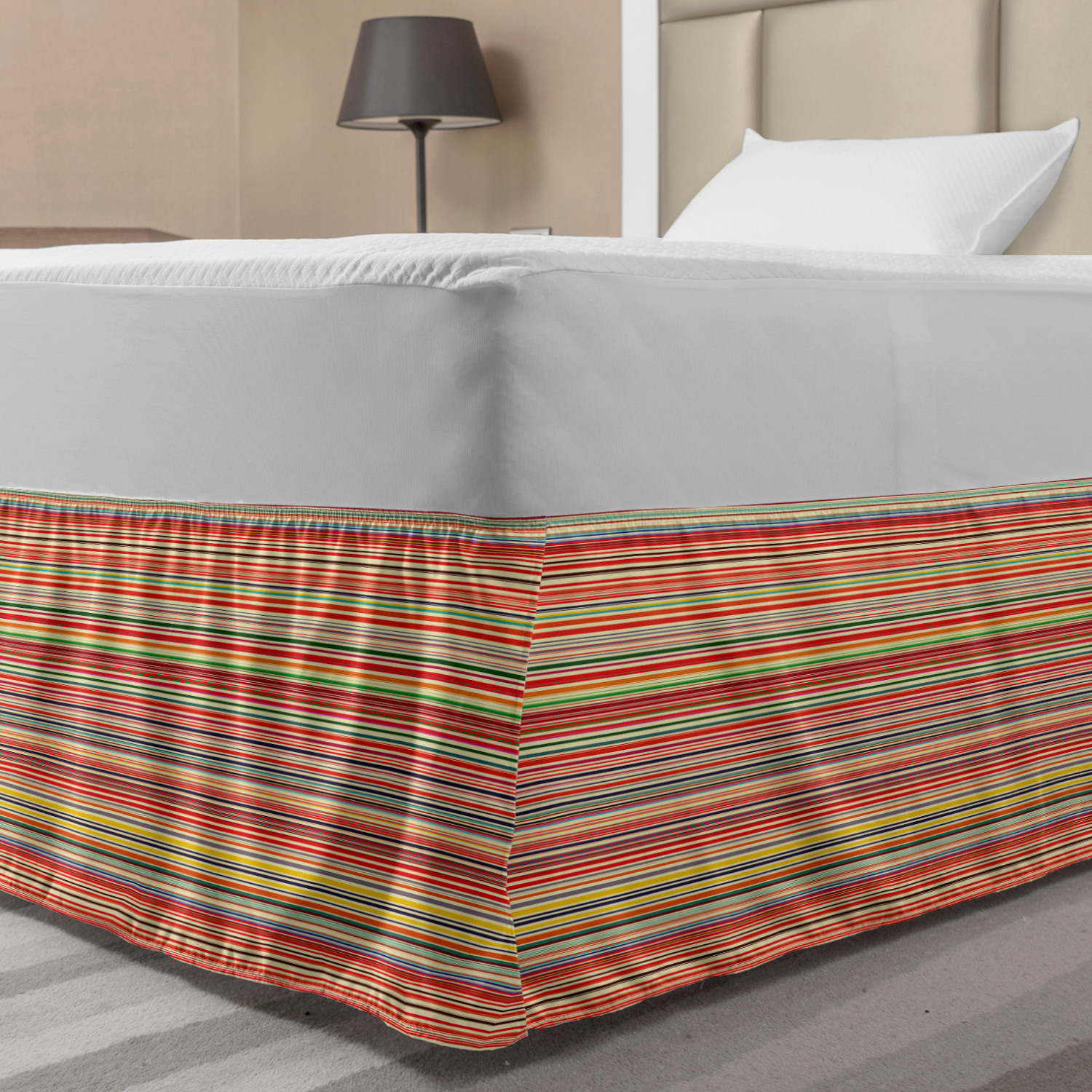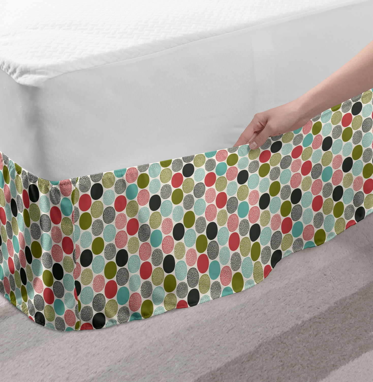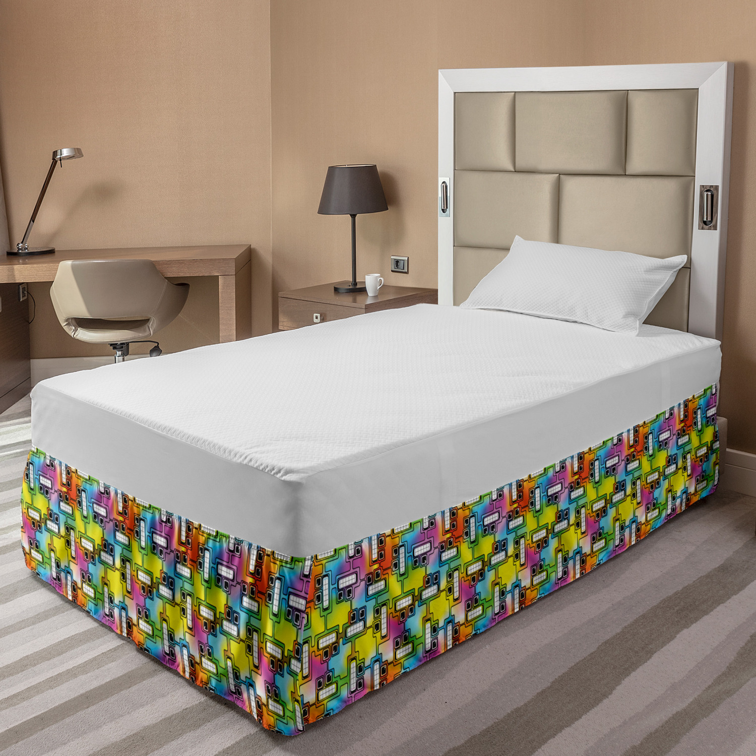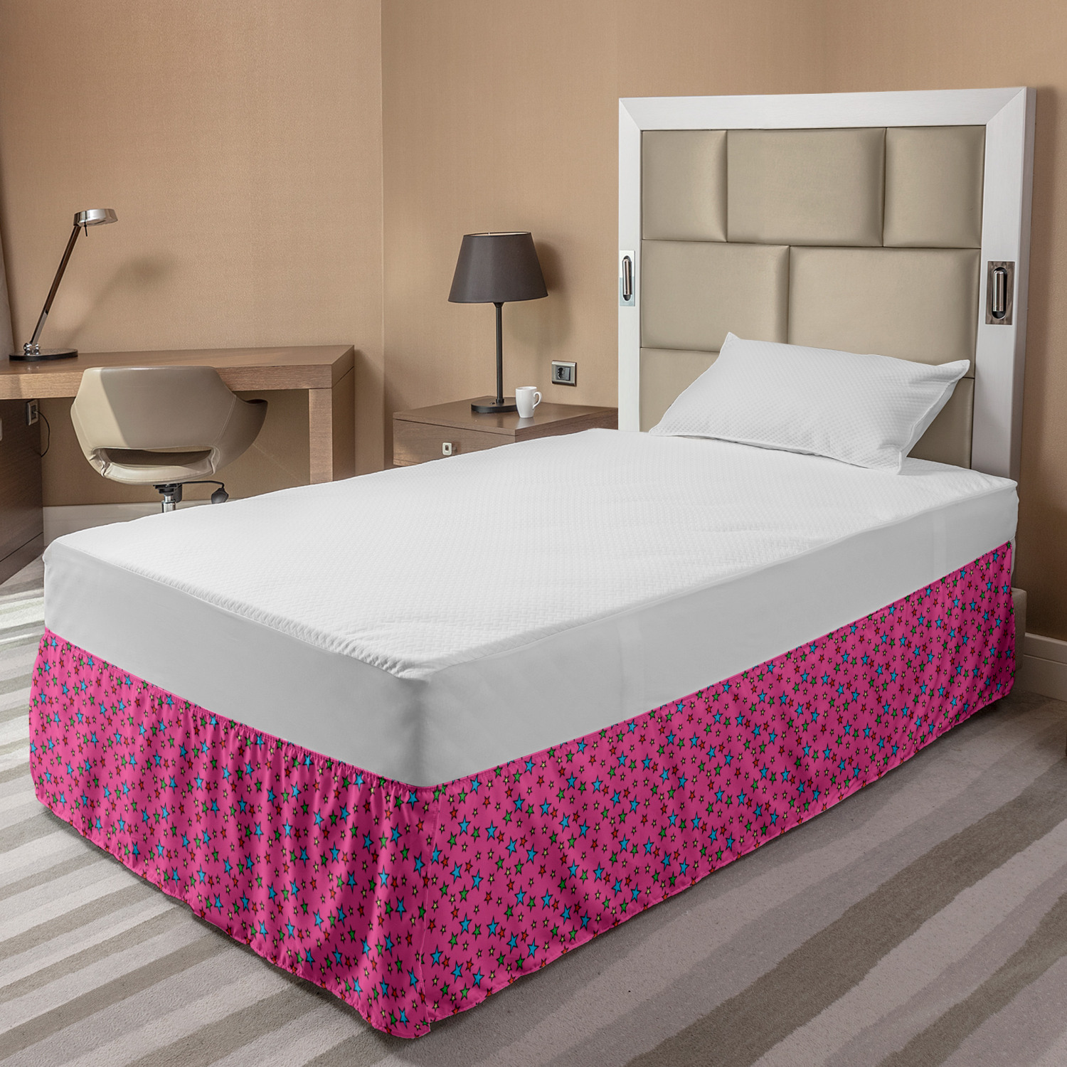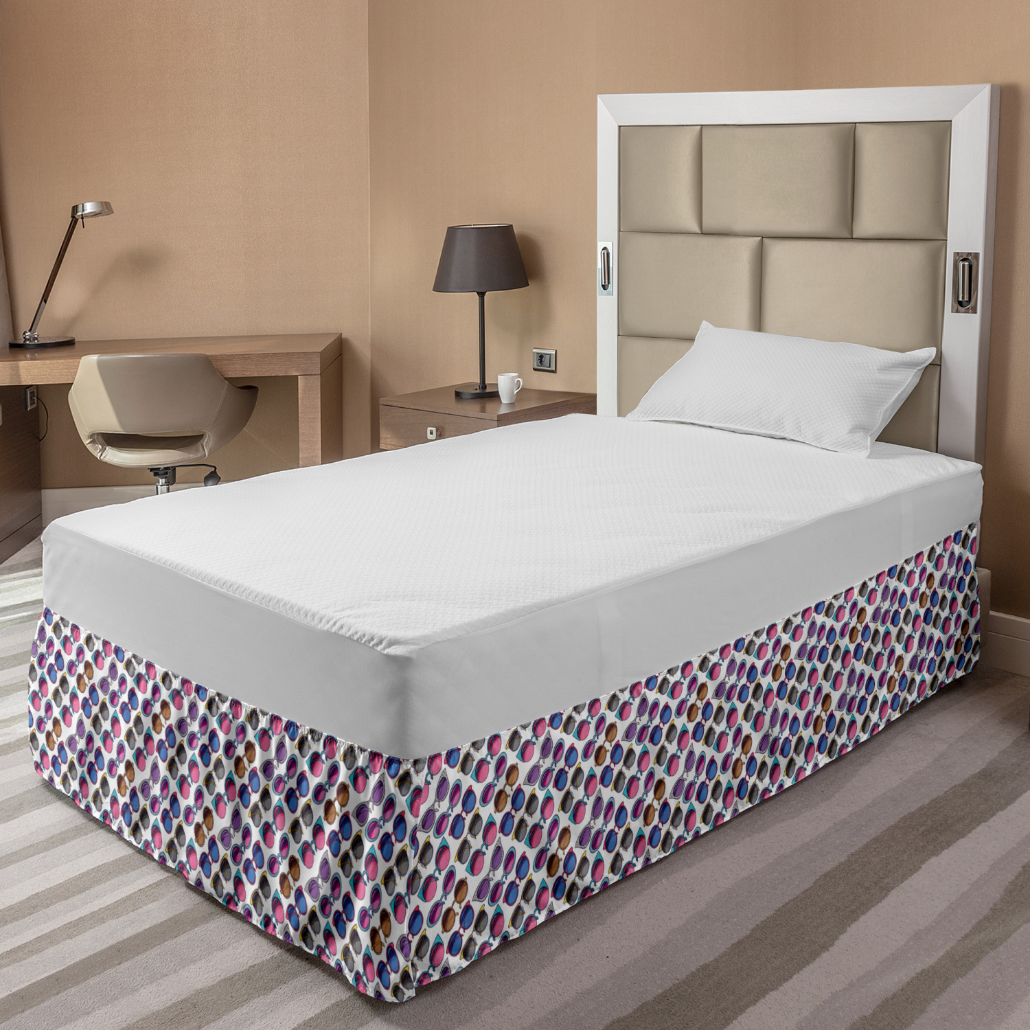 Ambesonne Colorful Theme Bedskirt Elastic Wrap Around Skirt Gathered Design Ambesonne Bedskirt Bedroom Decor Wrap Around Elastic Bed Skirt Gathered Design In 4 sizes. 15 inches drop. All around wrap gathered. MADE IN TURKEY. MADE FROM - High quality 100% brushed soft microfiber fabric. Suitable for most types of beds. FEATURES - Install easily with elastic straps wrap under the mattress. Stays in place. Split corners. MACHINE WASHABLE - On cold cycle. Dryer safe and iron easy. No fading colors. For bedroom decor. PRINTED - With state of the art digital printing technology. Long-lasting bold colors & clear image. Change your bedroom's style with a simple touch of bedskirt! Our bedskirts are very easy to use; you can easily put around this elastic bed skirt and fasten up with straps under your mattress. Bring new energy to your master suite with colors and thousands of different patterns. You can easily match your bedding sets with our varied bed skirts. You can play safe and create vintage decor easily with these bed ruffles that belongs to retro-times. But you can ask for novelty and combine this piece with your modern choices. Our bed skirt is smartly designed with modern split corners. And you don't need to worry if it gets dusty or dirty. Just machine wash in the cold cycle and tumble dry on low. Thanks to new printing techniques the colors will not fade easily. Design a neat look for your bed with this gathered bed skirt. It is designed with a slim/low style ruffle to catch a more contemporary line. You can give these bed skirts as a Christmas, birthday, wedding gift, mother's day or house warming gift. It can be a great present for your mother, father, newly married friends, grandmother, aunt, uncle. The digital images we display have the most accurate color possible, however, due to differences in computer monitors, we cannot be responsible for variations in color between the actual product and your screen. Due to manual measurement, please kindly allow 1-2 cm discrepancy.