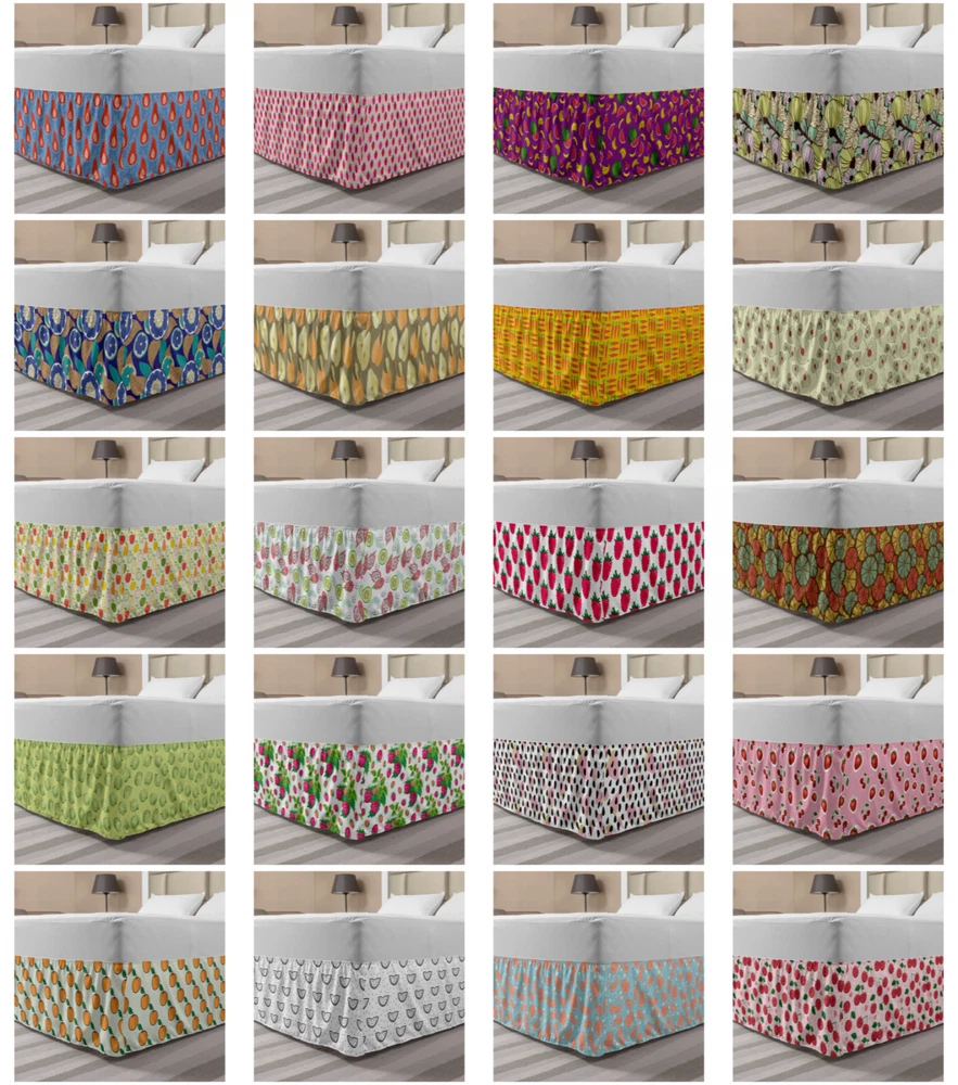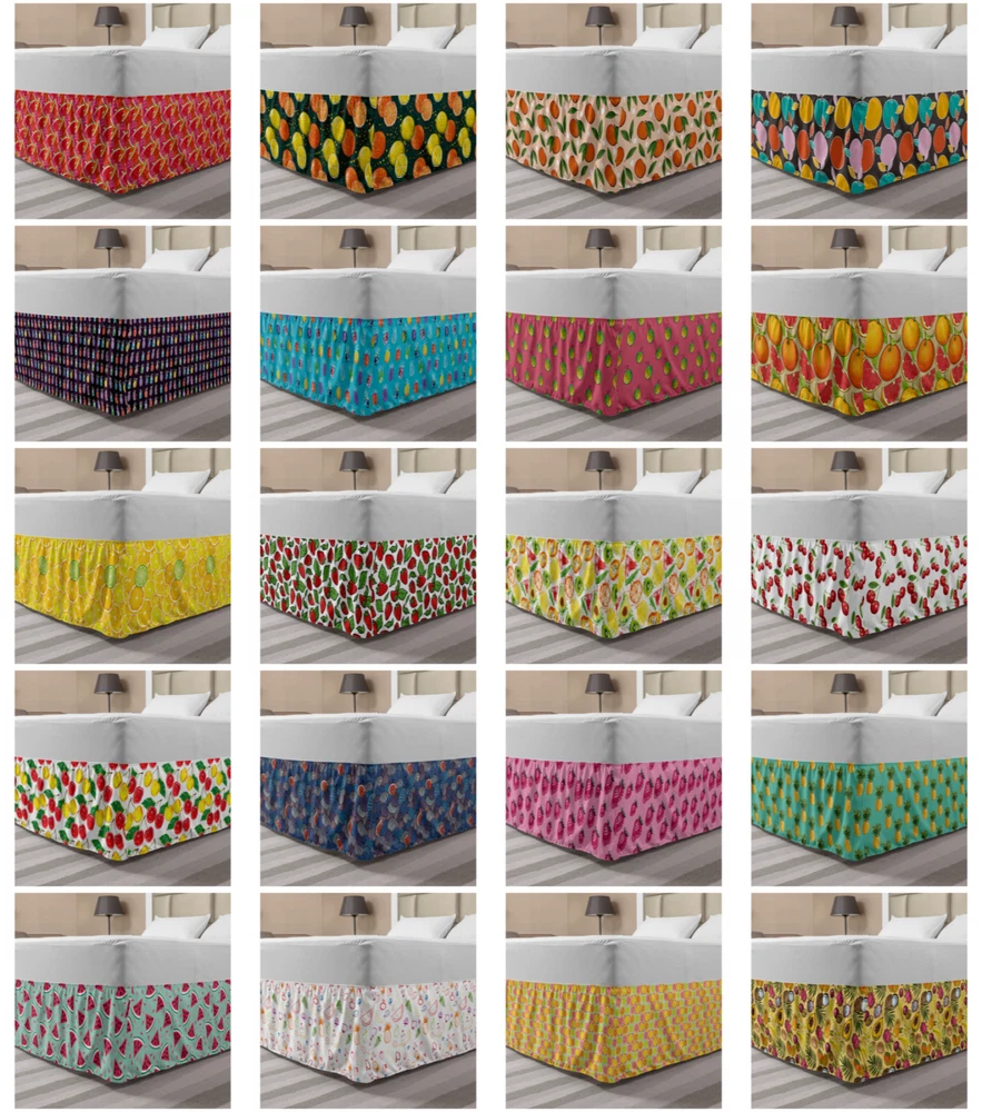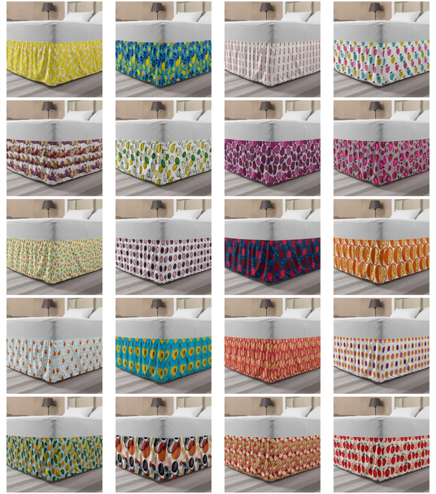 Ambesonne Fruit Art Bedskirt Elastic Wrap Around Skirt Gathered Design Ambesonne Bedskirt Bedroom Decor Wrap Around Elastic Bed Skirt Gathered Design In 4 sizes. 15 inches drop. All around wrap gathered. MADE IN TURKEY. MADE FROM - High quality 100% brushed soft microfiber fabric. Suitable for most types of beds. FEATURES - Install easily with elastic straps wrap under the mattress. Stays in place. Split corners. MACHINE WASHABLE - On cold cycle. Dryer safe and iron easy. No fading colors. For bedroom decor. PRINTED - With state of the art digital printing technology. Long-lasting bold colors & clear image. Change your bedroom's style with a simple touch of bedskirt! Our bedskirts are very easy to use; you can easily put around this elastic bed skirt and fasten up with straps under your mattress. Bring new energy to your master suite with colors and thousands of different patterns. You can easily match your bedding sets with our varied bed skirts. You can play safe and create vintage decor easily with these bed ruffles that belongs to retro-times. But you can ask for novelty and combine this piece with your modern choices. Our bed skirt is smartly designed with modern split corners. And you don't need to worry if it gets dusty or dirty. Just machine wash in the cold cycle and tumble dry on low. Thanks to new printing techniques the colors will not fade easily. Design a neat look for your bed with this gathered bed skirt. It is designed with a slim/low style ruffle to catch a more contemporary line. You can give these bed skirts as a Christmas, birthday, wedding gift, mother's day or house warming gift. It can be a great present for your mother, father, newly married friends, grandmother, aunt, uncle. The digital images we display have the most accurate color possible, however, due to differences in computer monitors, we cannot be responsible for variations in color between the actual product and your screen. Due to manual measurement, please kindly allow 1-2 cm discrepancy.