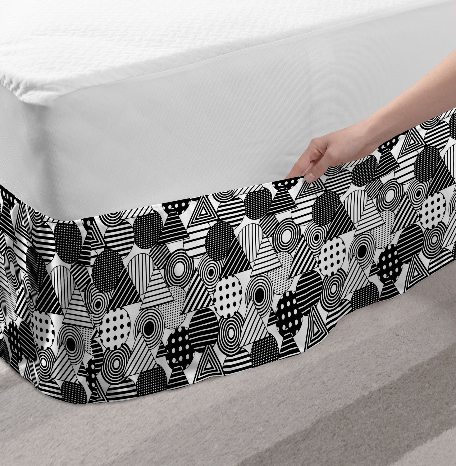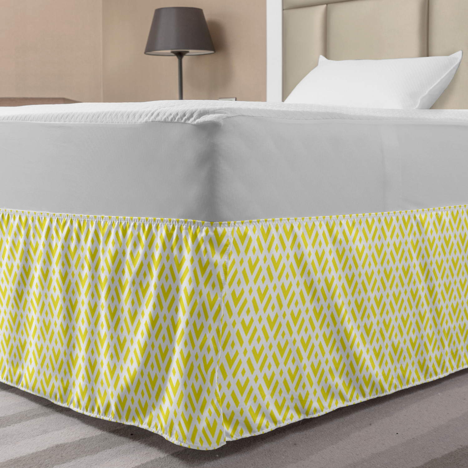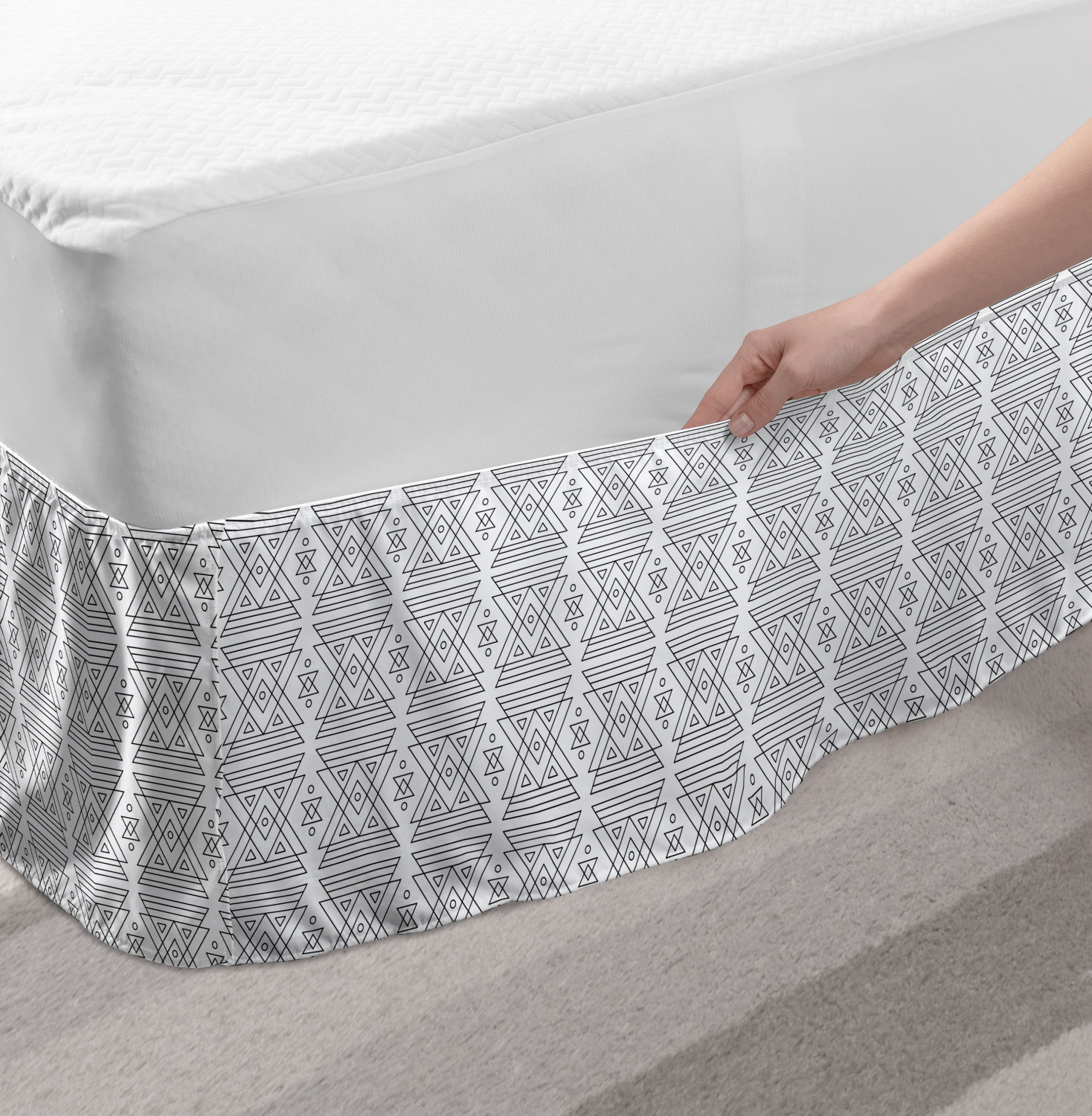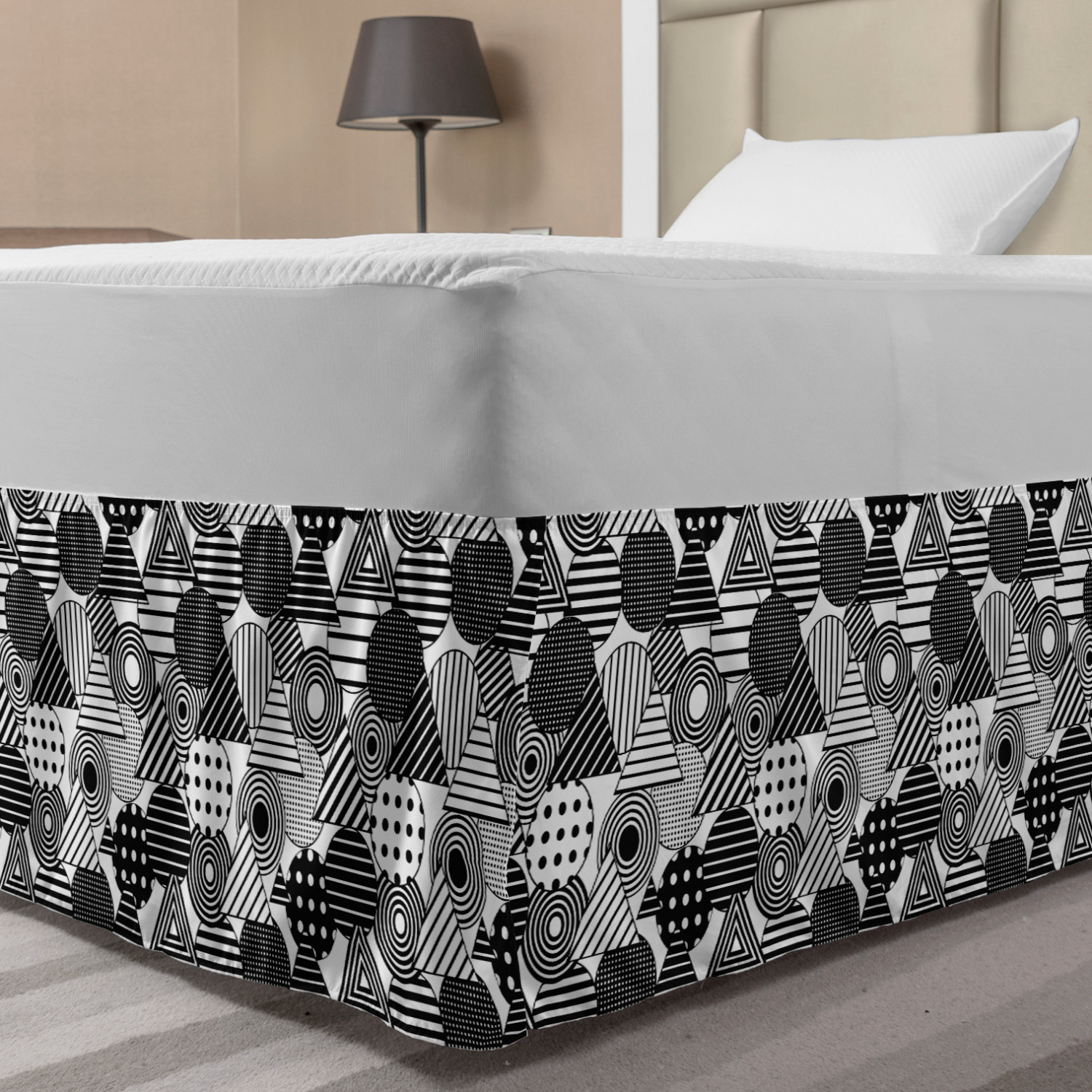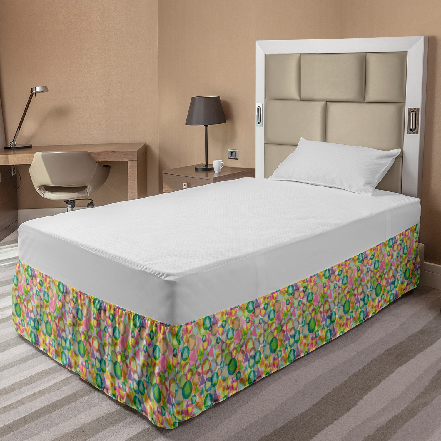 Ambesonne Geometric Items Bedskirt Elastic Wrap Around Skirt Gathered Design Ambesonne Bedskirt Bedroom Decor Wrap Around Elastic Bed Skirt Gathered Design In 4 sizes. 15 inches drop. All around wrap gathered. MADE IN TURKEY. MADE FROM - High quality 100% brushed soft microfiber fabric. Suitable for most types of beds. FEATURES - Install easily with elastic straps wrap under the mattress. Stays in place. Split corners. MACHINE WASHABLE - On cold cycle. Dryer safe and iron easy. No fading colors. For bedroom decor. PRINTED - With state of the art digital printing technology. Long-lasting bold colors & clear image. Change your bedroom's style with a simple touch of bedskirt! Our bedskirts are very easy to use; you can easily put around this elastic bed skirt and fasten up with straps under your mattress. Bring new energy to your master suite with colors and thousands of different patterns. You can easily match your bedding sets with our varied bed skirts. You can play safe and create vintage decor easily with these bed ruffles that belongs to retro-times. But you can ask for novelty and combine this piece with your modern choices. Our bed skirt is smartly designed with modern split corners. And you don't need to worry if it gets dusty or dirty. Just machine wash in the cold cycle and tumble dry on low. Thanks to new printing techniques the colors will not fade easily. Design a neat look for your bed with this gathered bed skirt. It is designed with a slim/low style ruffle to catch a more contemporary line. You can give these bed skirts as a Christmas, birthday, wedding gift, mother's day or house warming gift. It can be a great present for your mother, father, newly married friends, grandmother, aunt, uncle. The digital images we display have the most accurate color possible, however, due to differences in computer monitors, we cannot be responsible for variations in color between the actual product and your screen. Due to manual measurement, please kindly allow 1-2 cm discrepancy.