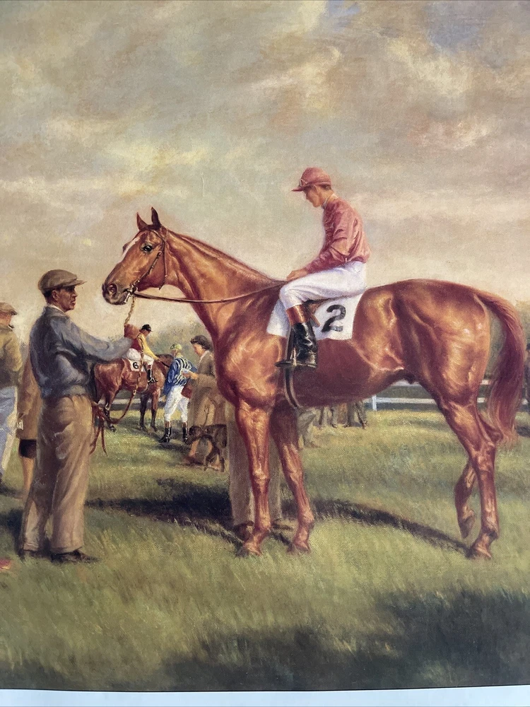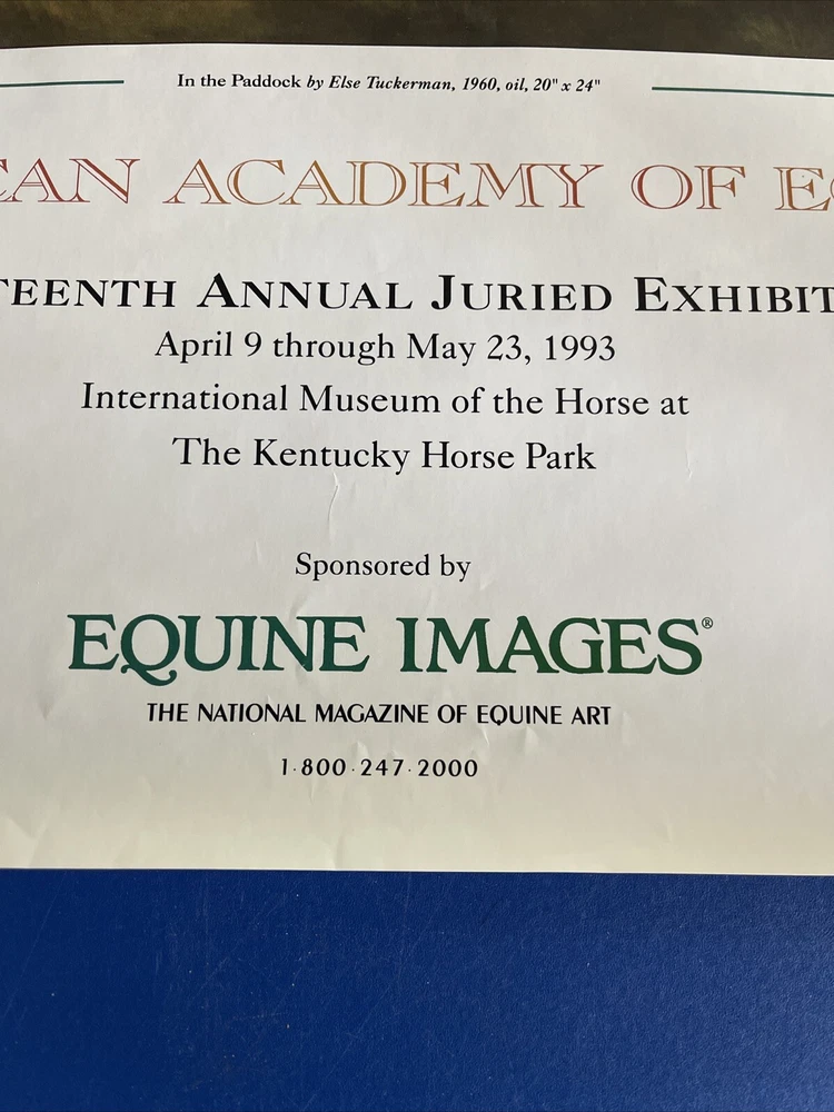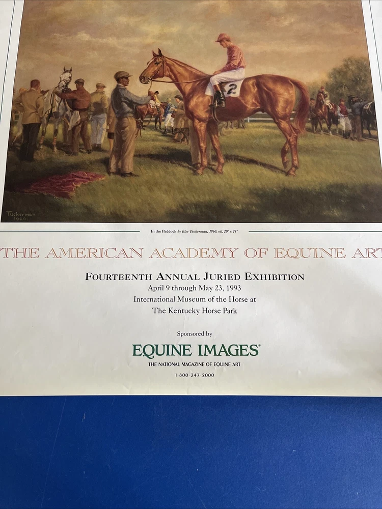 This exquisite print from the American Academy of Equine Art is a true masterpiece. Created in 1993, it showcases the beauty of horse racing in stunning Americana style. Measuring 24 inches in height and 22 inches in width, this print is perfect for any art lover who admires equine art. Featuring a striking lithograph of a horse racing scene, this print is a must-have for any art collection. Its high-quality production and attention to detail make it a true work of art. Add this stunning piece to your collection today and enjoy the beauty of horse racing in all its glory. In good condition, will be rolled and shipped in tube.