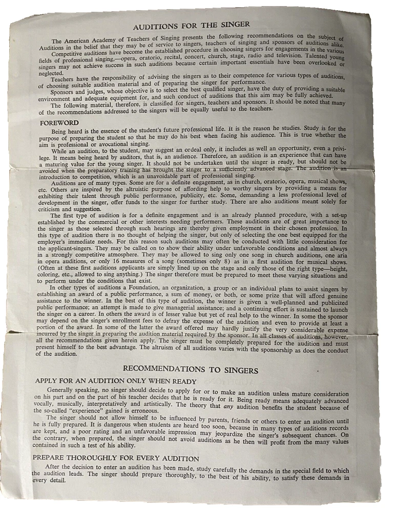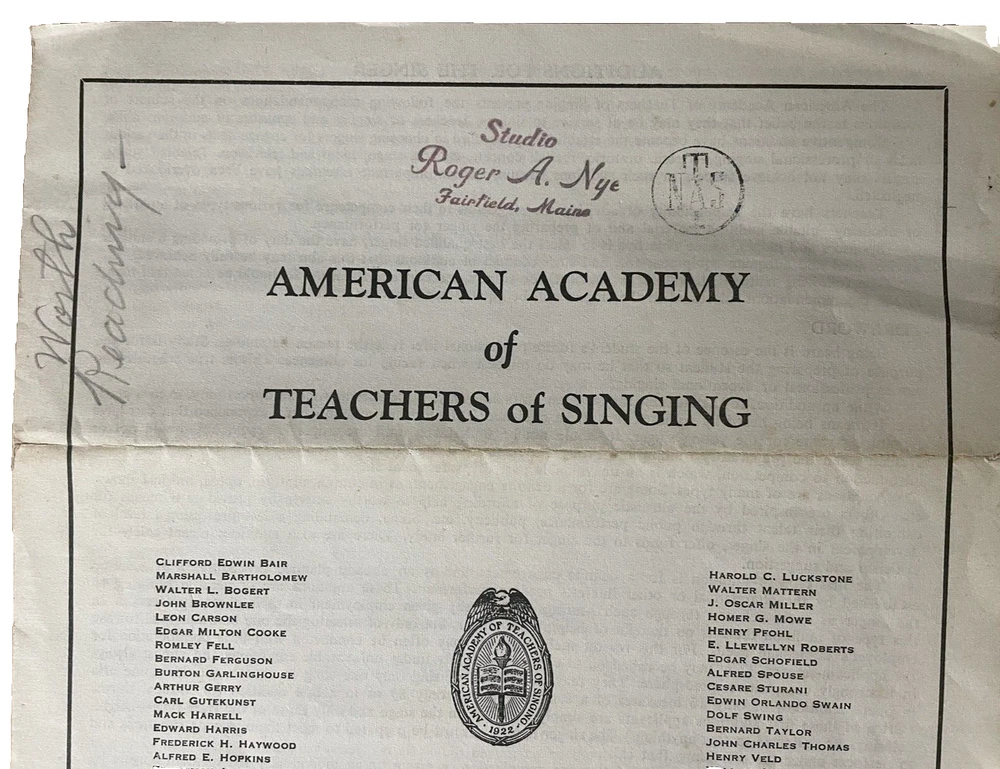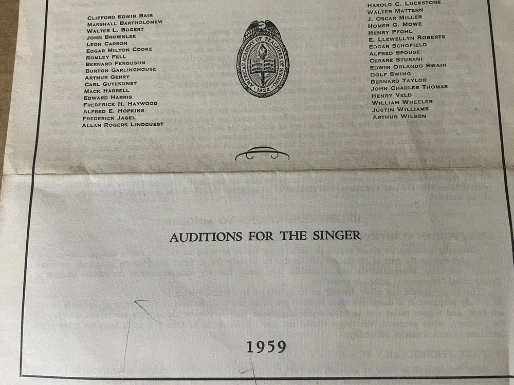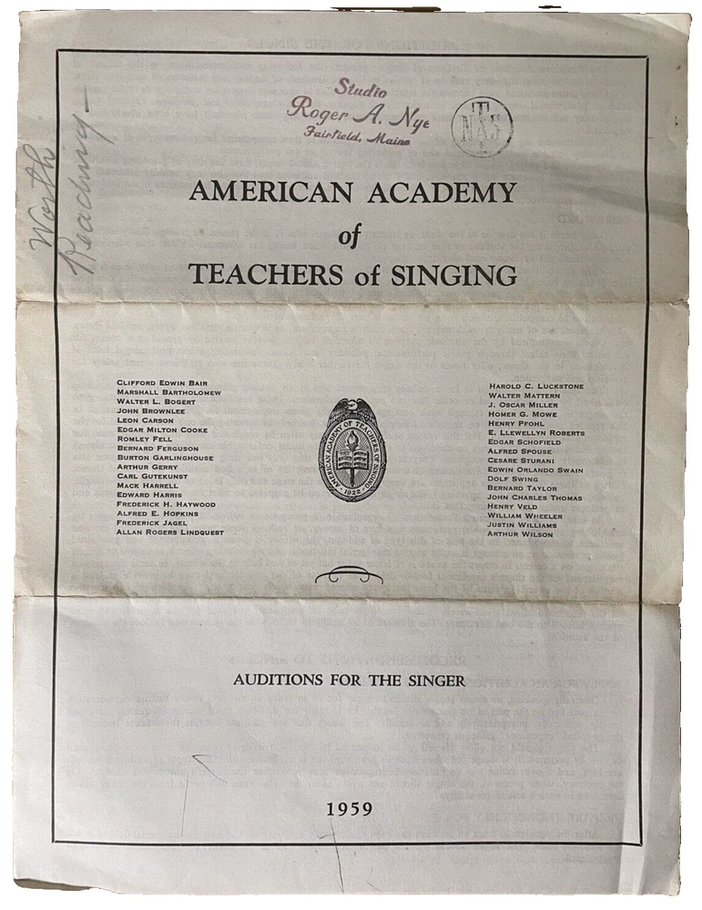 This pamphlet from 1959 showcases the American Academy of Teachers of Singing Auditions for the Singer. It provides valuable information on the auditions and the process for singers looking to participate. The pamphlet hails from the United States and is a wonderful collectible for anyone interested in singing and vocal performance. It is a piece of ephemera that captures a moment in time, providing a glimpse into the world of singing in the late 1950s. The pamphlet is in good condition and will be a great addition to any collection of vintage paper memorabilia. Get your hands on this rare gem today! ATTS Logo, Stamped Roger A. Nye, Fairfield Maine Please see pics of actual item being sold. We do not use stock photos. Please consider visiting our eBay Store with over 1400 antique and vintage items. Save us as a FAVORITE as we add new items weekly. Stop back soon.