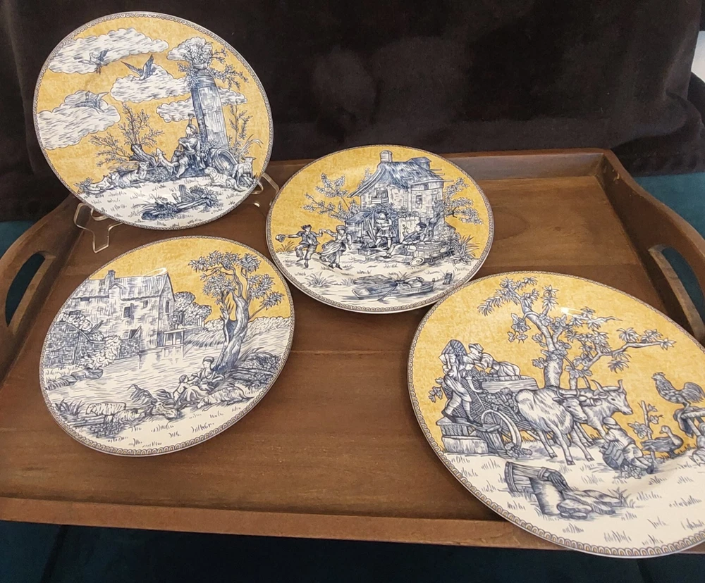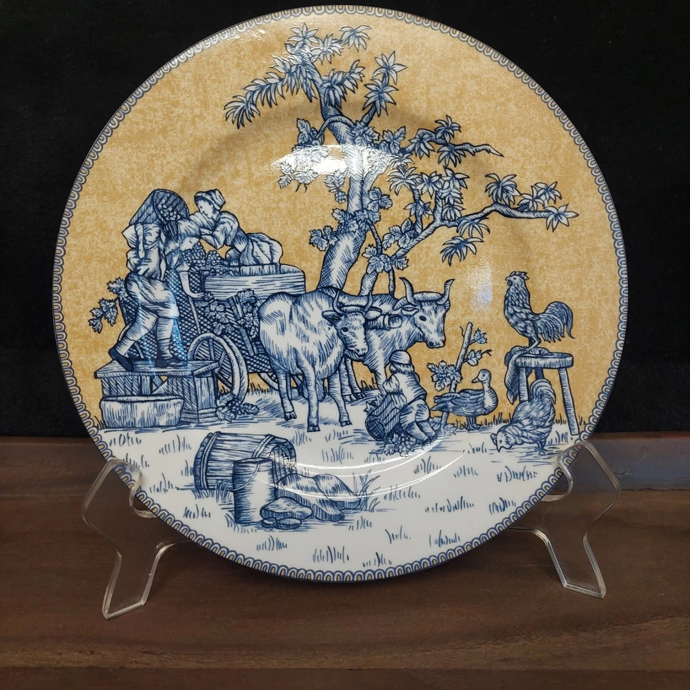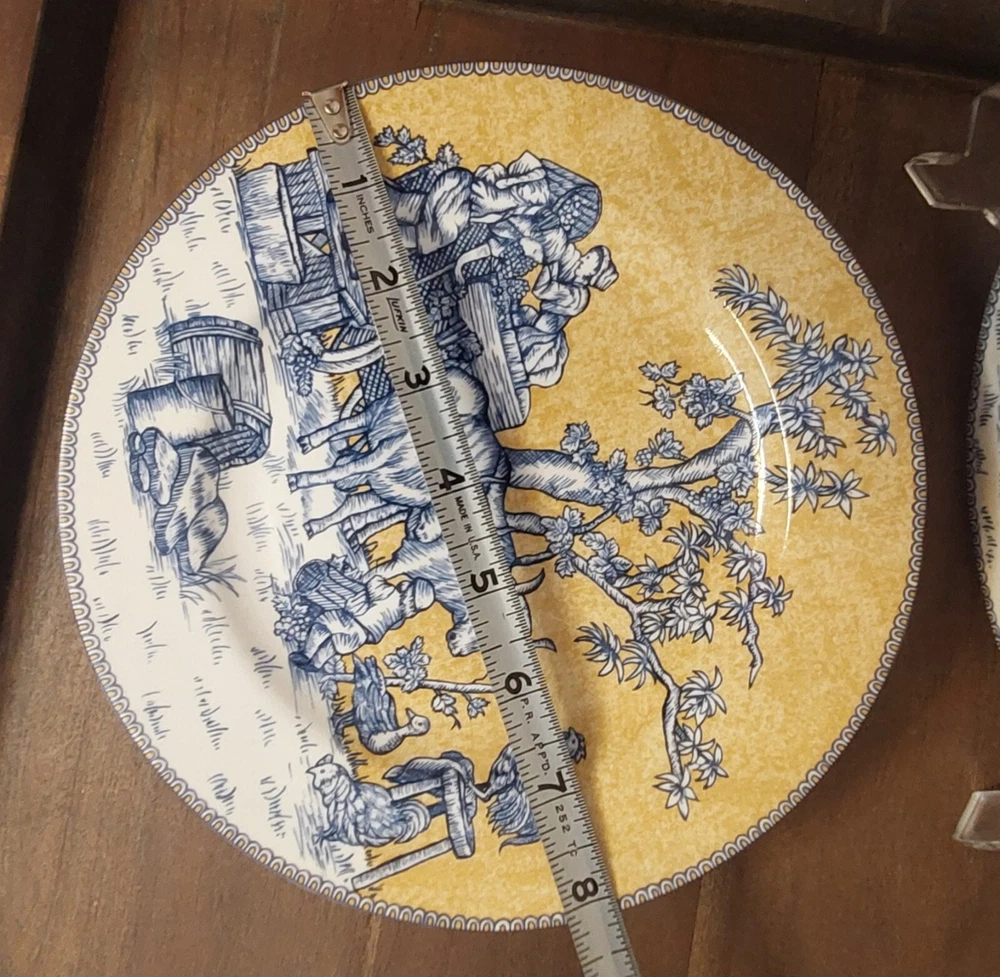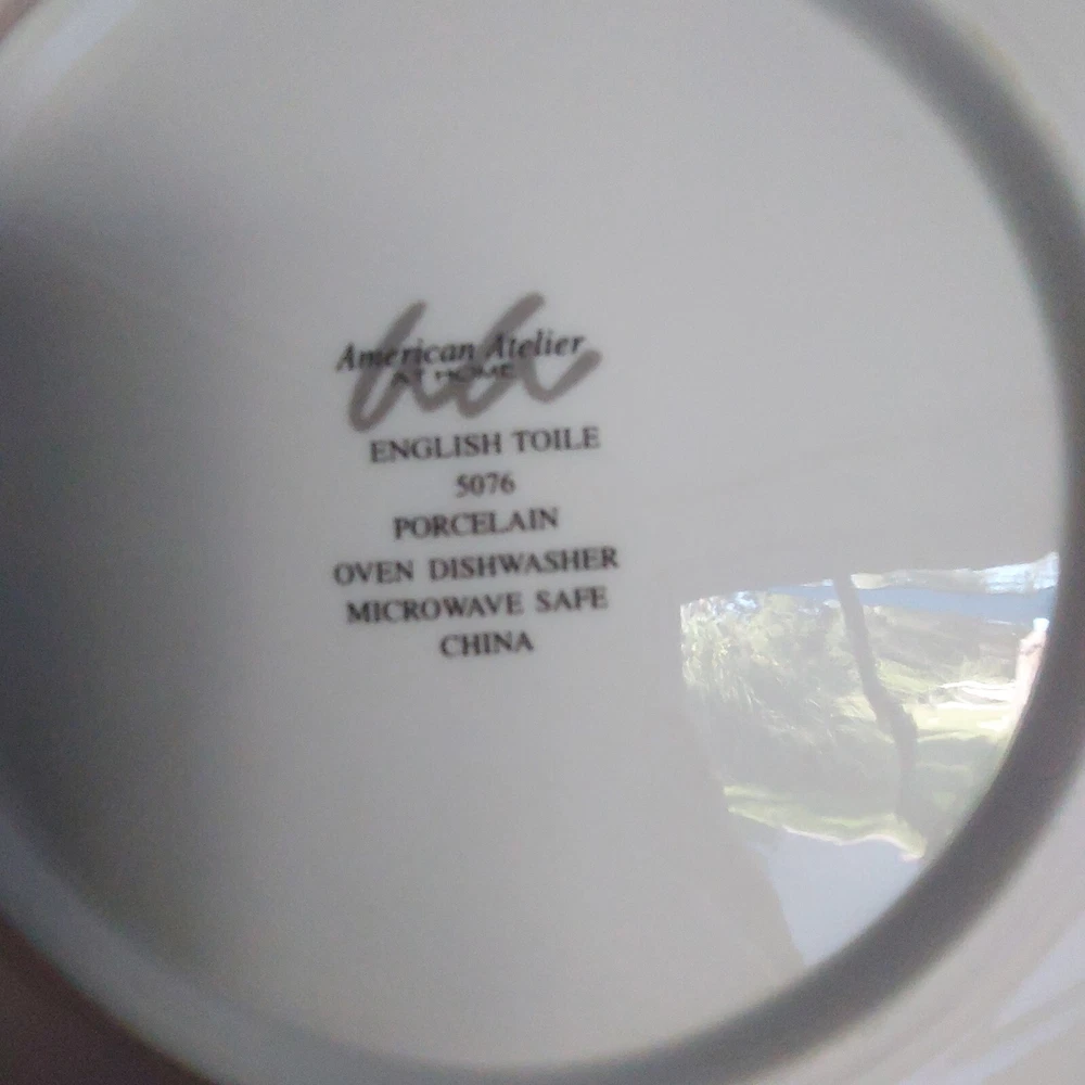 Add a touch of sophistication to your dining table with this set of four American Atelier At Home English Toile Blue Yellow Salad Plates. The round plates are made of high-quality porcelain and feature a beautiful country blue design. The set is perfect for all occasions and is microwave and dishwasher safe for easy maintenance. Each plate in the set measures 8.25 inches in diameter and has a printed backstamp. The plates are an original production of American Atelier and were manufactured in China using pottery production techniques. The set includes four plates and is ideal for serving salads and other decorative dishes. I am not an expert on this item and have described it to the best of my ability. Please ask any questions before purchasing and I will do my best to answer them. Please see all of the pictures as they are an integral part of the description of this listing and supersede any written description. Please take a moment and look at my other listings for more cool, unique and retro items and rest assured that your purchases will be well packed for their trip home to you. We are happy to combine shipping where applicable. On the off chance that your item arrives damaged PLEASE retain all packing supplies as well as the box. In order to file a successful insurance claim with the shipping agent we will need photographs of the box and packing as well as several of the damaged item itself with the damage clearly visible. Without these photographs, a successful claim is difficult to file and collect thereby rendering your potential refund difficult/possibly impossible to issue.
