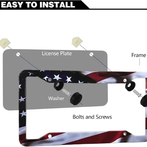 About this item A-201 ๐บ๐ธ AMERICAN FLAG PATRIOTIC CAR TAG FRAME: Anodized Aluminum Red American flag License Plate Frame with stainless steel license plate screws make sure the frame and your car/truck/tag plate will never rust,corrode. The USA Flag expresses your patriotism. Go, American! ๐บ๐ธ CUSTOMIZED STANDARD U.S. LICENSE PLATE DESIGN: The frame is designed for the 12*6 inch American standard license plate. The 4 thin edges will not block the registration sticker on the 4 corners of the metal license plate, which is legal street in most states. The unique national flag design makes the license plate cover more beautiful and COOL. ๐บ๐ธ EASY TO INSTALL: The 4 hole license plate frame is more secure, and there will be no abnormal noise during driving. The American flag car license plate frame includes accessories, nuts, anti-theft screws, and comes with installation hardware, including all accessories shown in the figure. The license plate frame is easy to install without any special tools. ๐บ๐ธ DURABLE PLATE FRAME: Crafted with high quality Aluminum, NOT cheap plastic, never rusted license plate frame. Sleek edge frame that won't wear car paint. Durable Anti-peel And Anti-aging, Corrosion Resistant Frames,Protection Clear Coat, Stunning Appearance With fabric like vivid floating flag Finish, Never Broken. ๐บ๐ธ PURCHASE WITH CONFIDENCE: Please pay attention!! Please identify the original LIN KANG American flag license plate frame to ensure product quality assurance and experience. You are backed by a 90-Day warranty since the purchase date, feel free to send an email if thereโs an issue, the solution will be offered once details are confirmed.