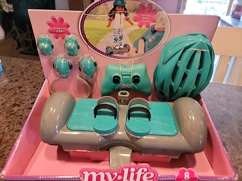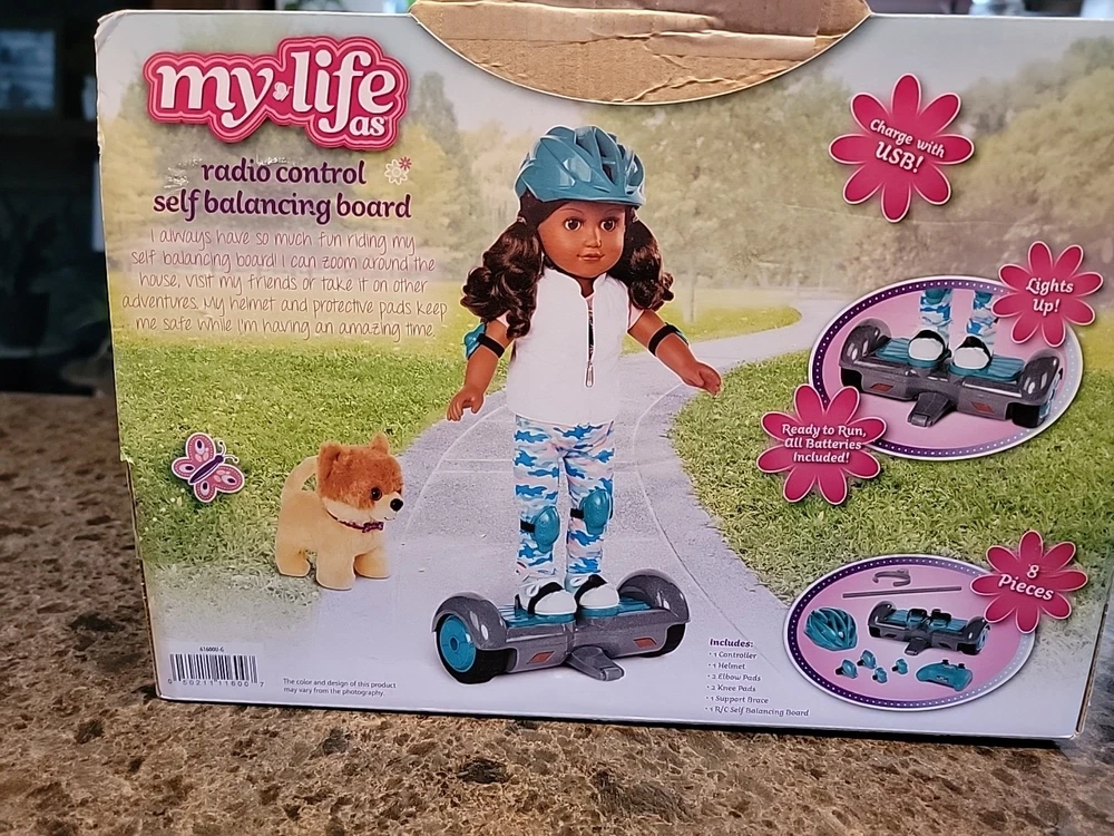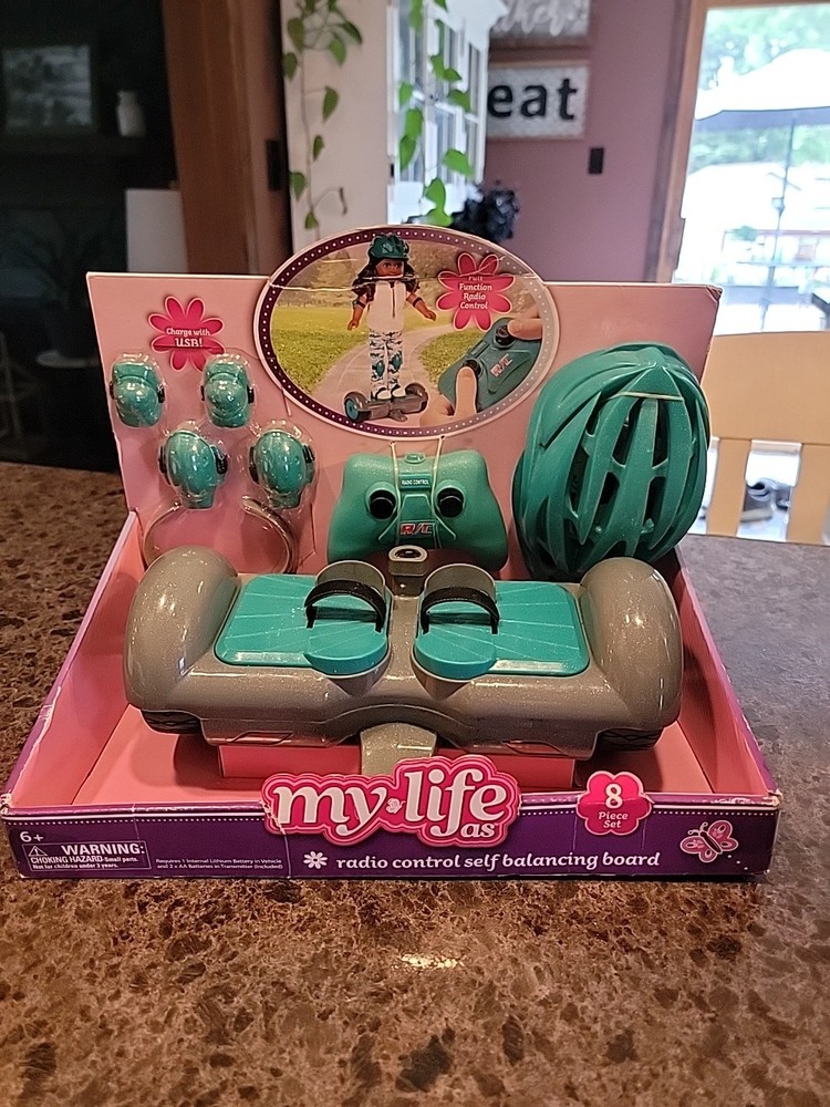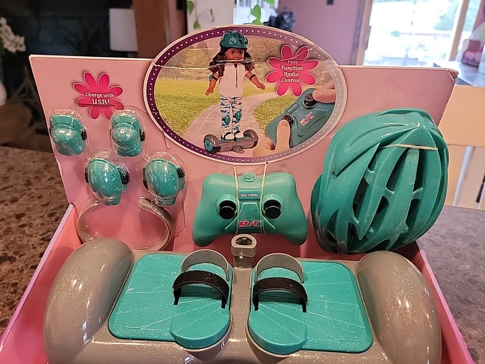 The product is an 18" hoverboard specifically designed for 18" American Girl dolls, part of the My Life As brand. It features interactive and battery-operated functions, making it an exciting accessory for doll play. This unique toy allows kids to transport their dolls around in style, adding a fun and modern element to imaginative play scenarios. Made of plastic and measuring 18 inches in width, this hoverboard is a part of a set that includes the transporter and is suitable for various age levels, from toddlers to teens. Perfect for young American Girl enthusiasts looking to expand their playtime with interactive accessories.