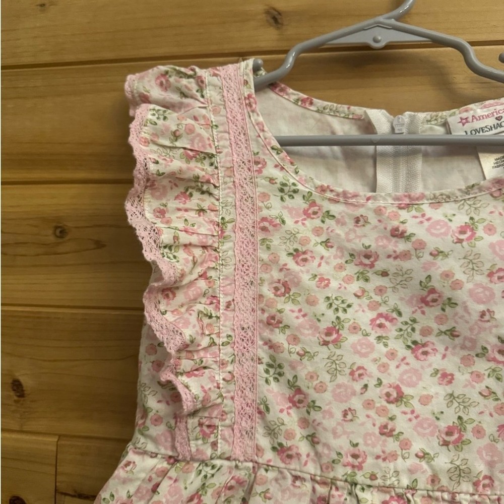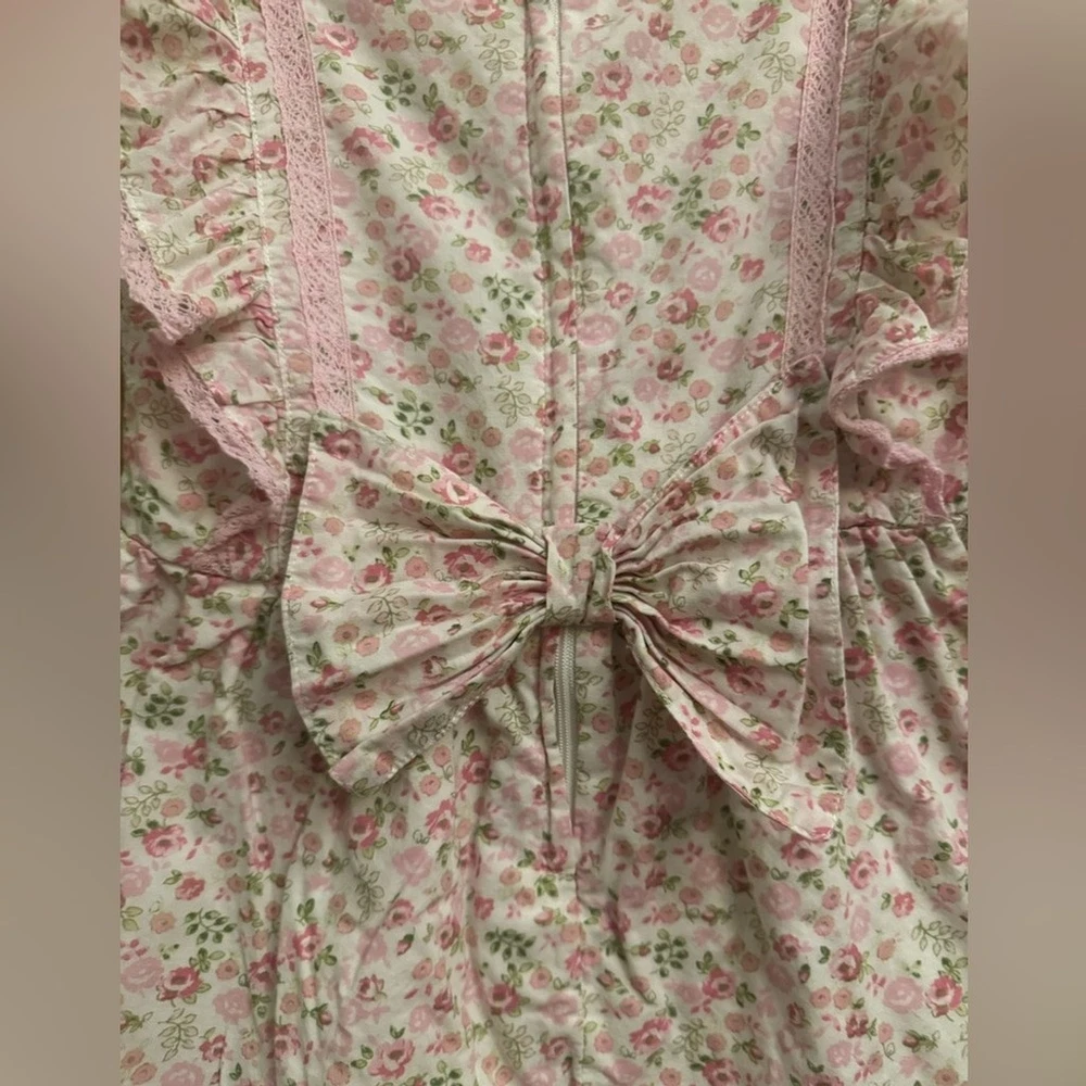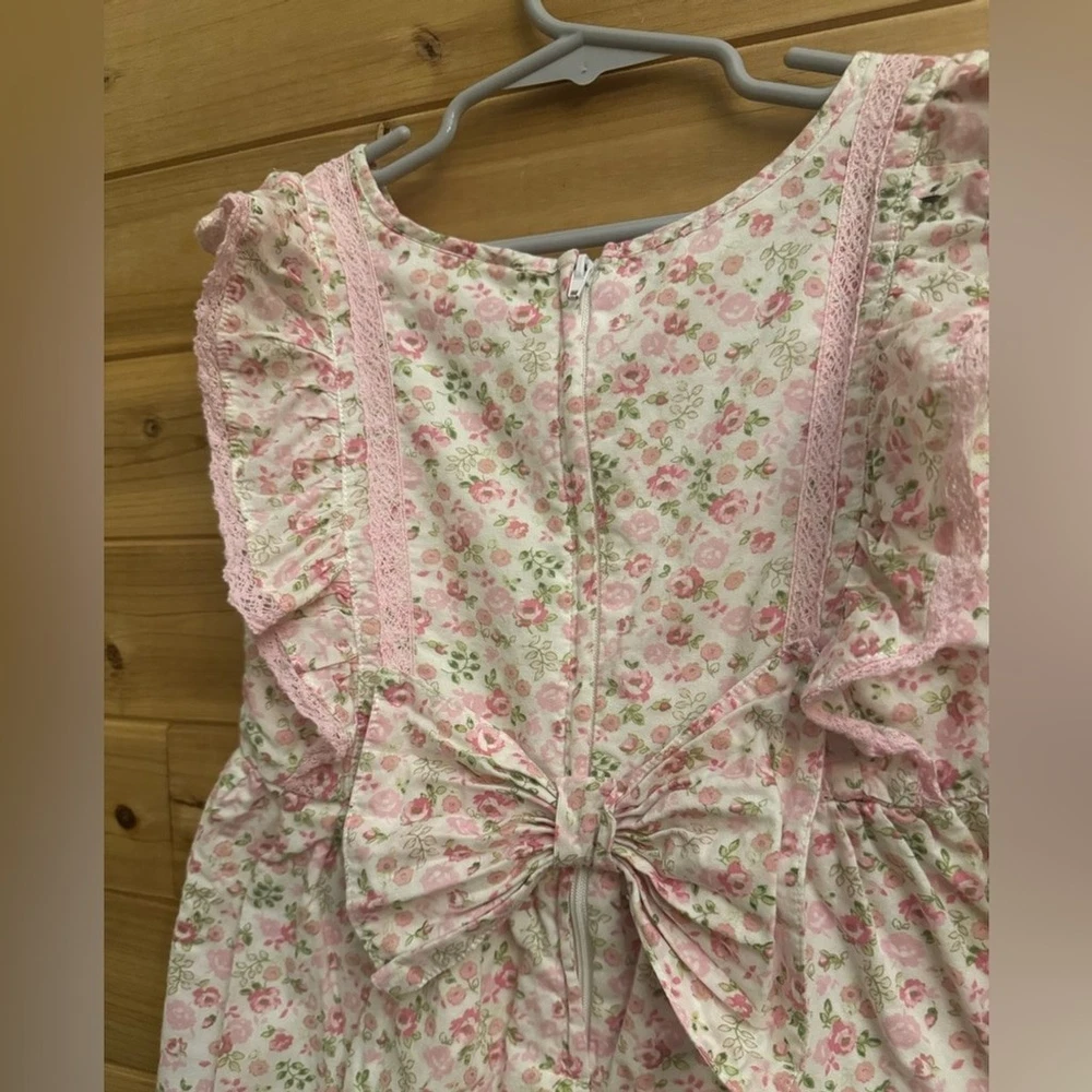 Pink Floral Print Ruffle Short Sleeve Cotton Dress With Bow Details On Back & Zipper Closure Materials: 100% Cotton Measurements In Inches: Pit To Pit: 12 Length: 22